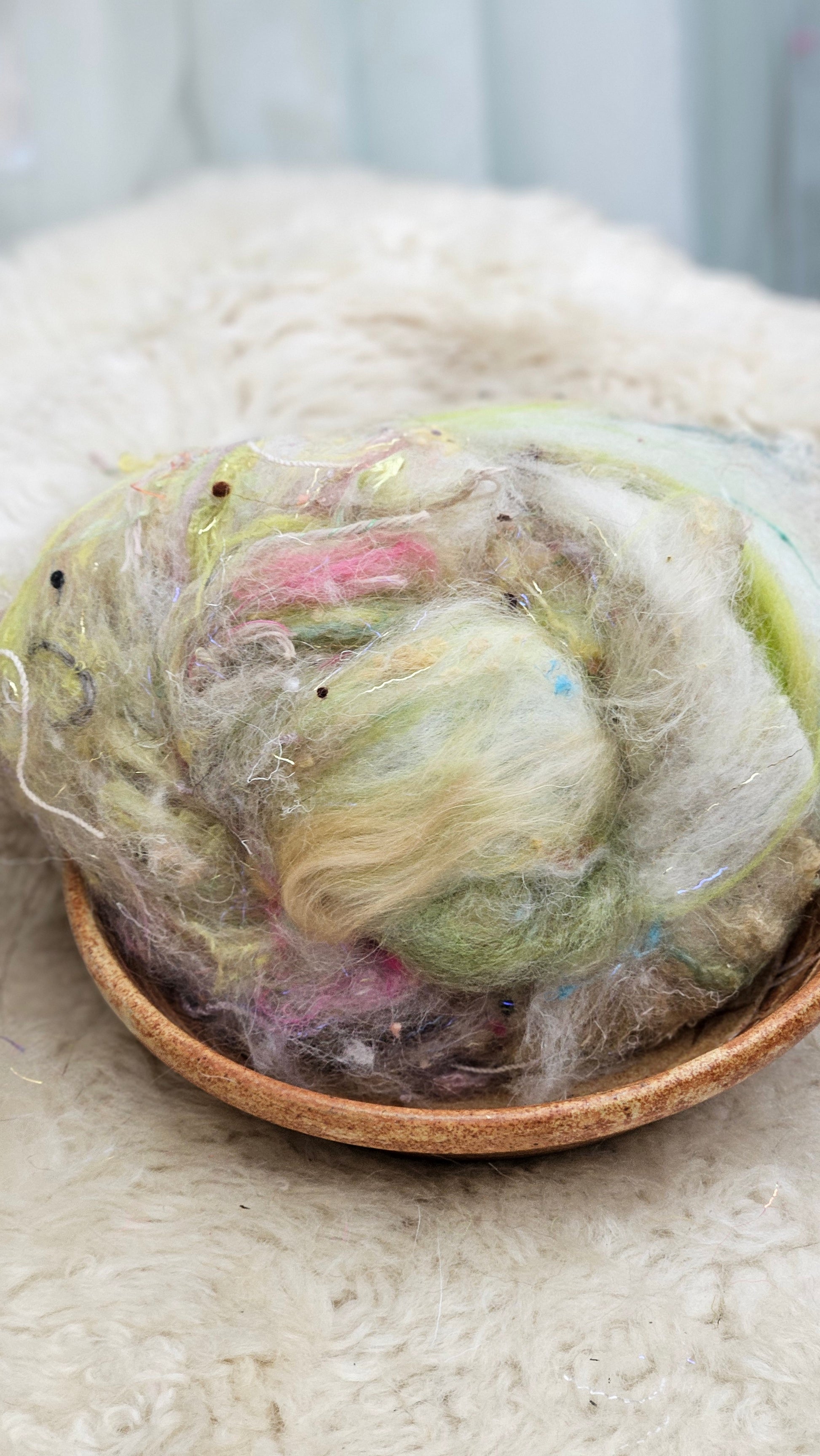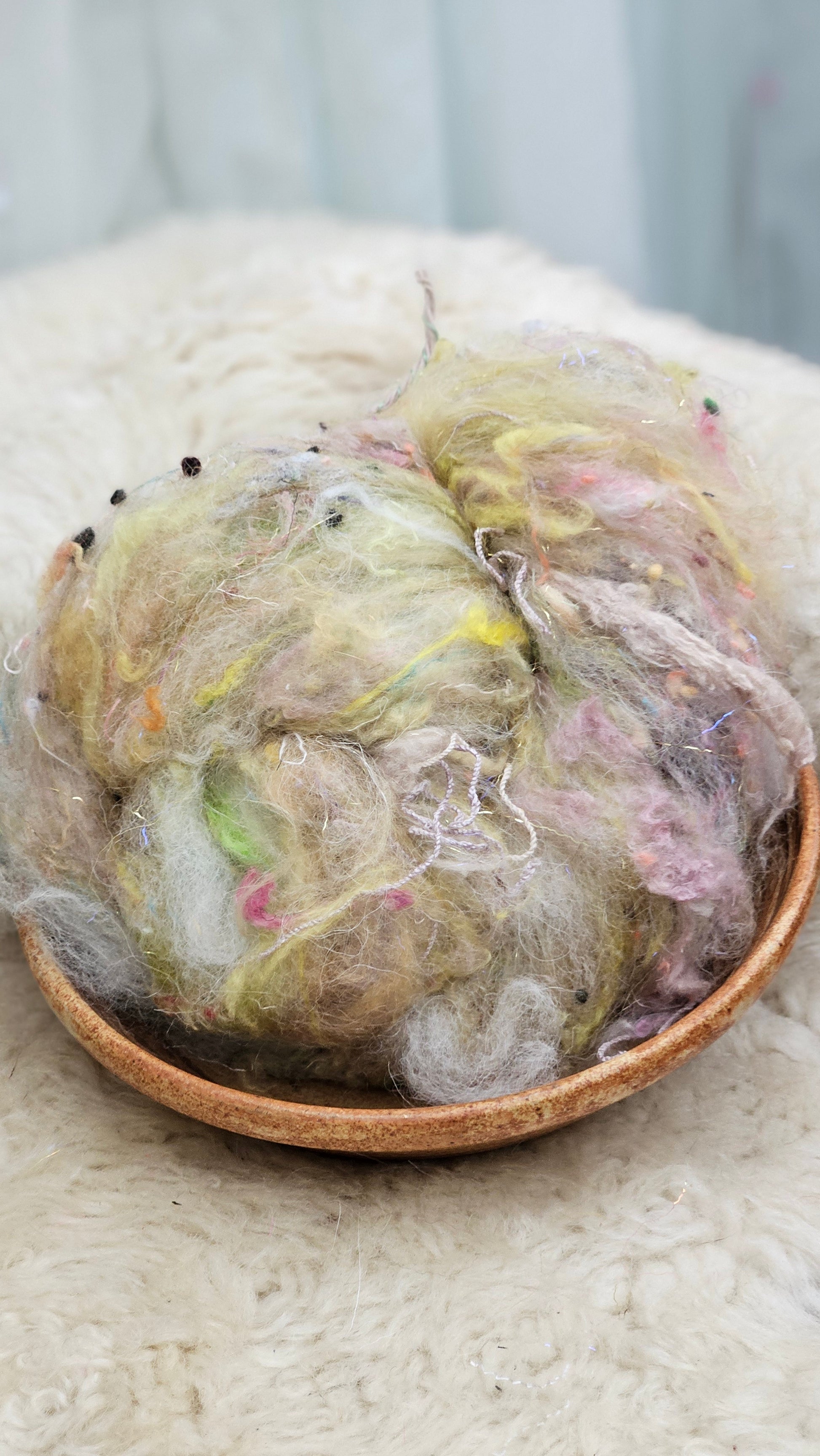 Some trace lanolin may be present in some batts due to the nature of the fine wool used in the base. Ideal for spinning art yarn especially and including corespinning.