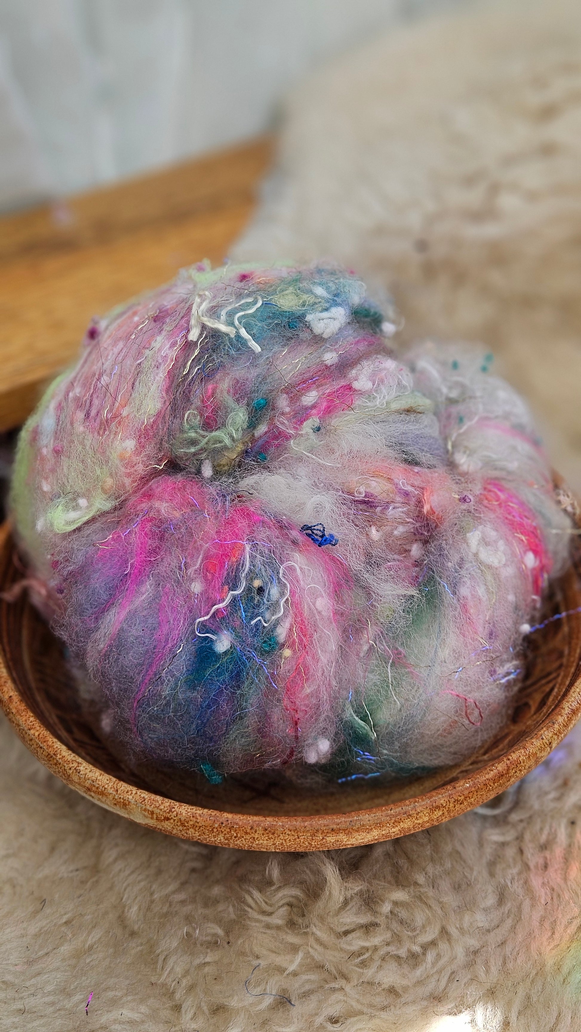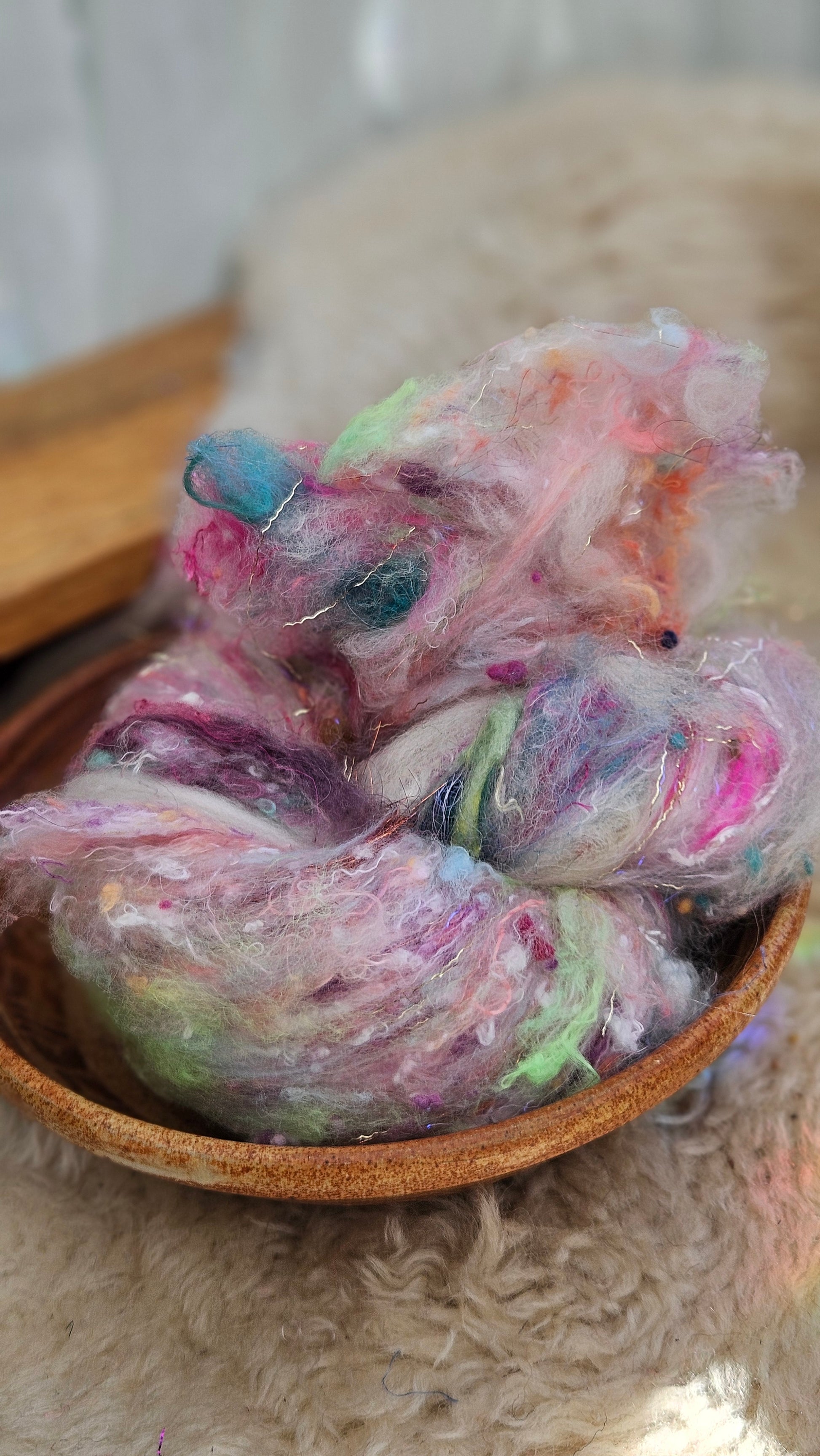 Some trace lanolin may be present in some batts due to the nature of the fine wool used in the base. Ideal for spinning art yarn especially and including corespinning.