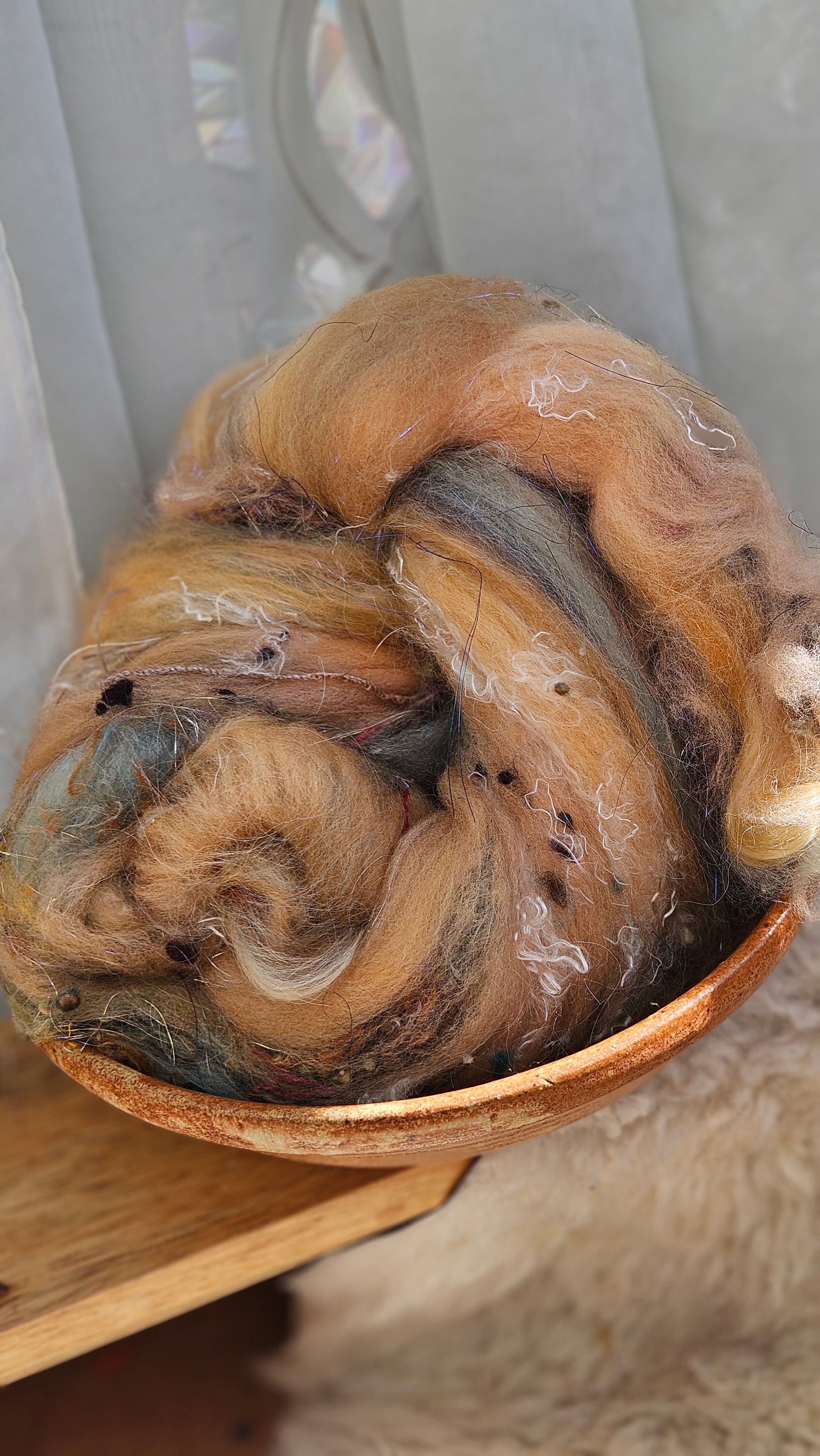Some trace lanolin may be present in some batts due to the nature of the fine wool used in the base. Ideal for spinning art yarn especially and including corespinning.