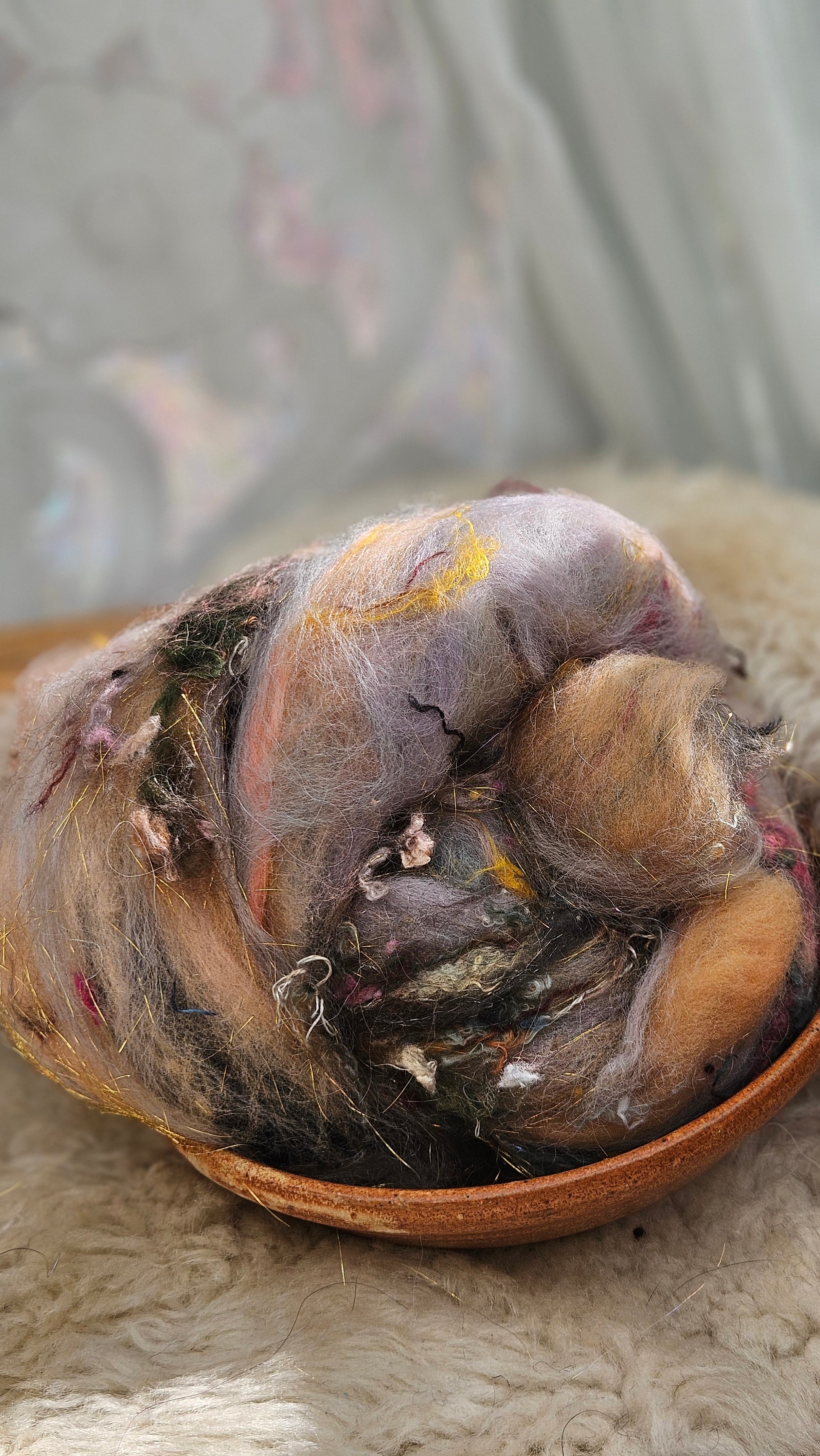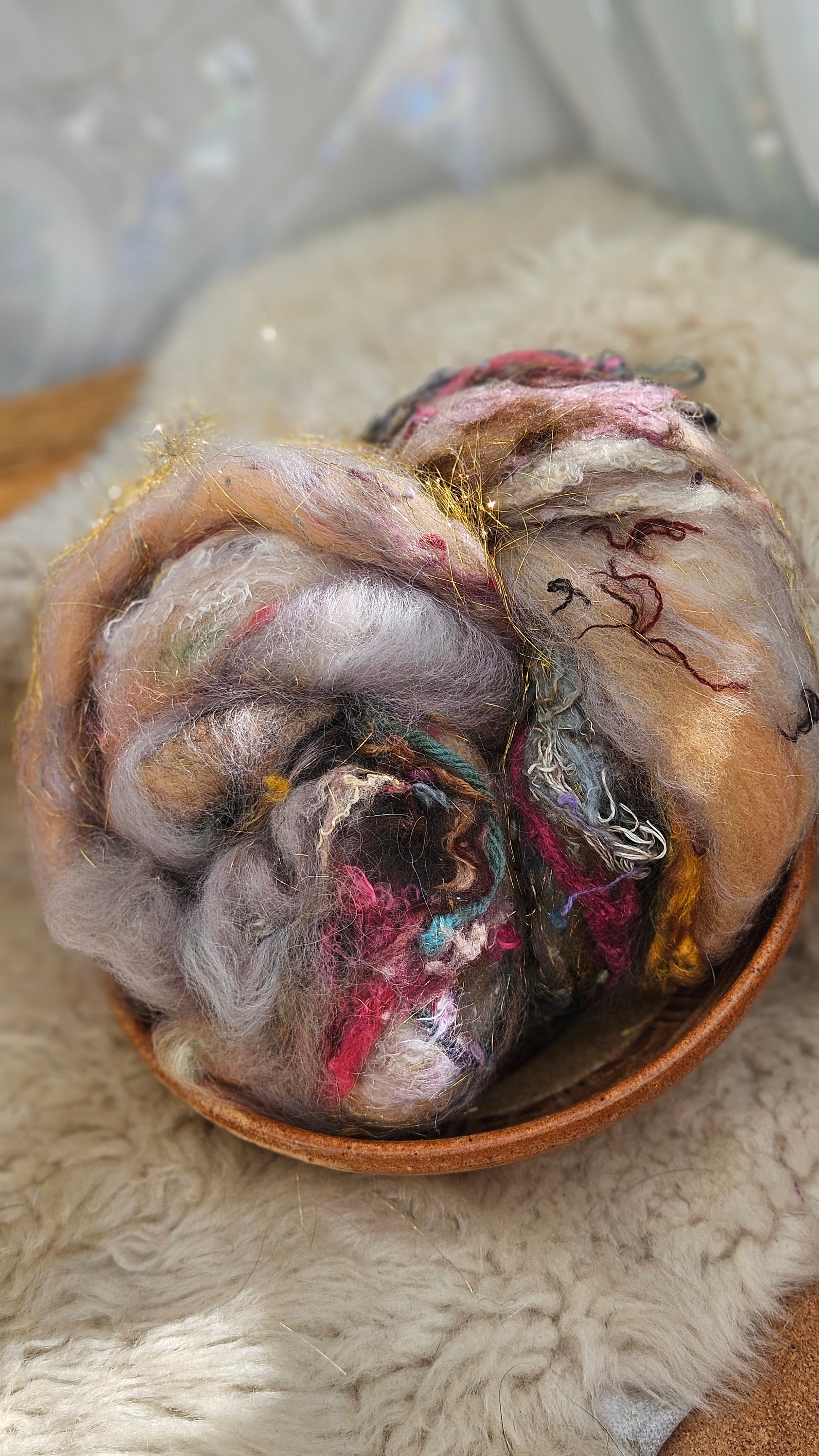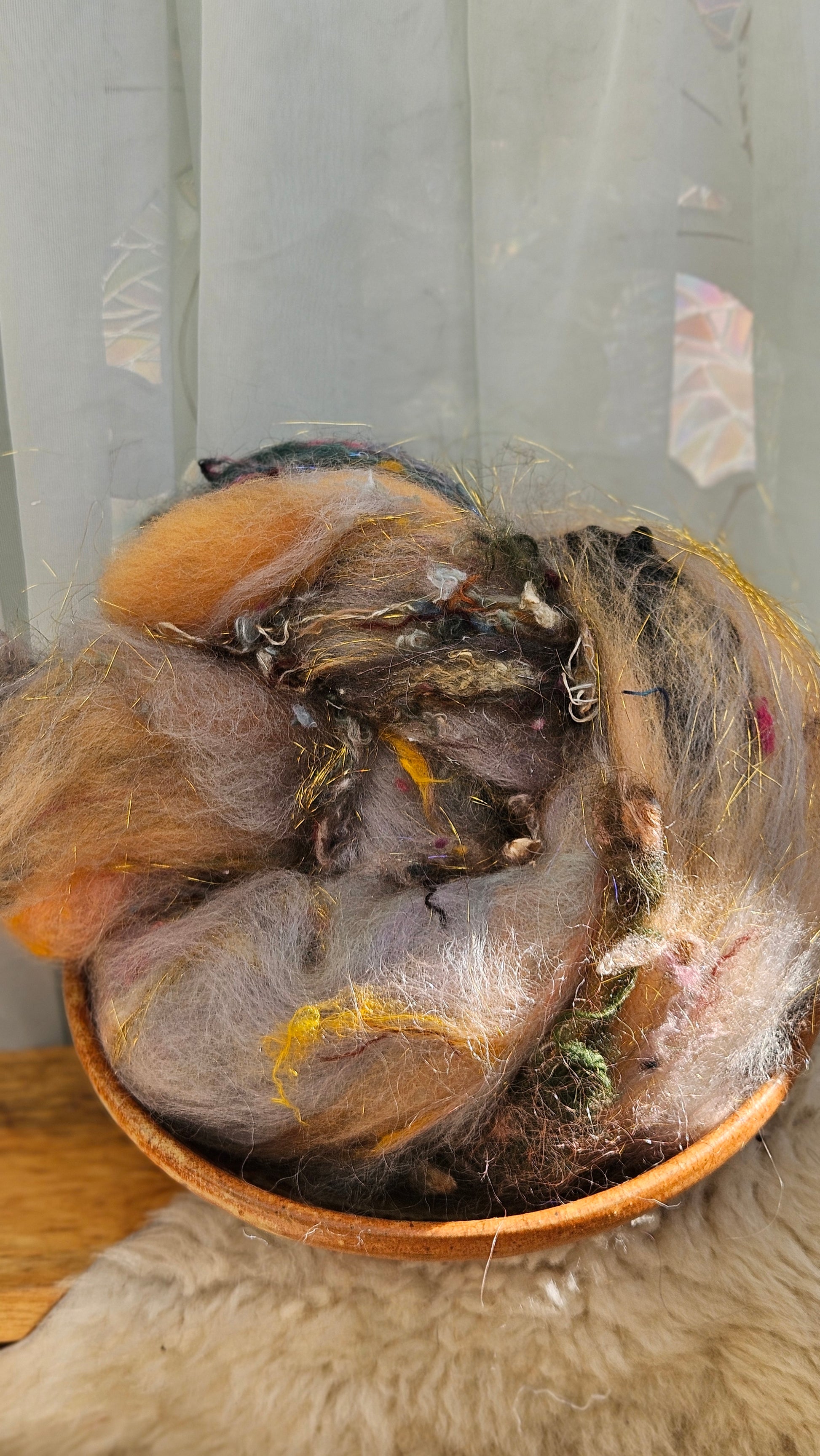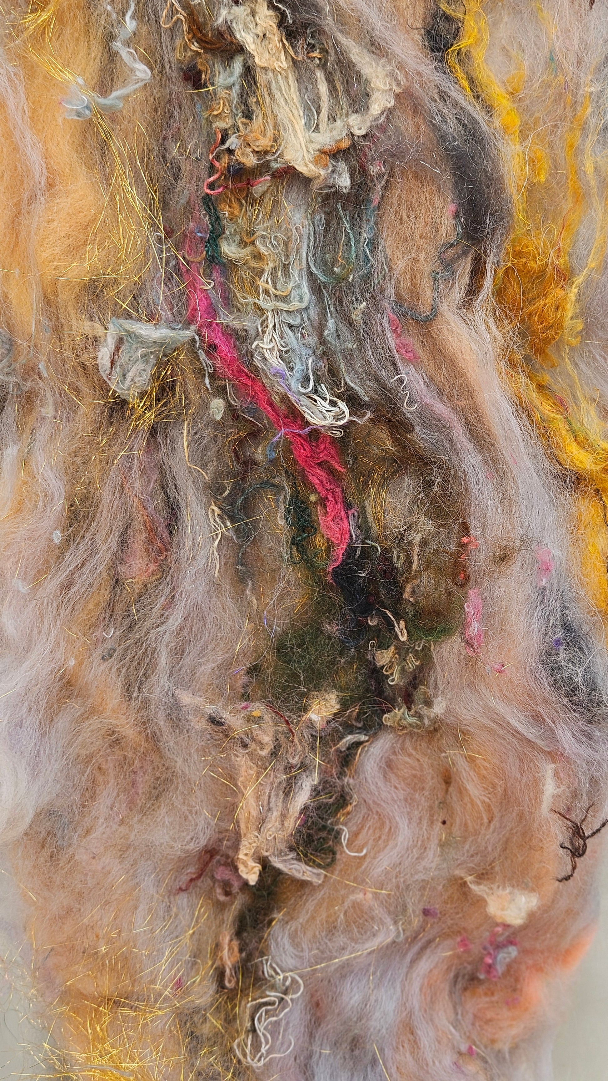 Some trace lanolin may be present in some batts due to the nature of the fine wool used in the base. Ideal for spinning art yarn especially and including corespinning.