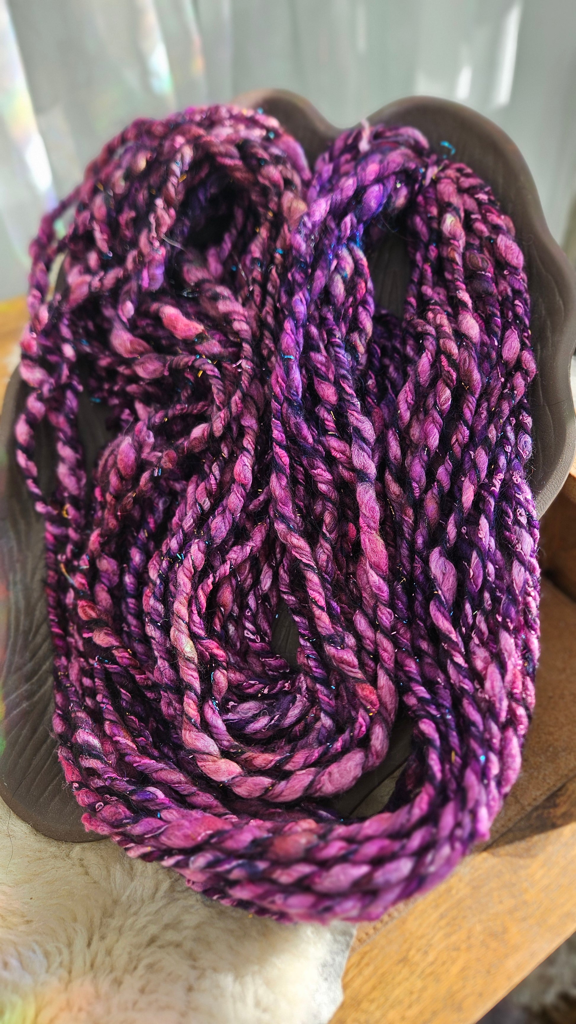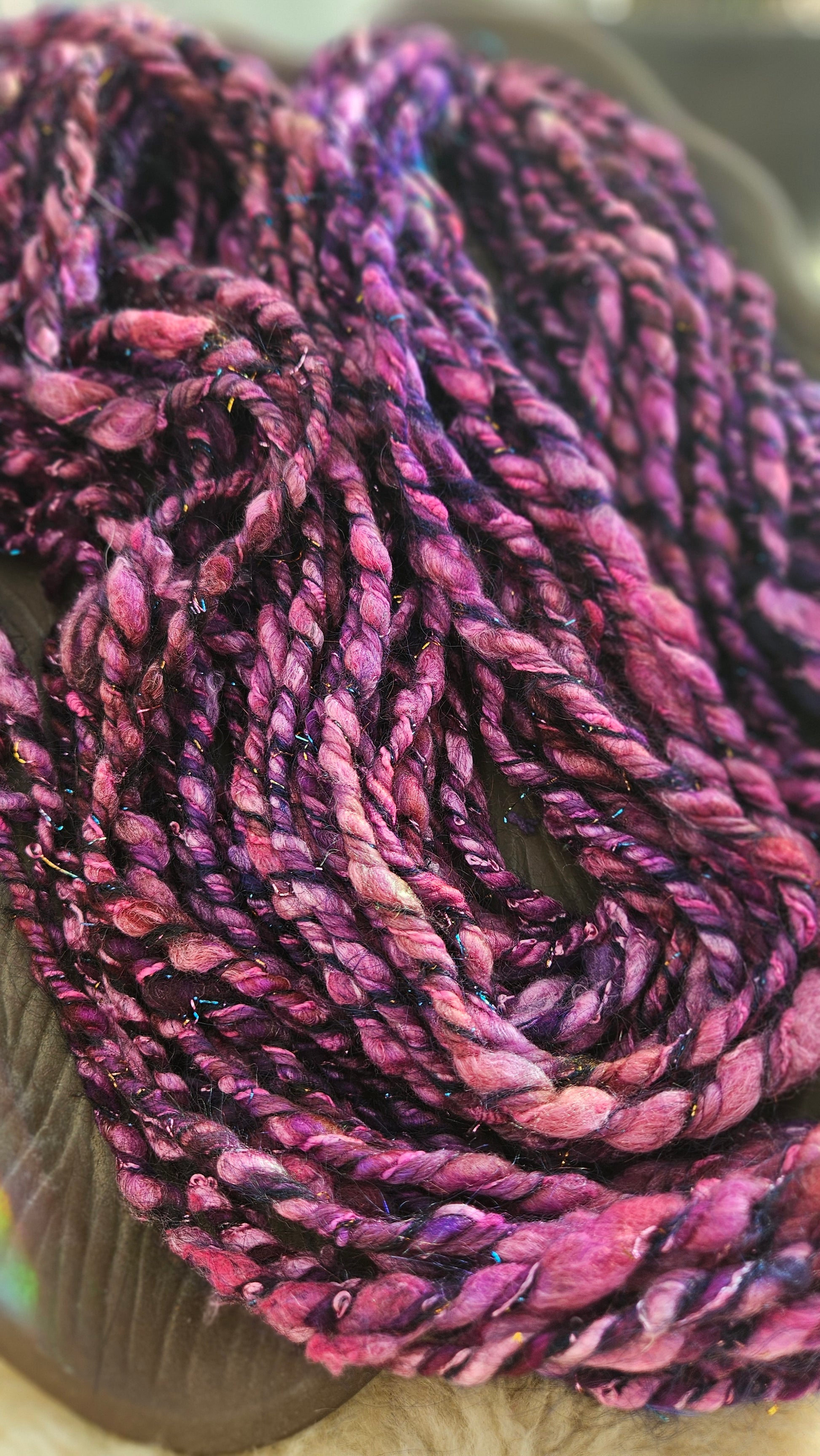 - Technique: Hand-dyed, hand-carded, hand-spun, and plied with thread. Finished in Unicorn Fibre Rinse.