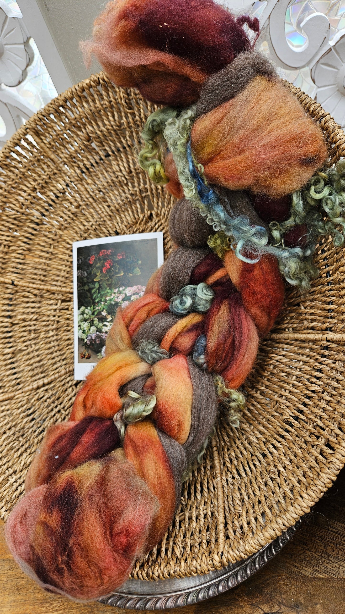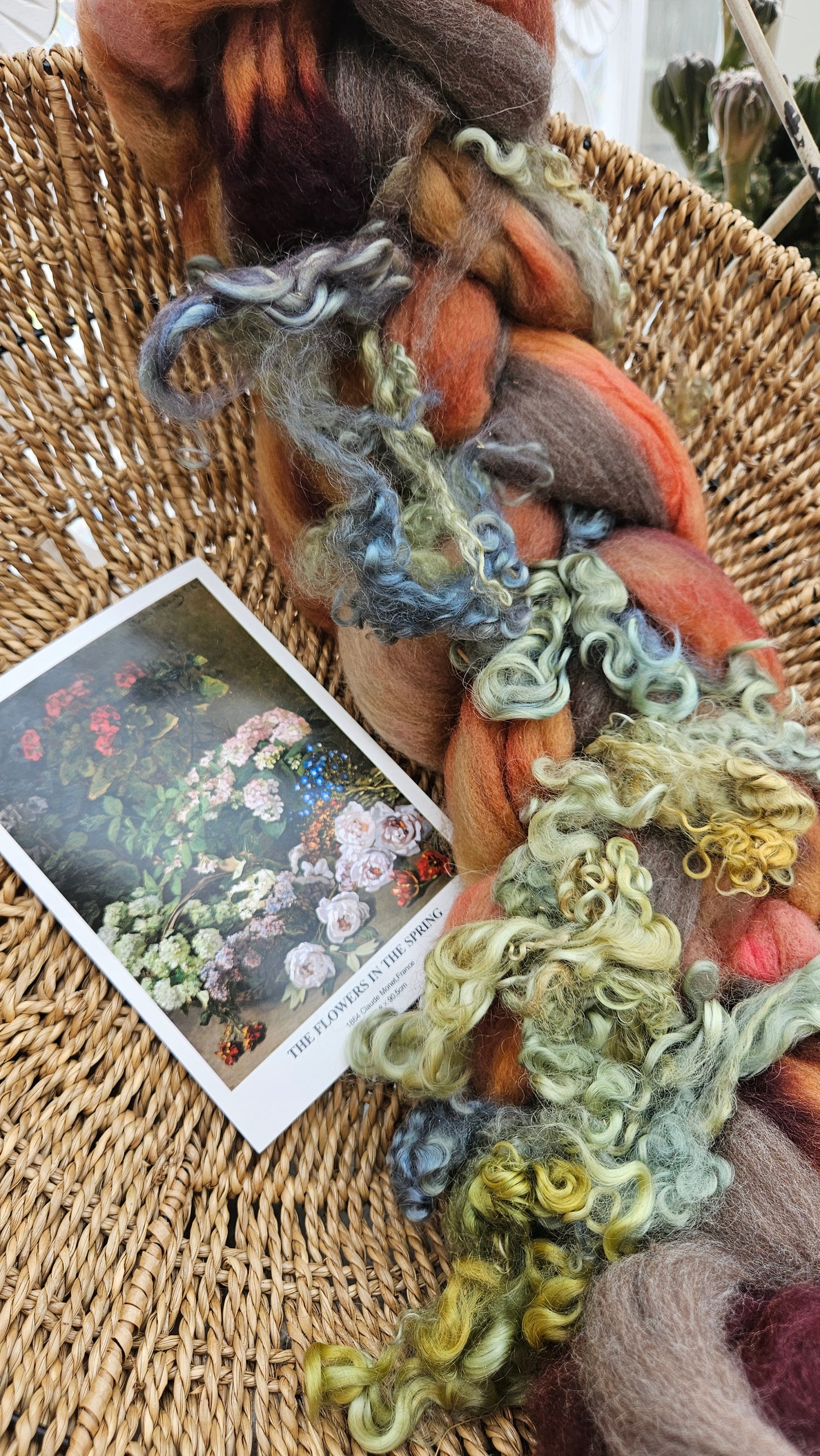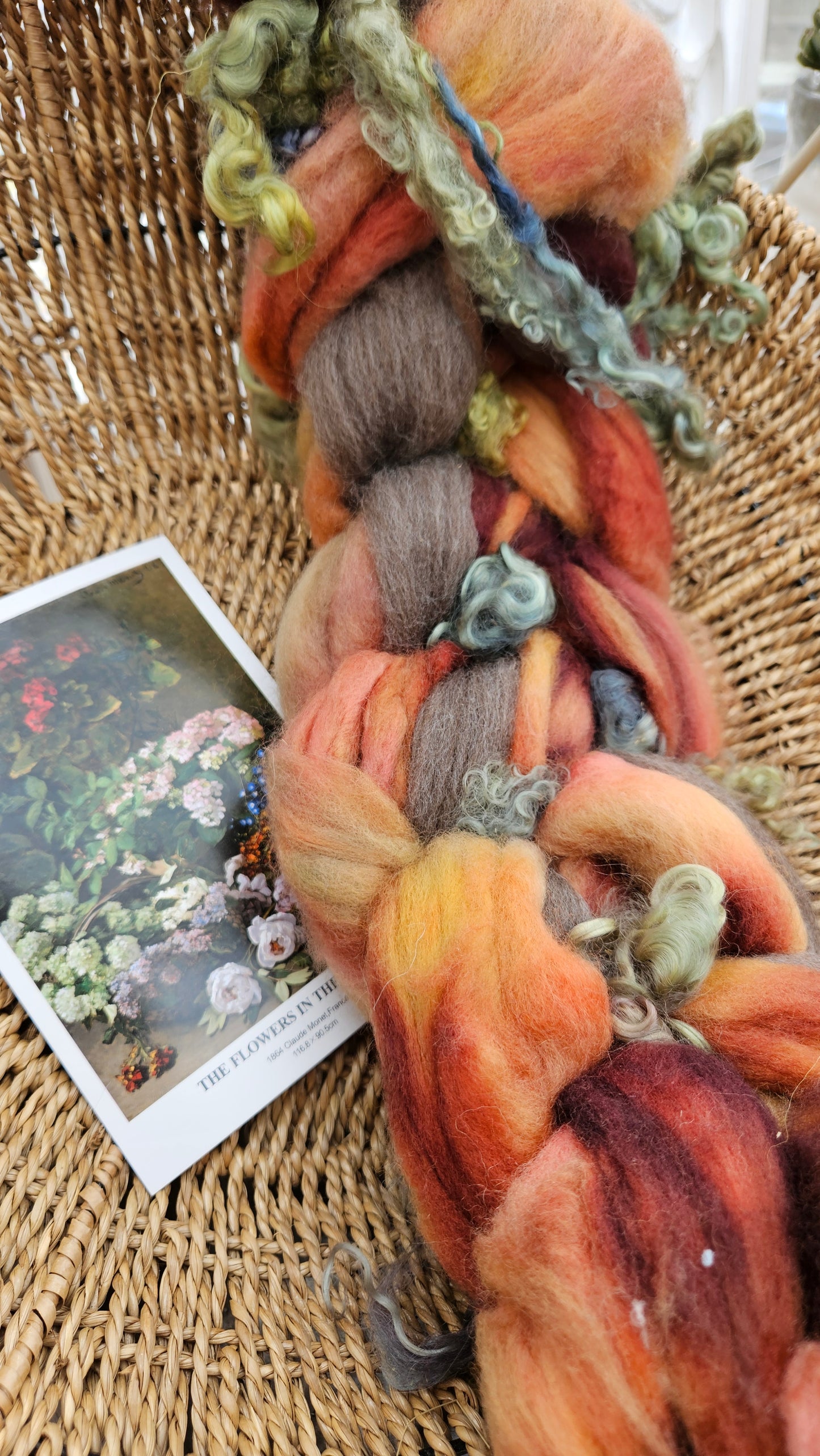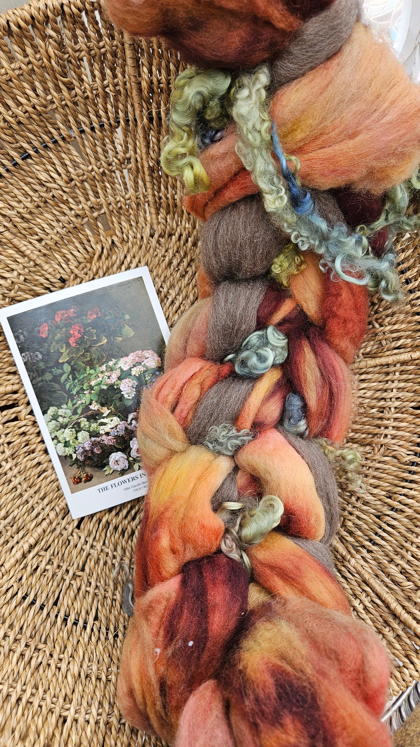 Inspired by the impressionist paintings of Monet using his timeless fine art colorway pallete. Each wool roving braid includes multiple breeds and textures of high quality fiber for blending and carding into art batts or spinning into yarn directly from the braid.
