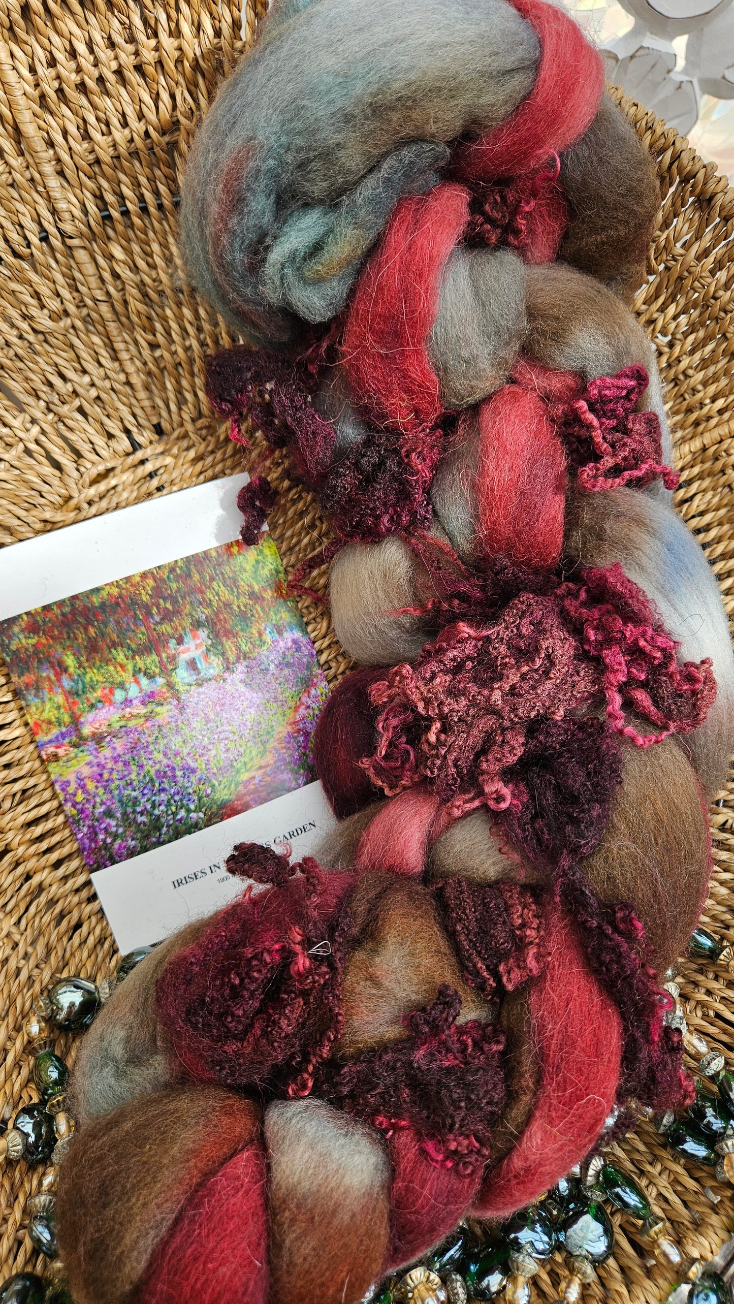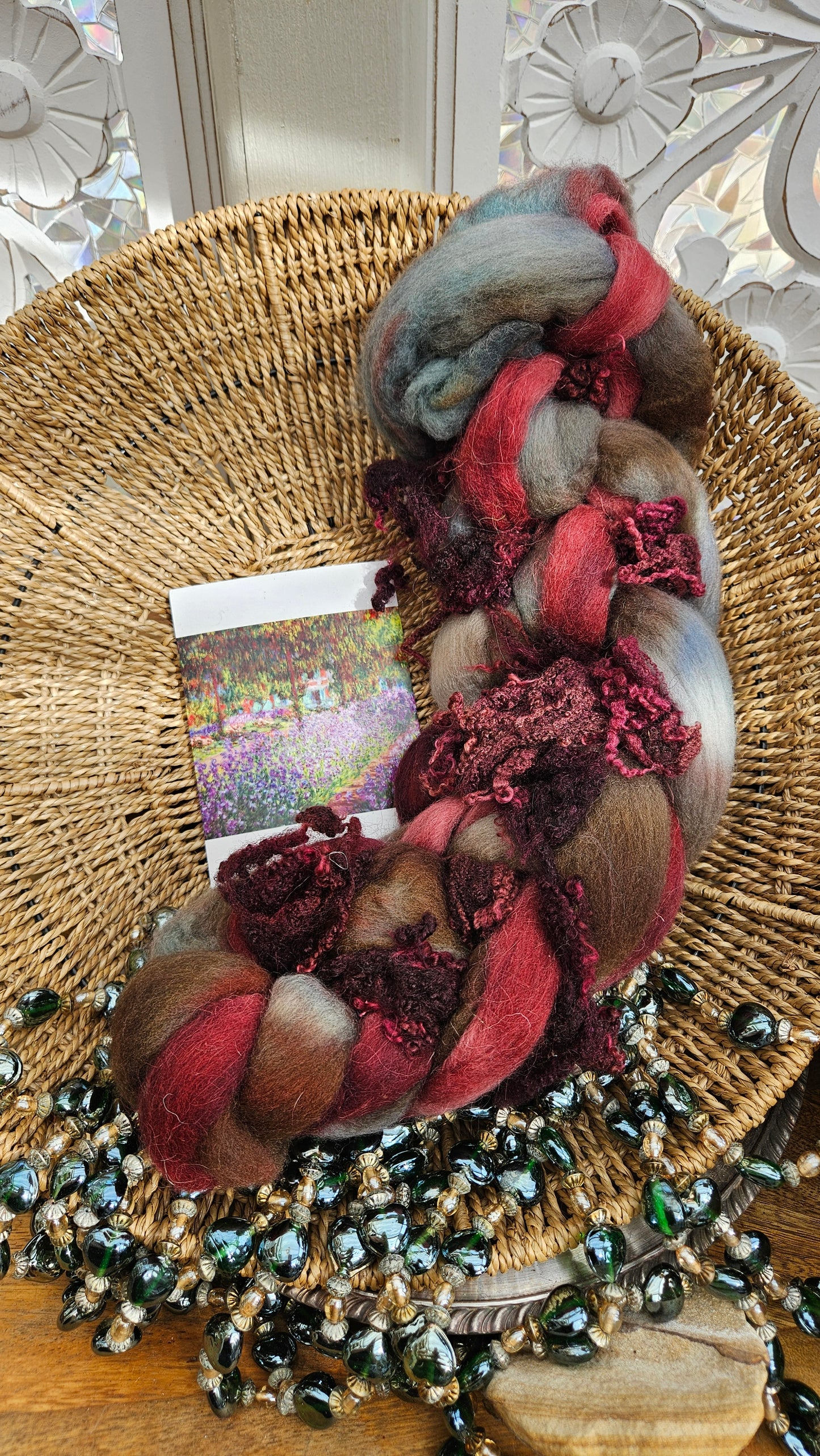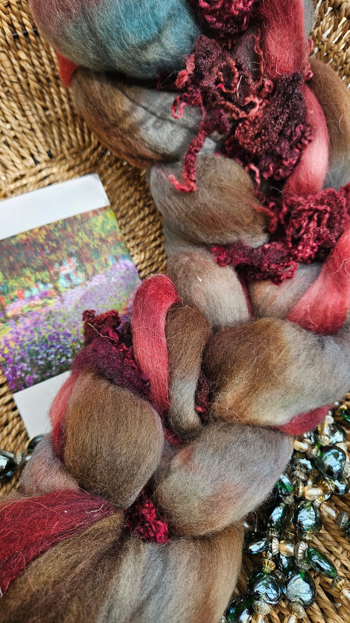 Inspired by the impressionist paintings of Monet using his timeless fine art colorway pallete. Each wool roving braid includes multiple breeds and textures of high quality fiber for blending and carding into art batts or spinning into yarn directly from the braid.