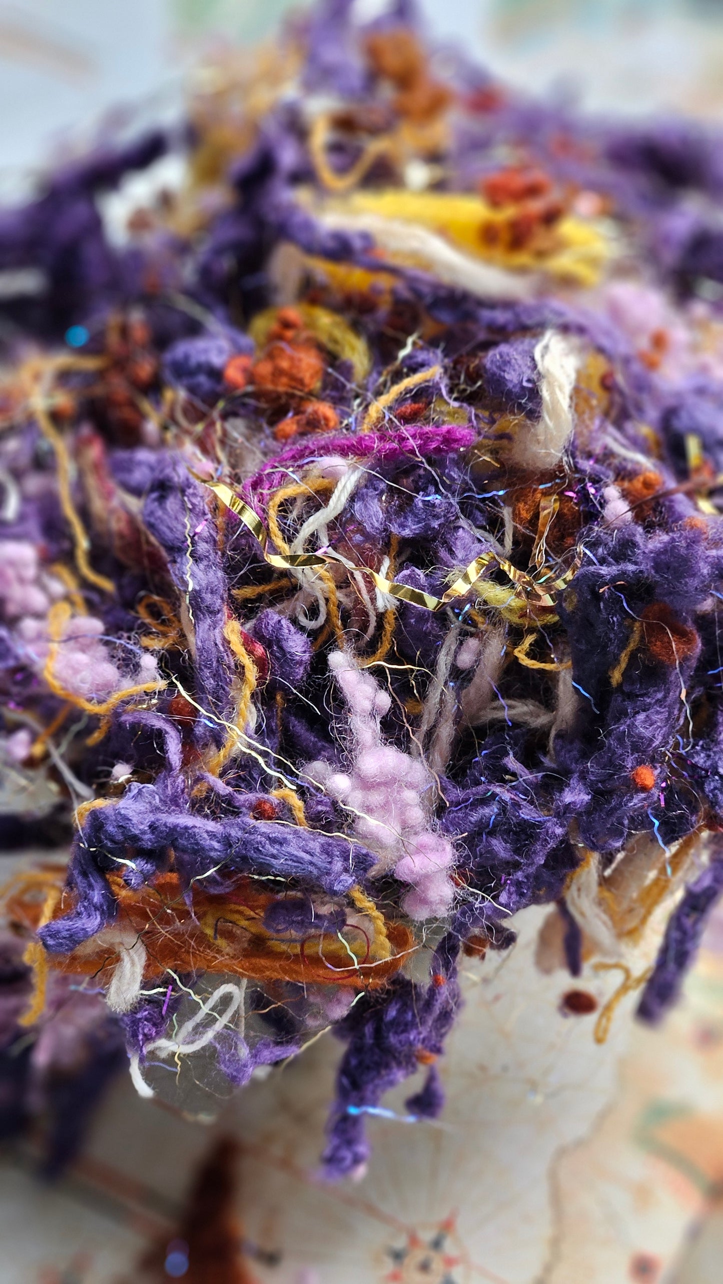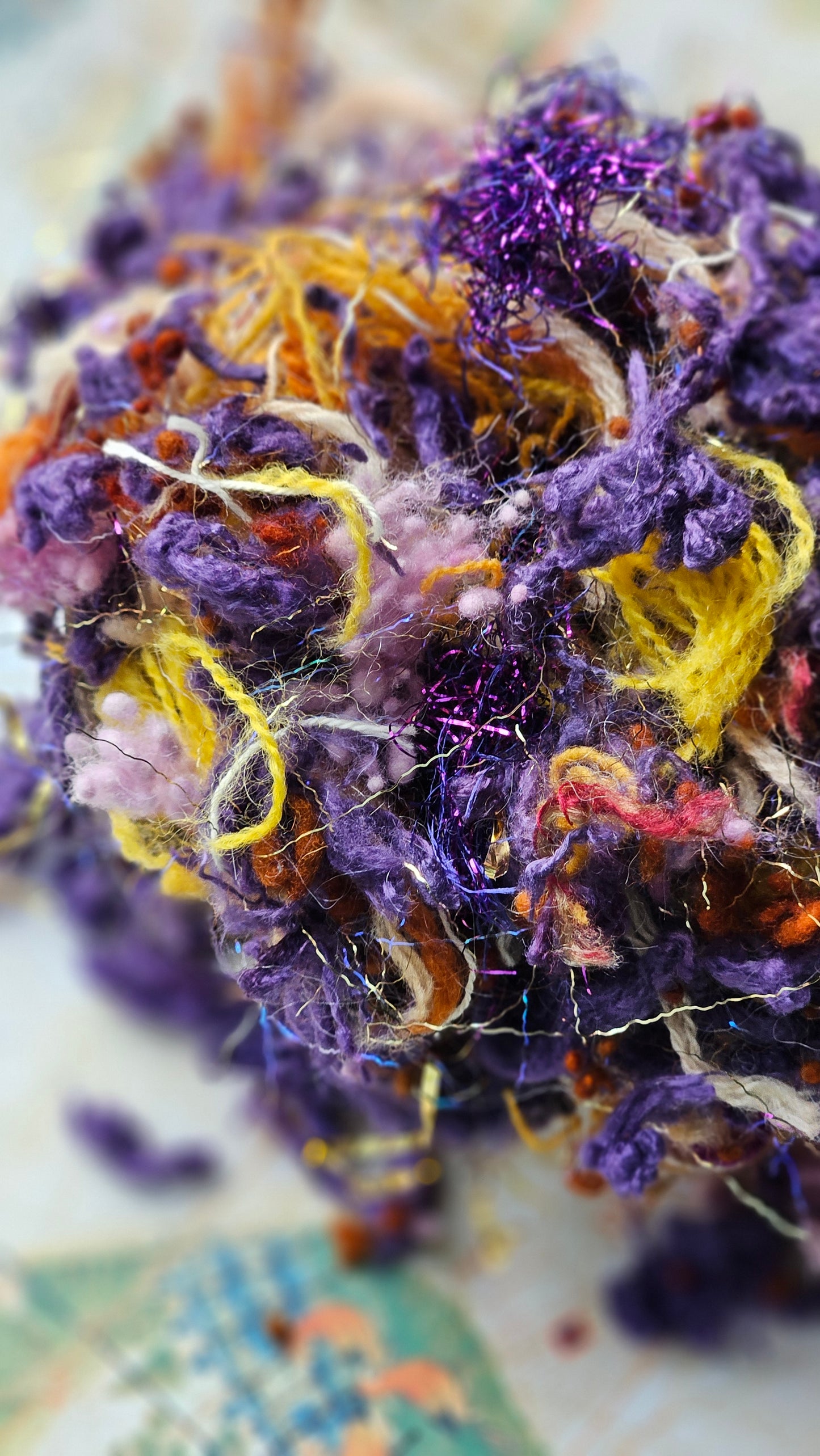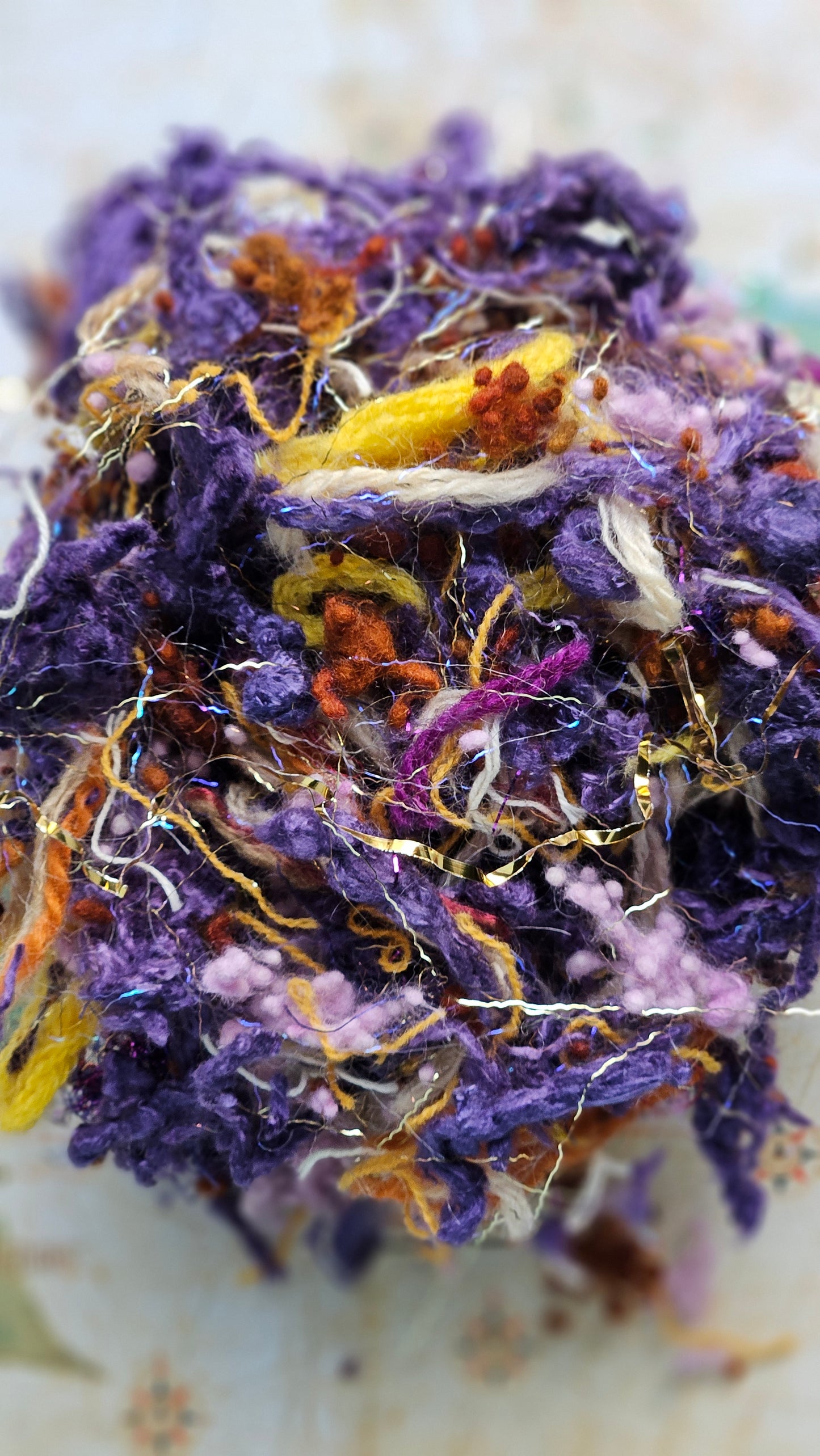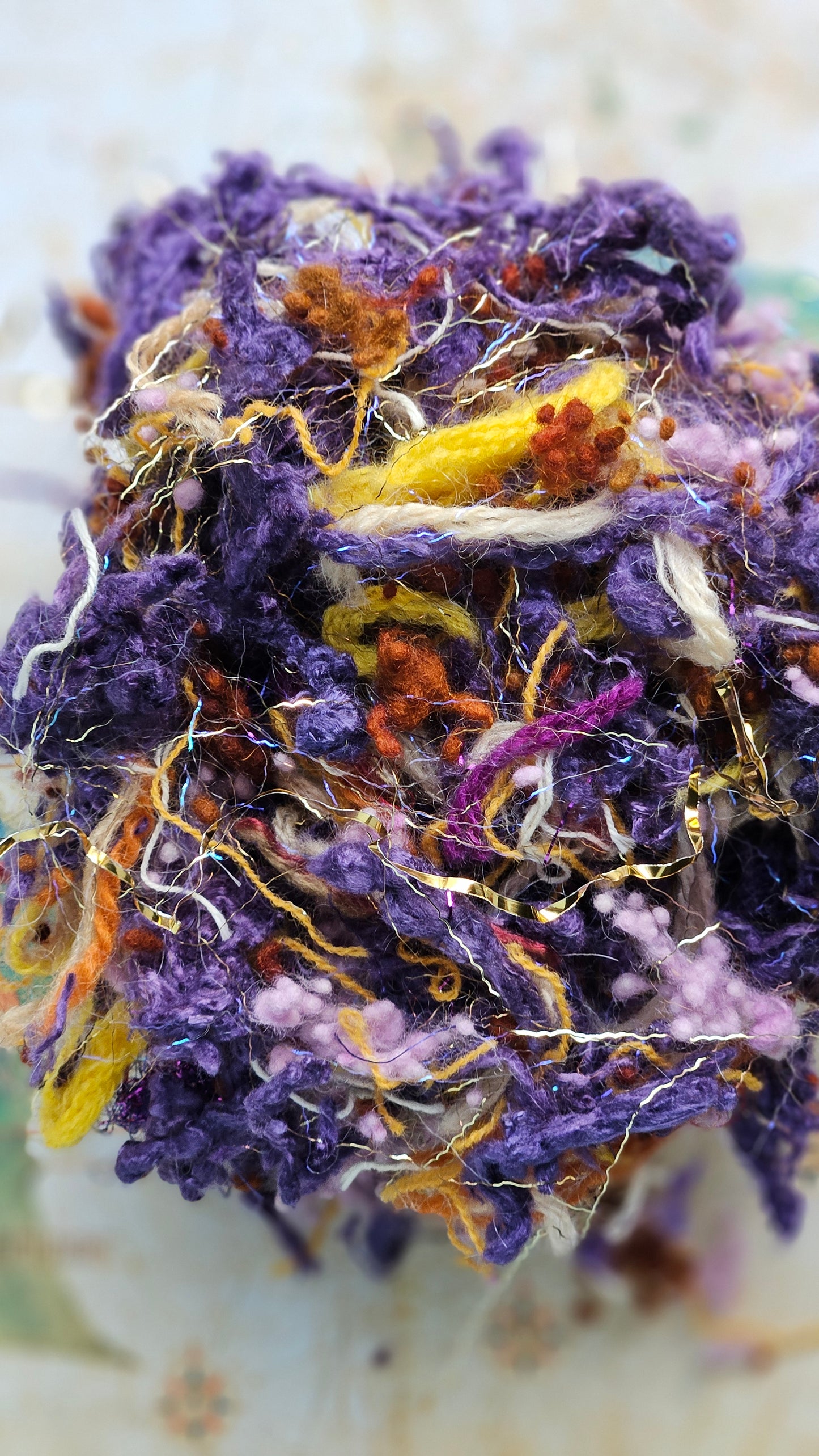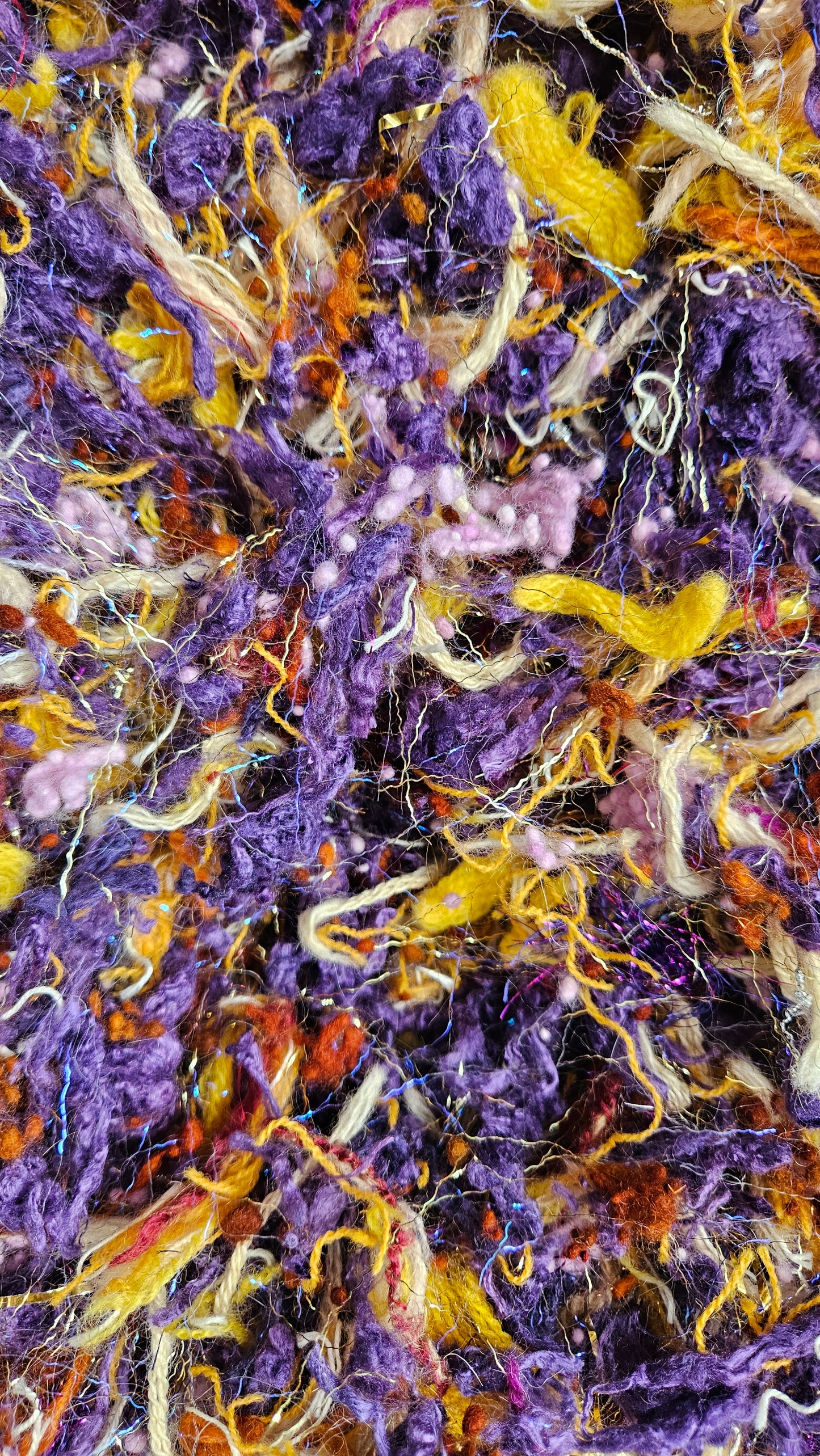 Rich royal-purple bamboo nubs with sparkle, blended with fine wool nepps and recycled hand-cut wool threads for irresistible texture.