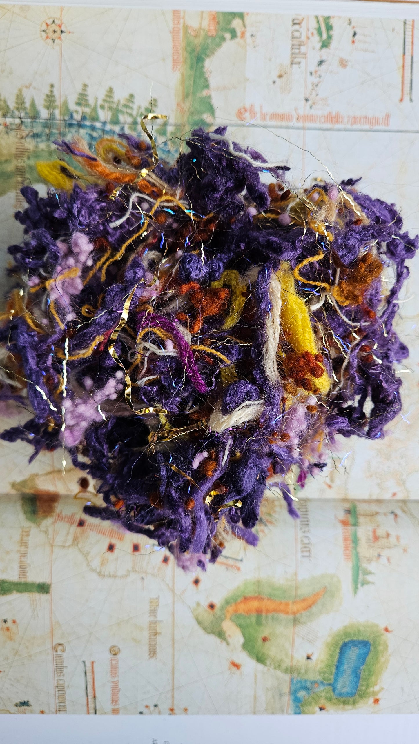 The vibrant purple hand-cut bamboo in this collection (inspired by the royal garments and tapestries of ancient civilizations) takes center stage, bringing deep color and a touch of sheen to your spinning, felting, and fiber art. The wool nepps - a zero waste recycled fiber of the wool industry - adds playful, bumpy “polka-dot” texture.