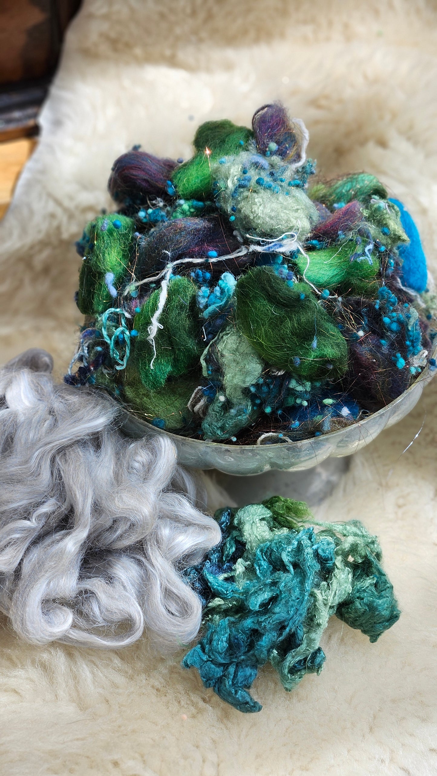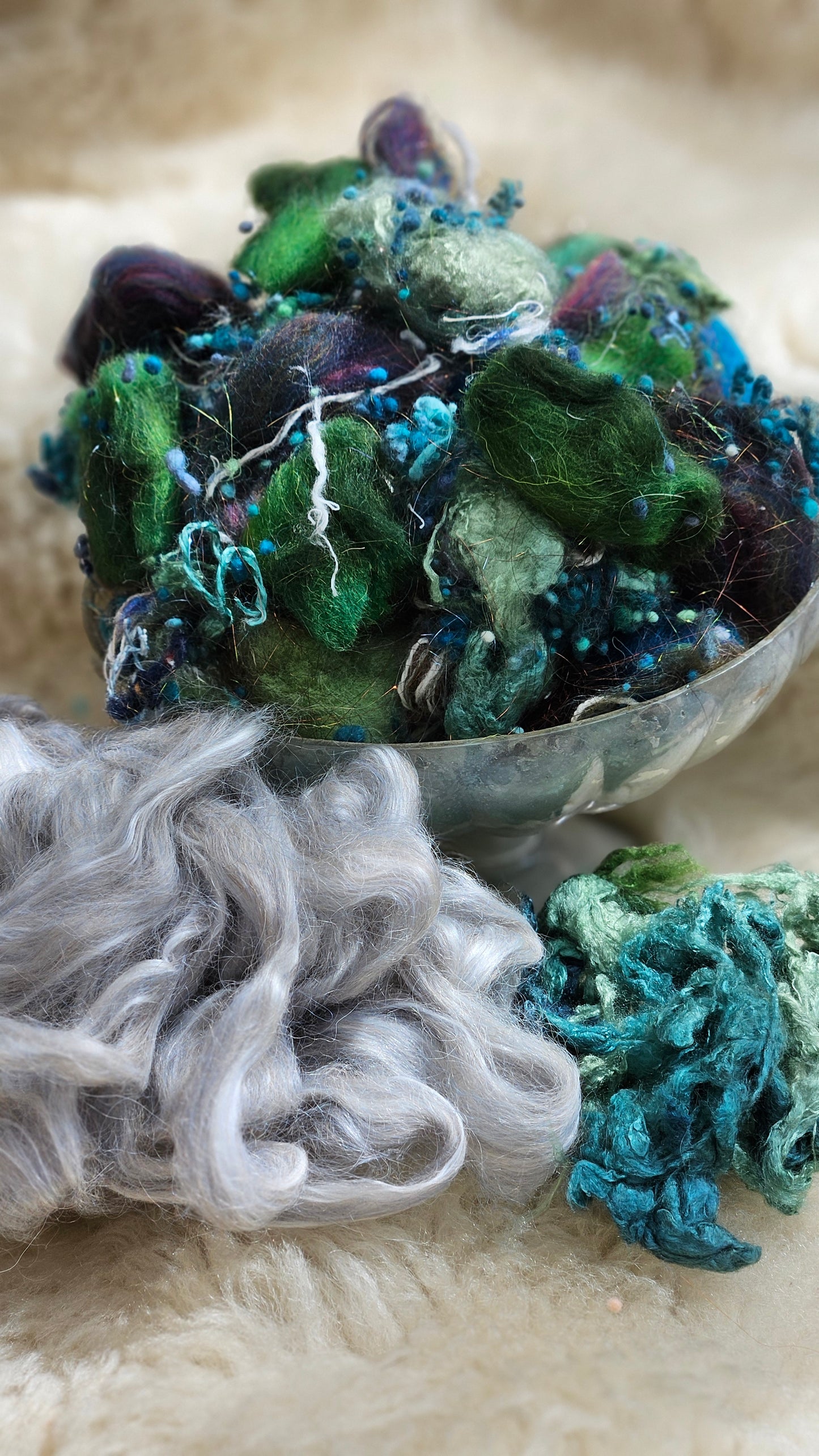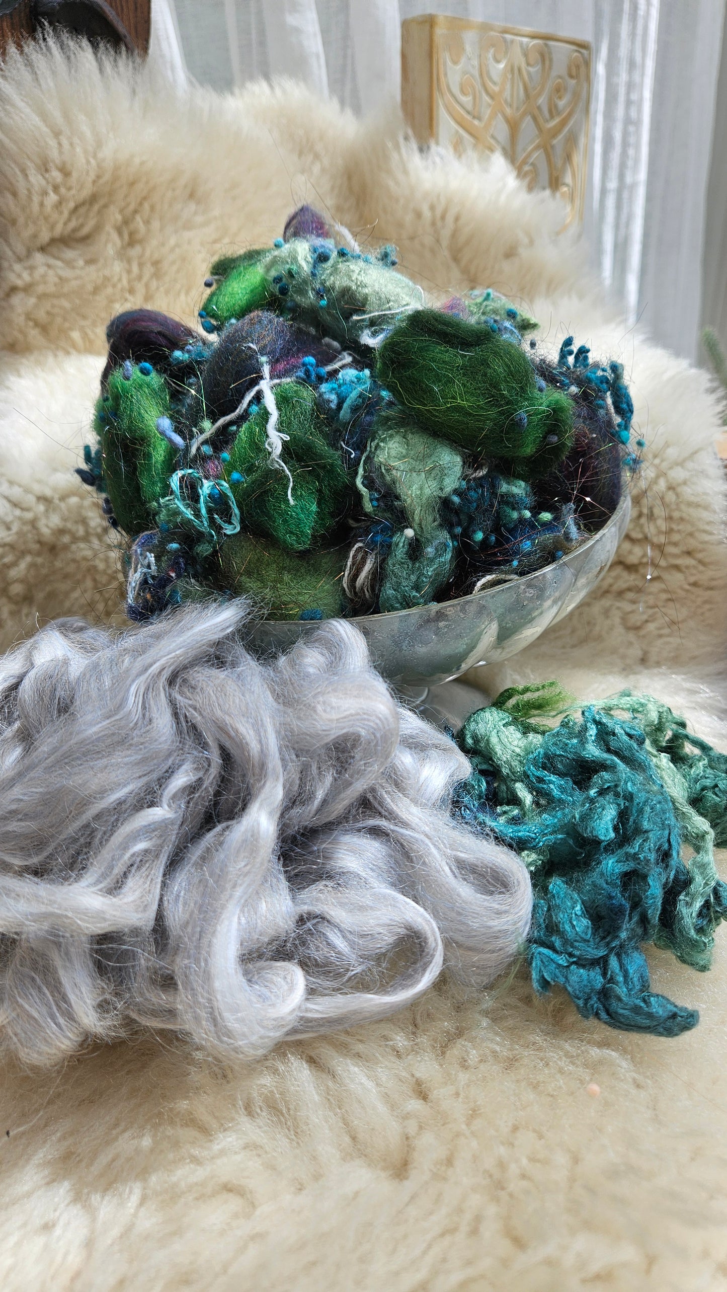 A 2.5 ounce kit of fine art inspired extra chunky wool texture and fiber for creating art batts, rolags, and blends to spin into yarn for knitting, weaving, crochet, felting, and fiber art. A little can go a long way! Each bag is subtly different due to the size of the texture and nuance in the dyed bits.
