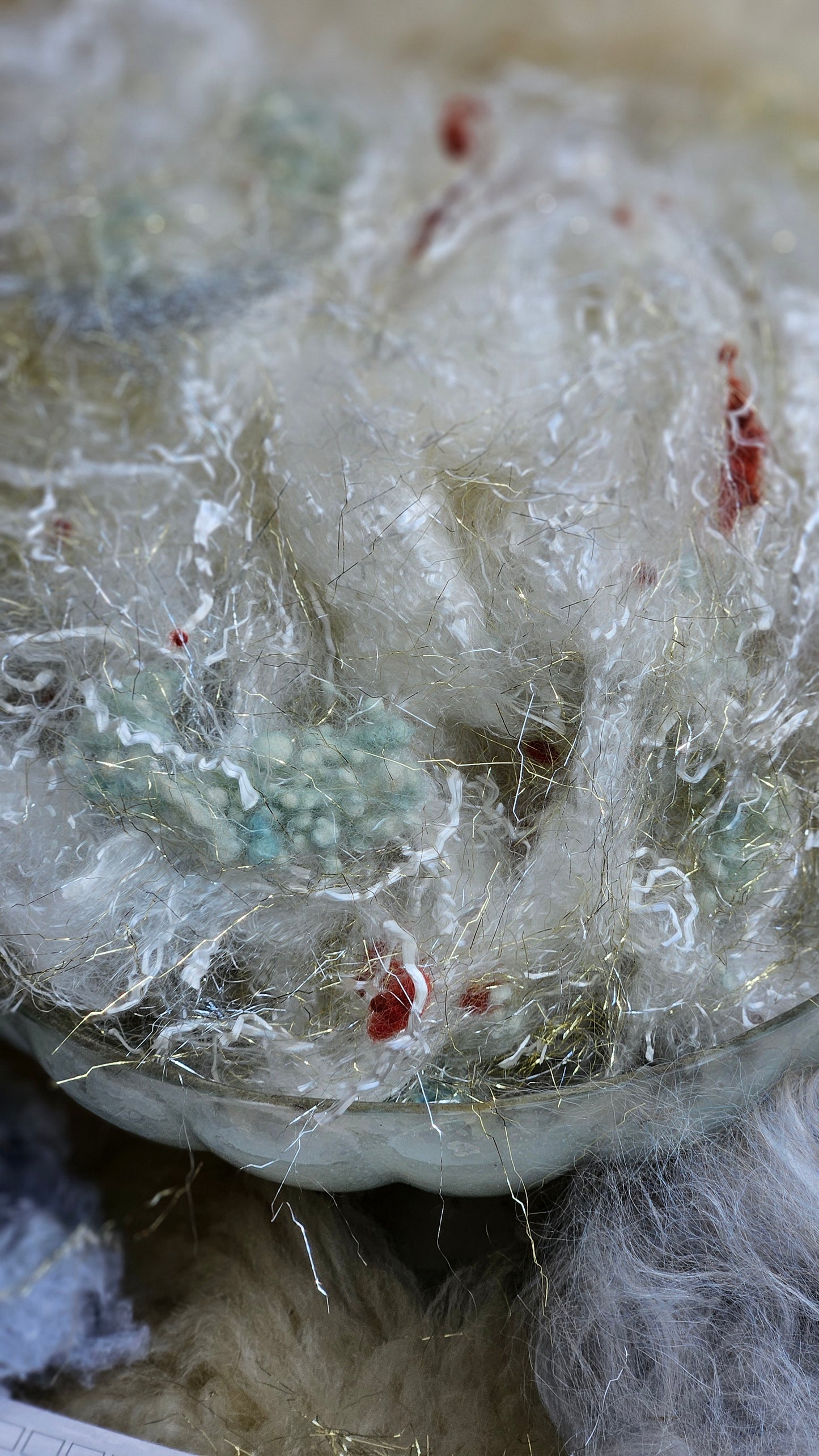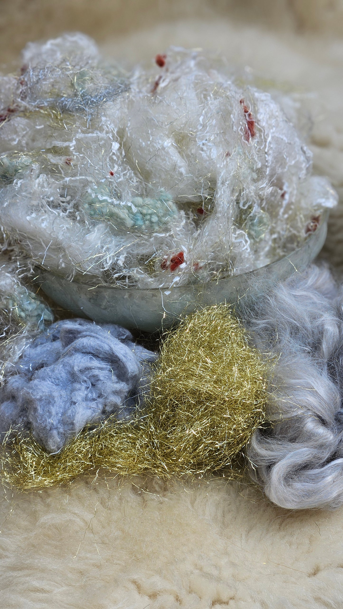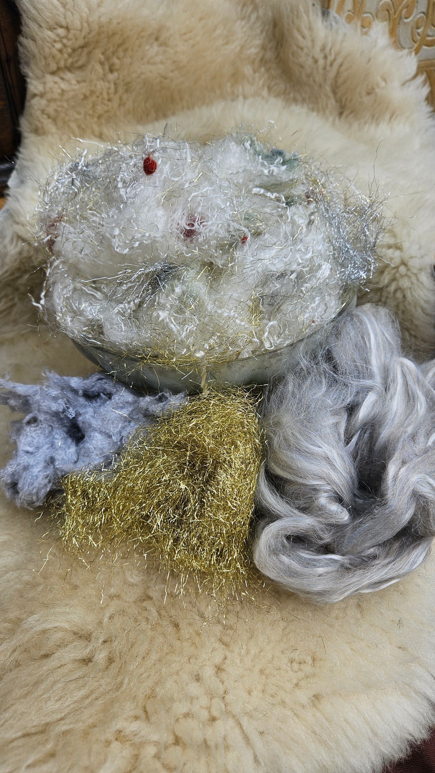 - Eucalyptus crimp blend with silver and gold sparkle scattered with aquamarine and ruby wool nepps