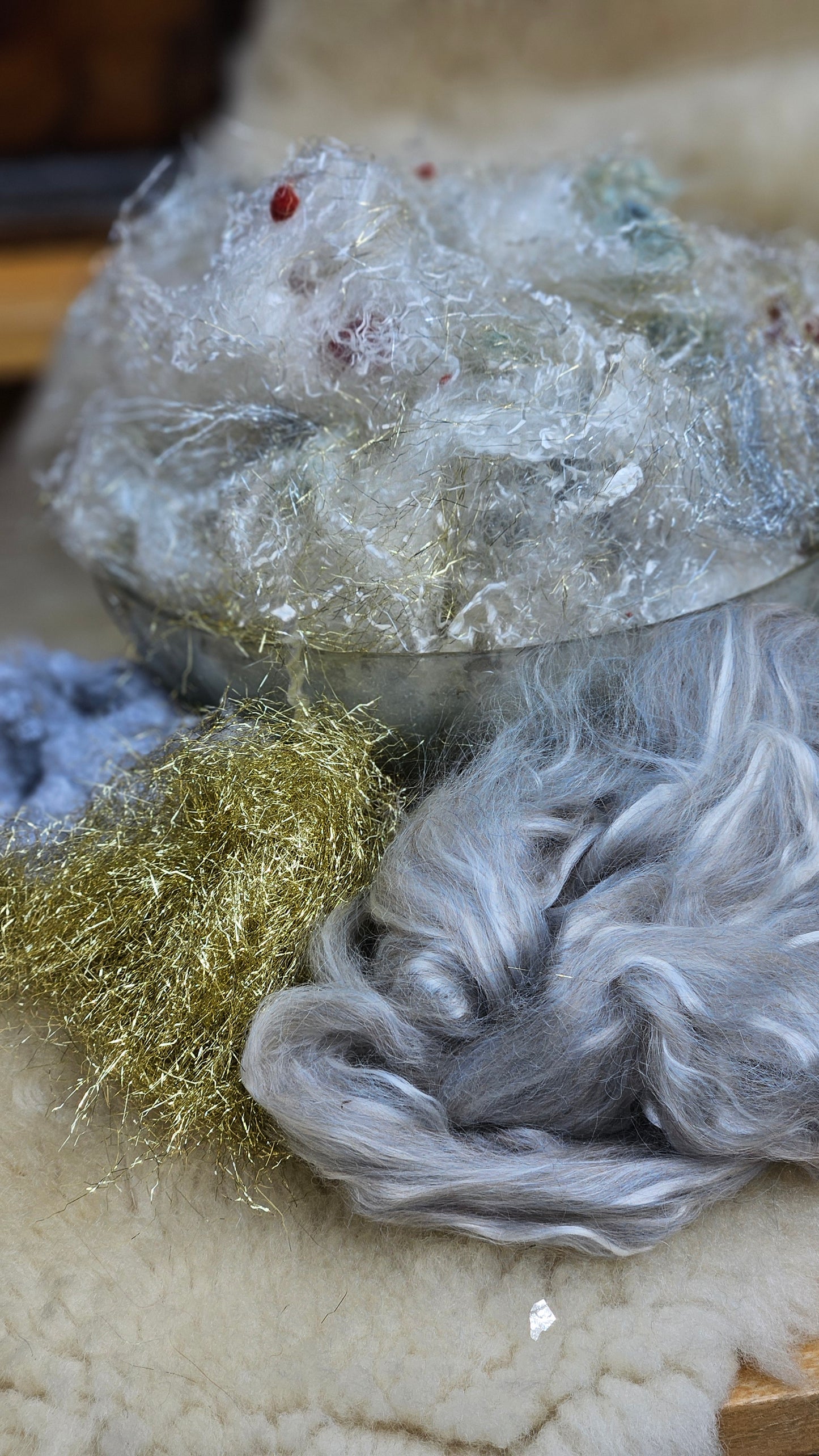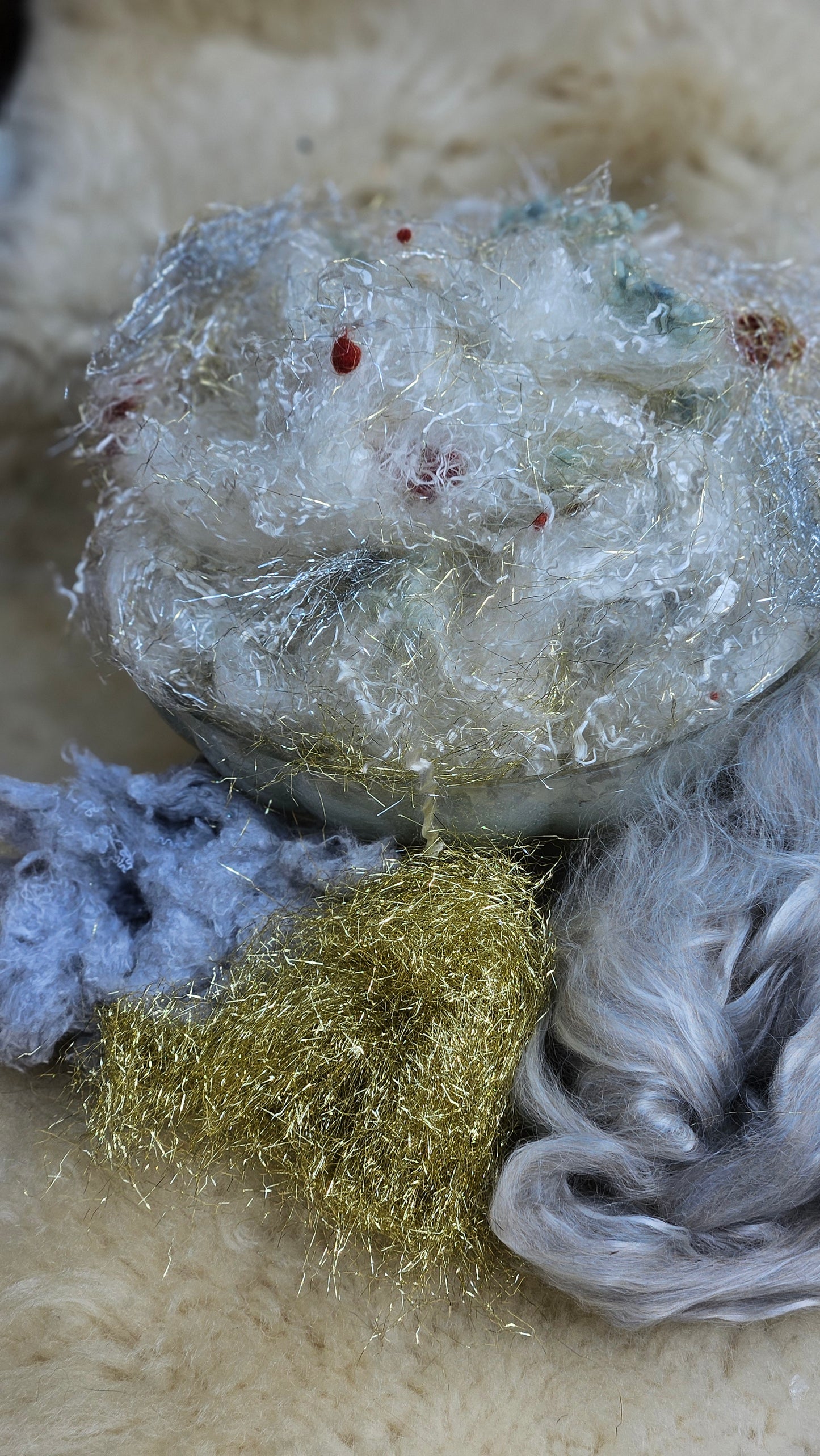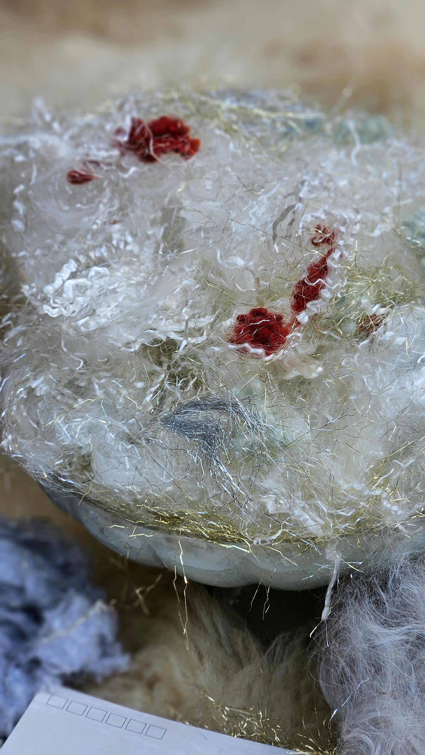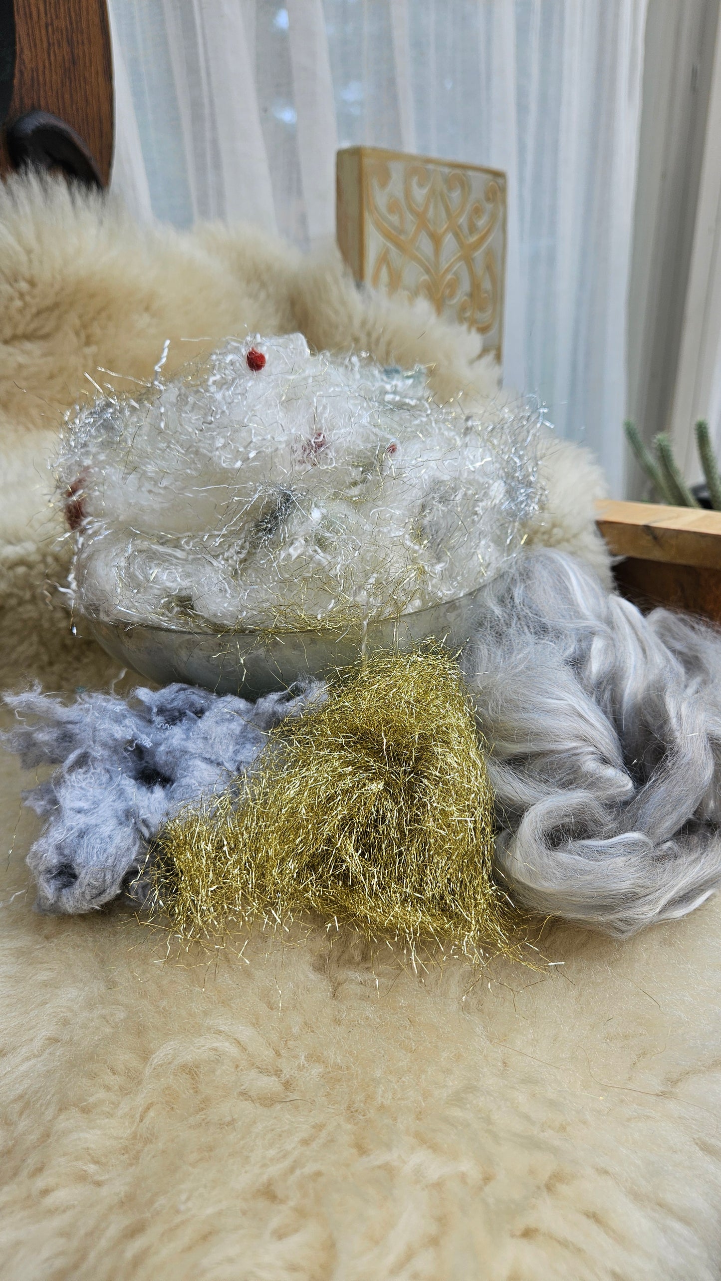 - Eucalyptus crimp blend with silver and gold sparkle scattered with aquamarine and ruby wool nepps
