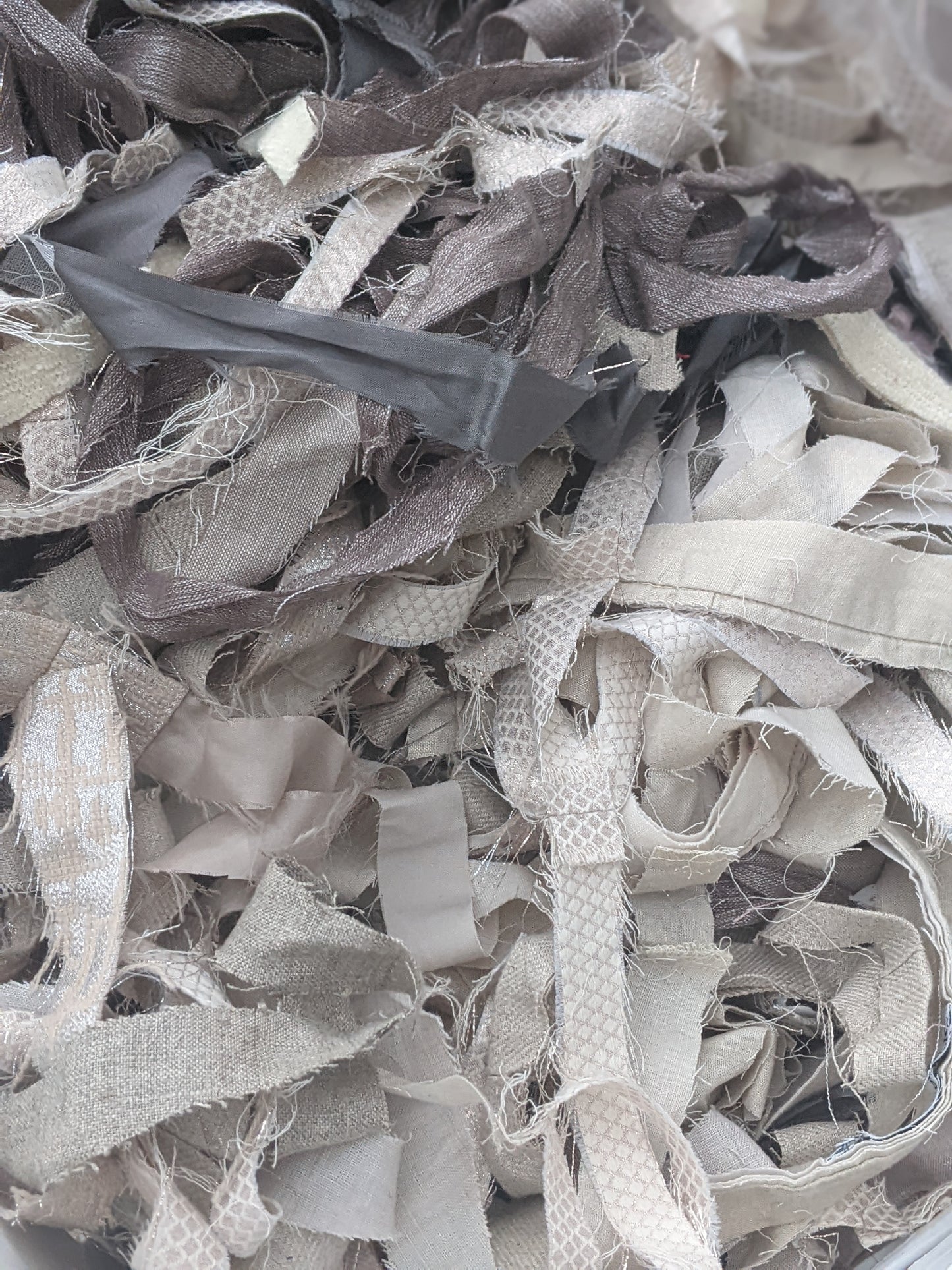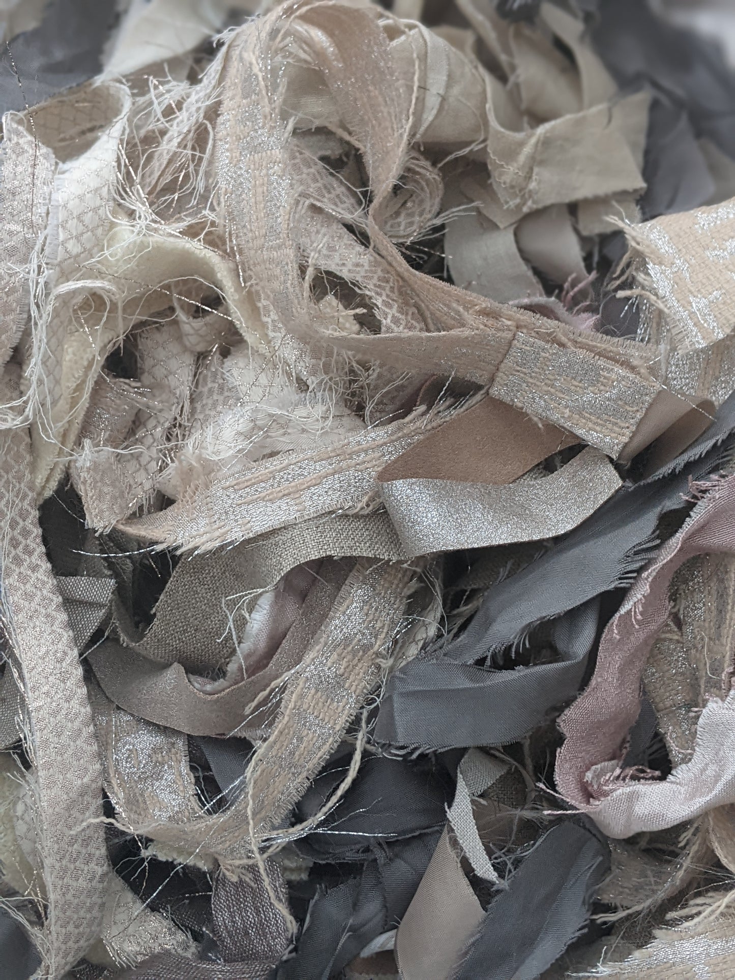 I cut these ribbons by hand from high quality fast fashion textiles to weave into freeform weaving or spinning into art yarn. The textiles are wool, silk, linen, metallic, brocade, and novelty prints.