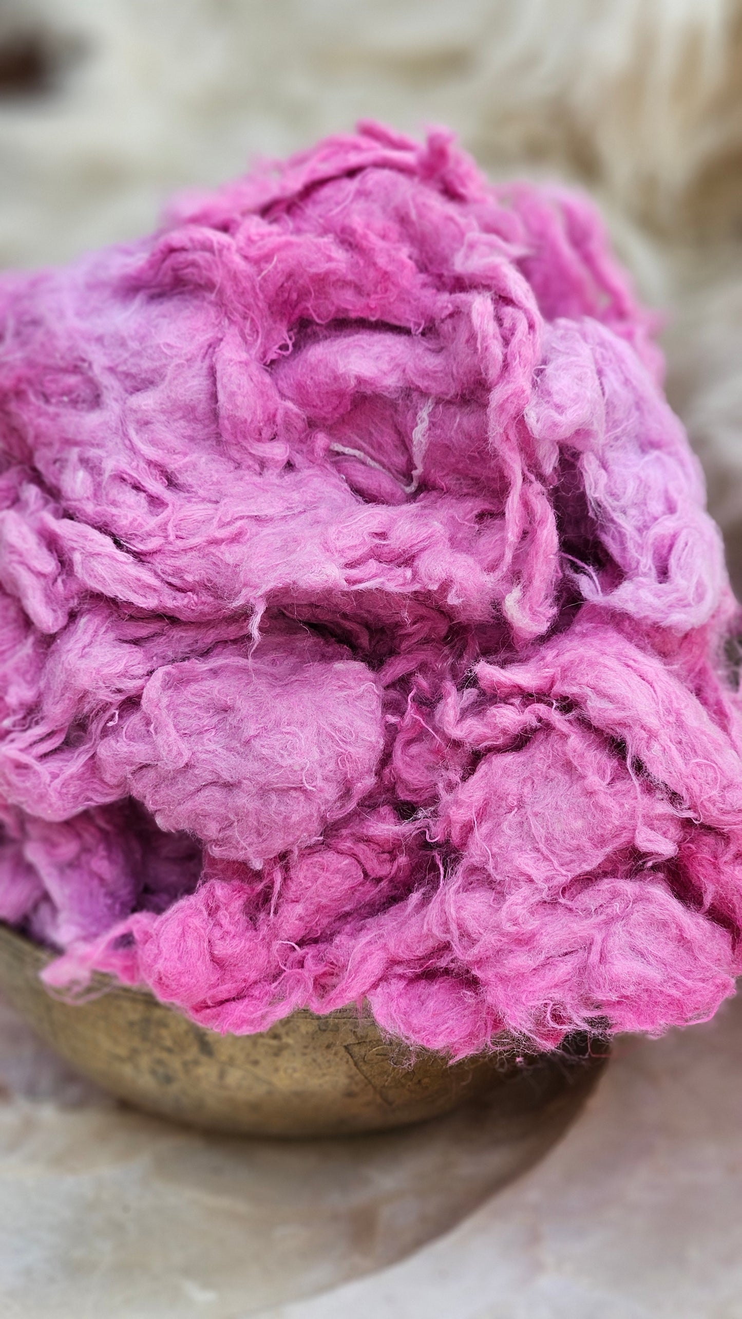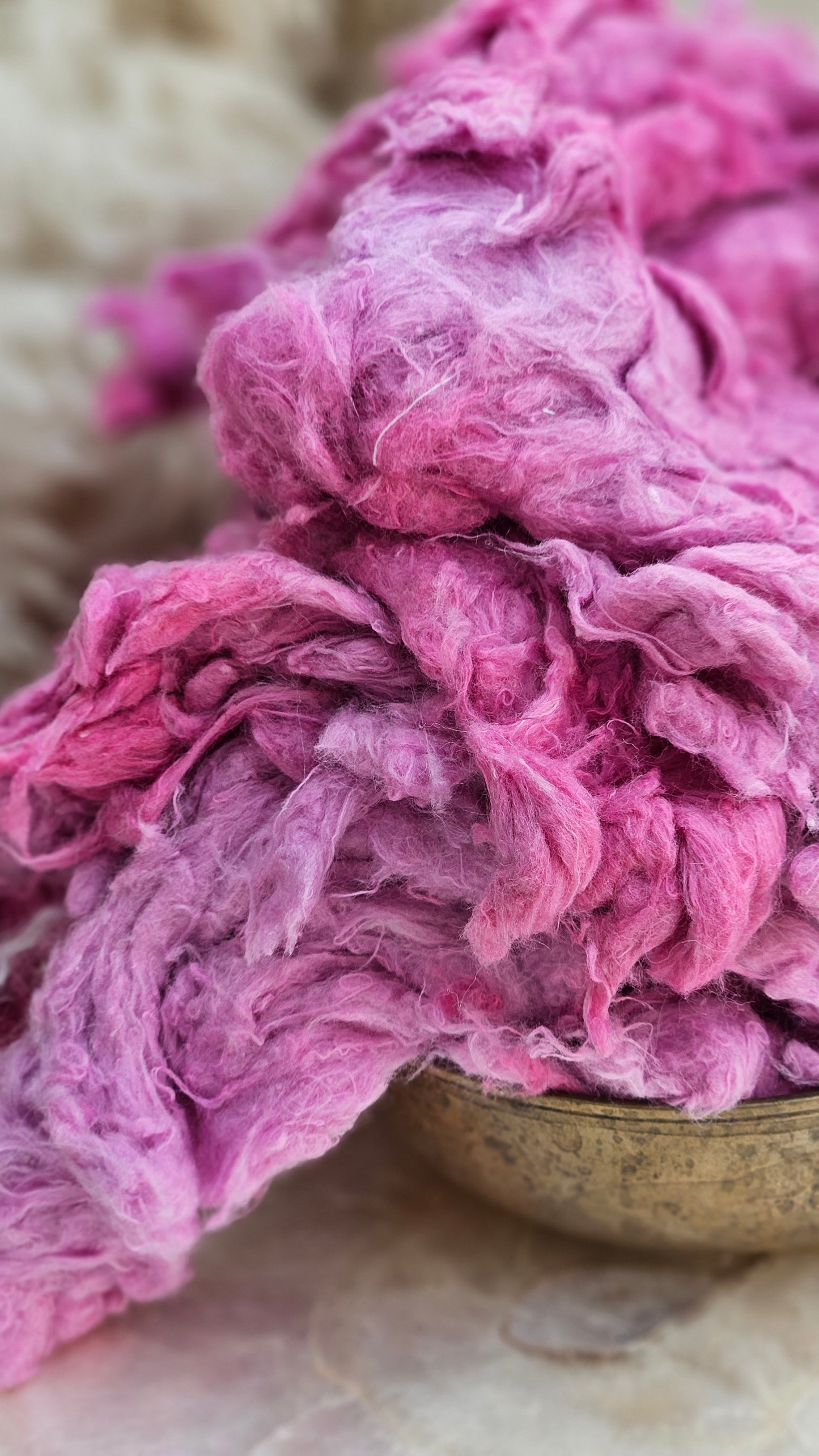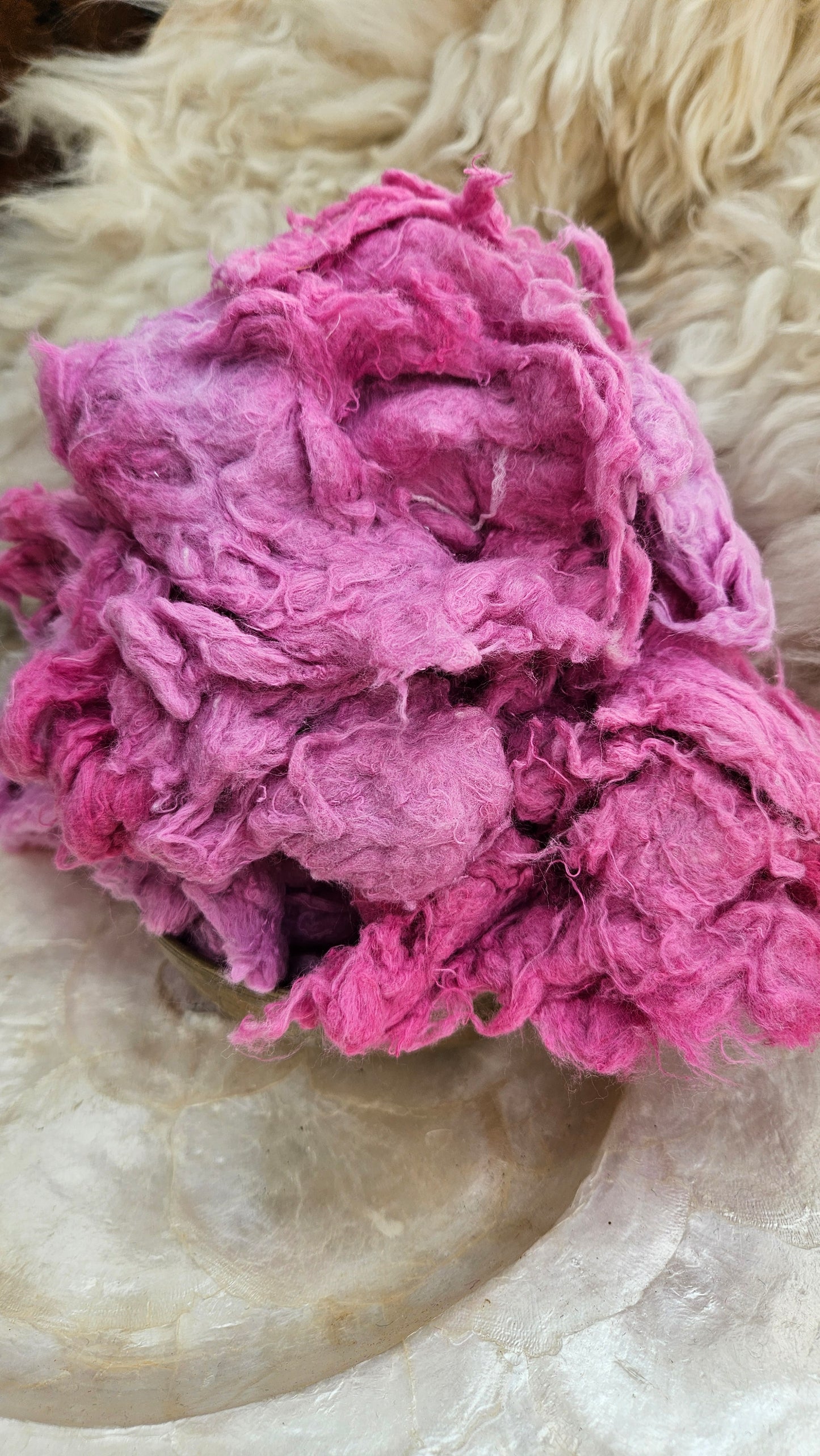 Recycled zero waste hand-dyed cotton noil that pulls apart like feathers and creates a hazy delightful tweed texture in art batts and rolags. Next to skin soft, dense, and textured with fine cut threads.