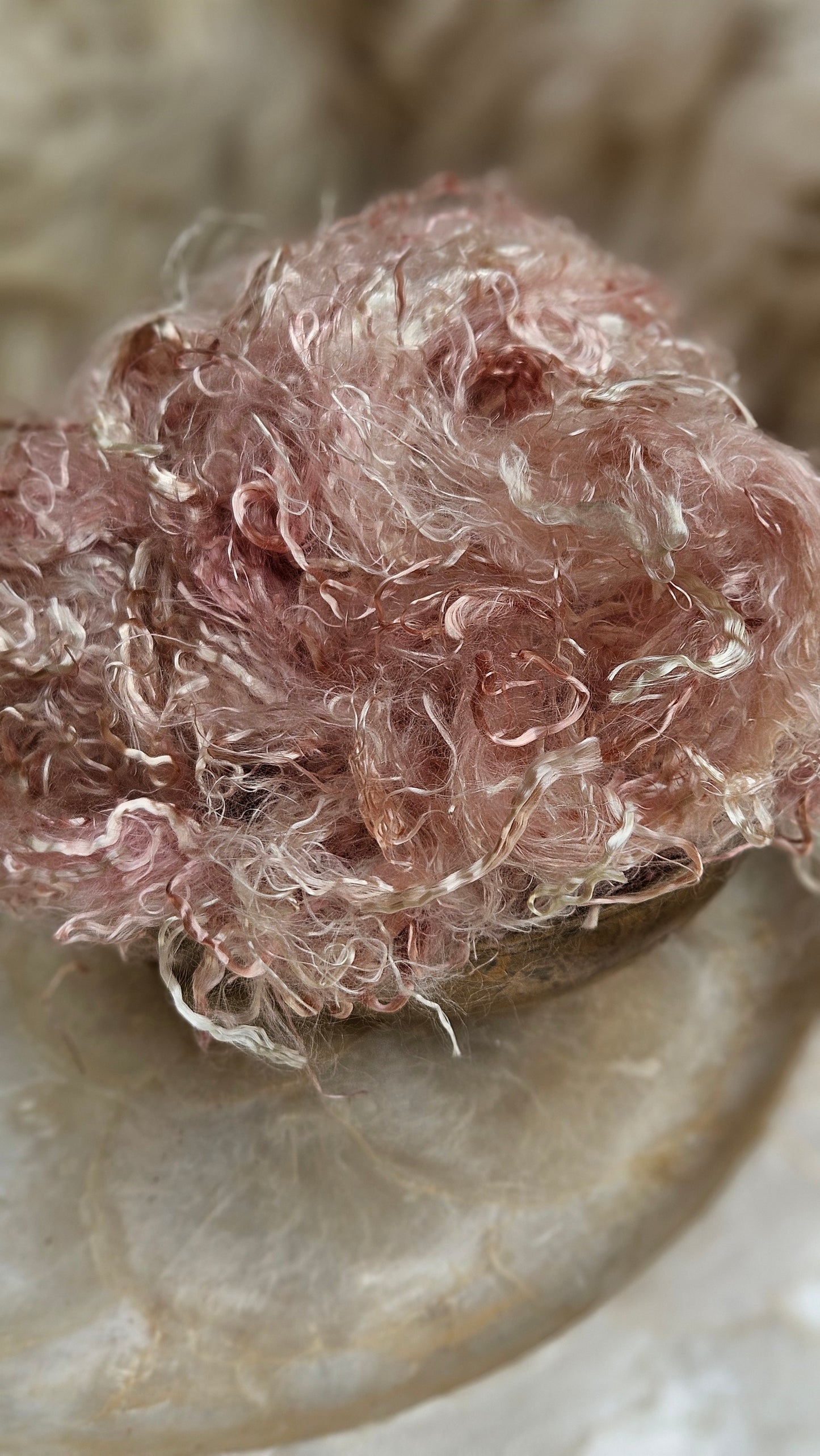 Neauveau hand-dyed eucalyptus crimp fauxsilk fiber adds shine and silky texture to everything from art yarn spinning to papermaking, felting, and mixed media fiber art. Dyed in small batches using signature painterly techniques. Expect subtle tonal variation and texture - no two bags are exactly alike, and that's part of the magic. Colorways in this collection are inspired by shimmering gemstones and subtle metallic tones, perfect for adding depth and elegance to your palette.