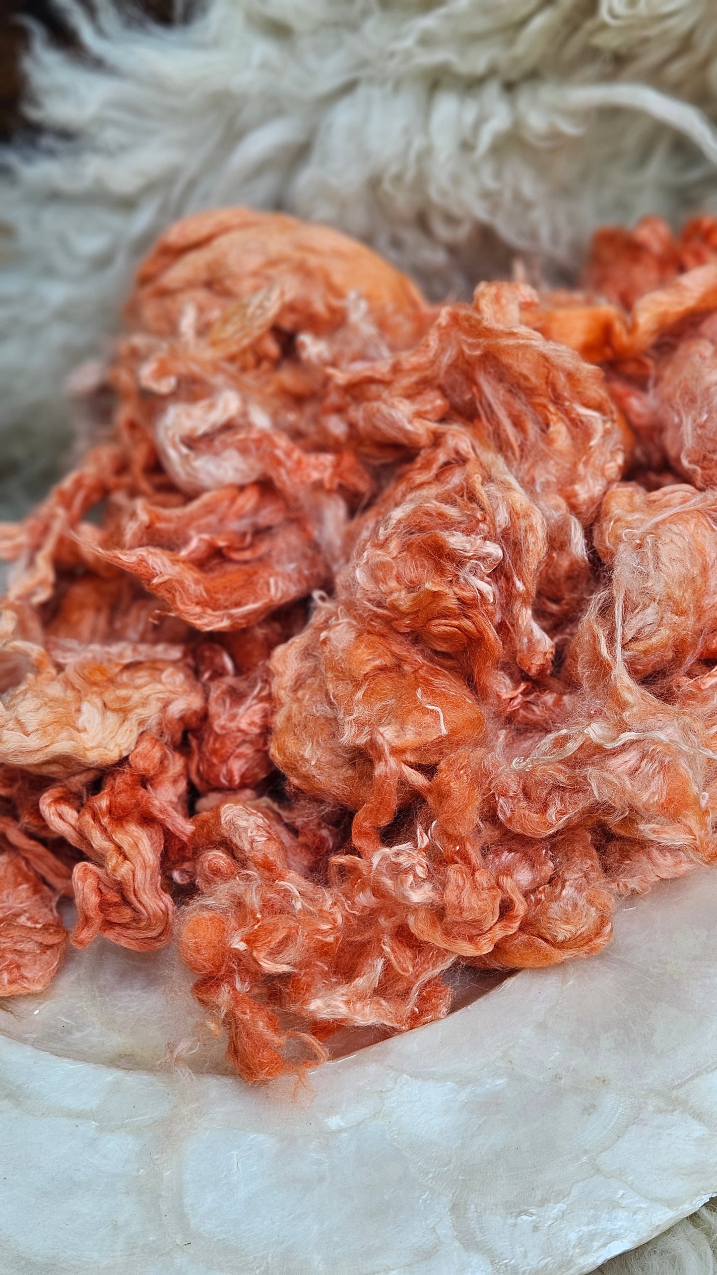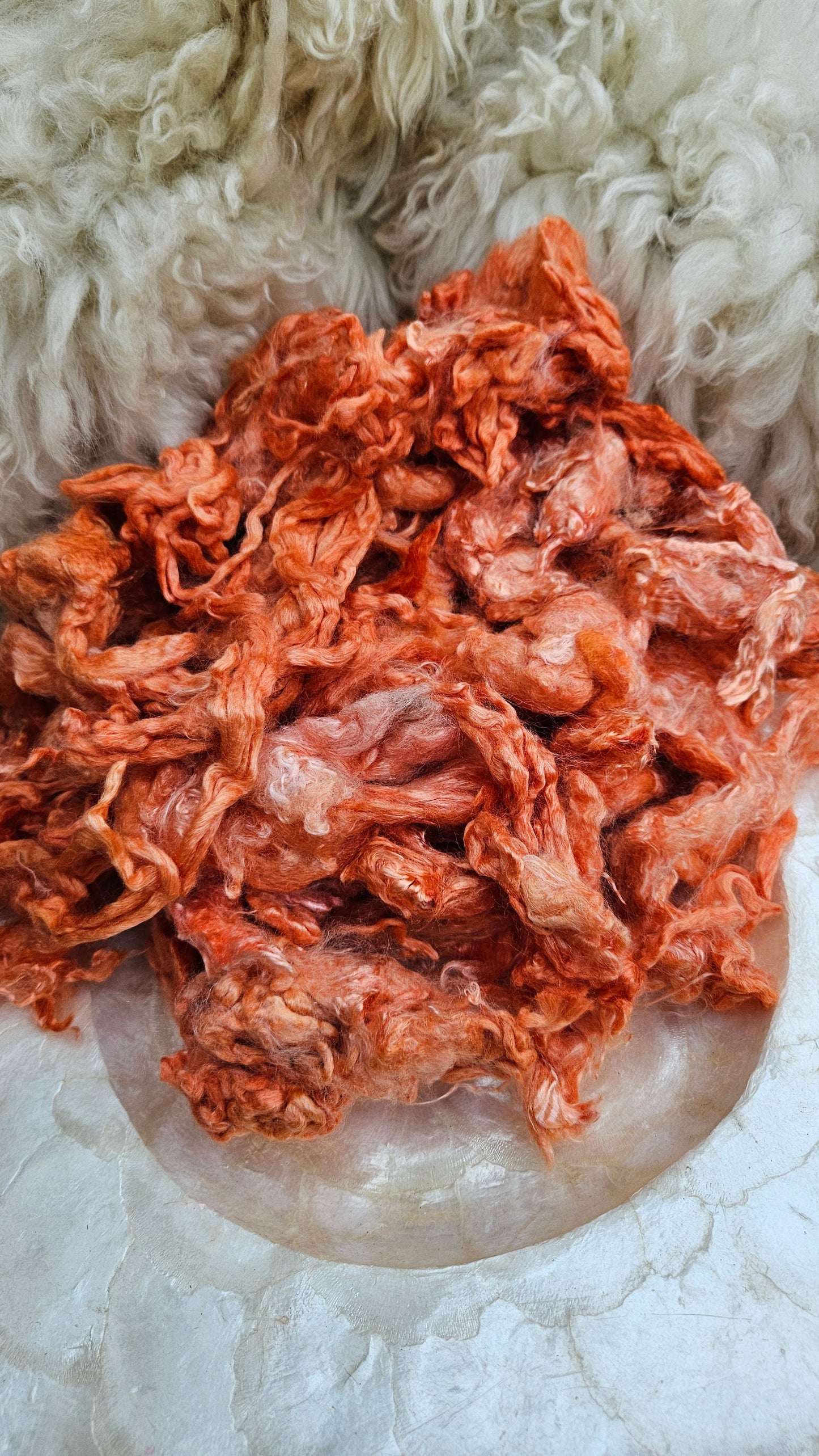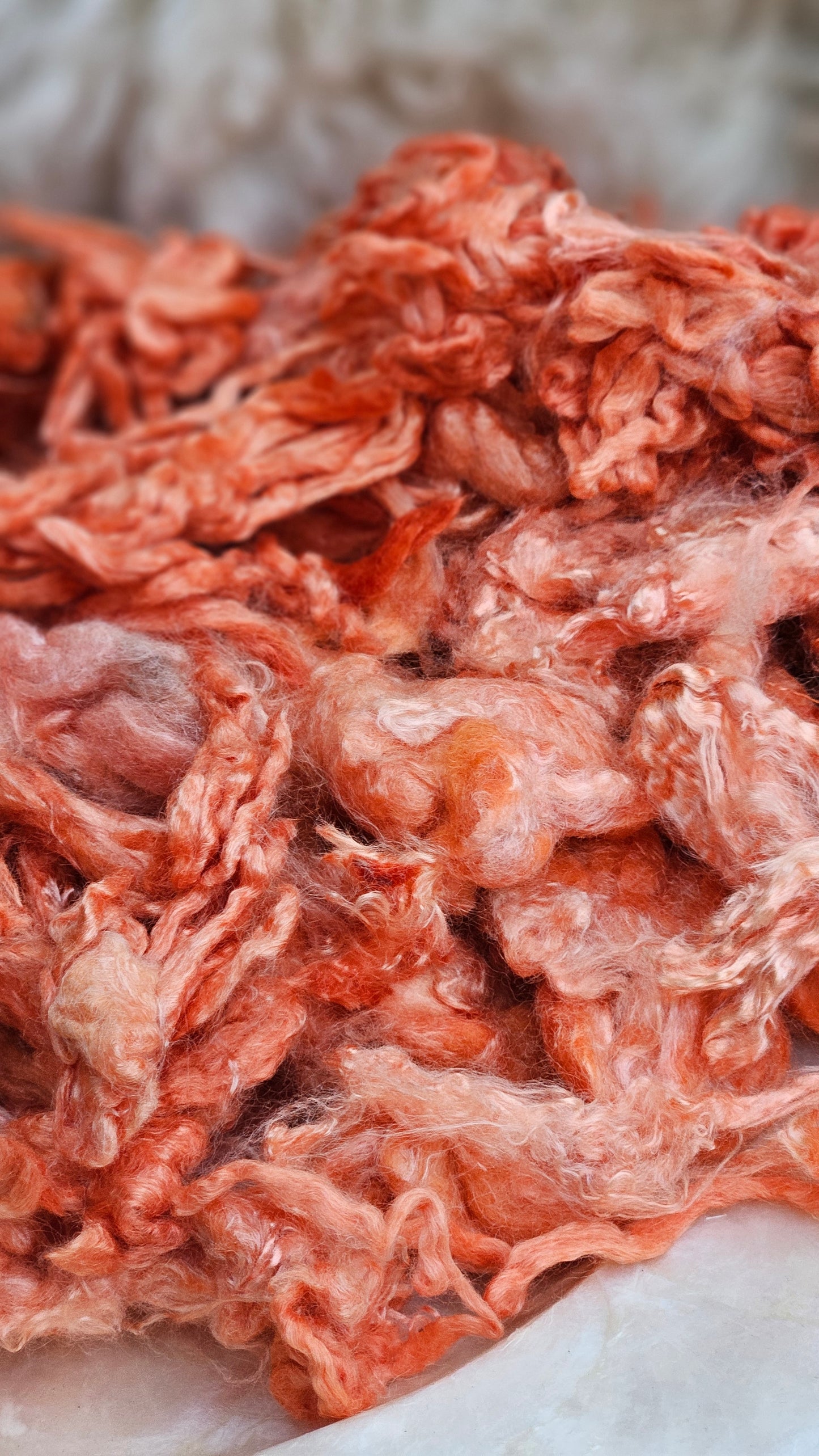 These dense mallowy chunks can be hand-picked very easily to create a fluffy cloud. Running it thru a wool picker would create divine fluffy cloud. This zero-waste fiber is a perfect foundation for art batts, felting, and fiber art.