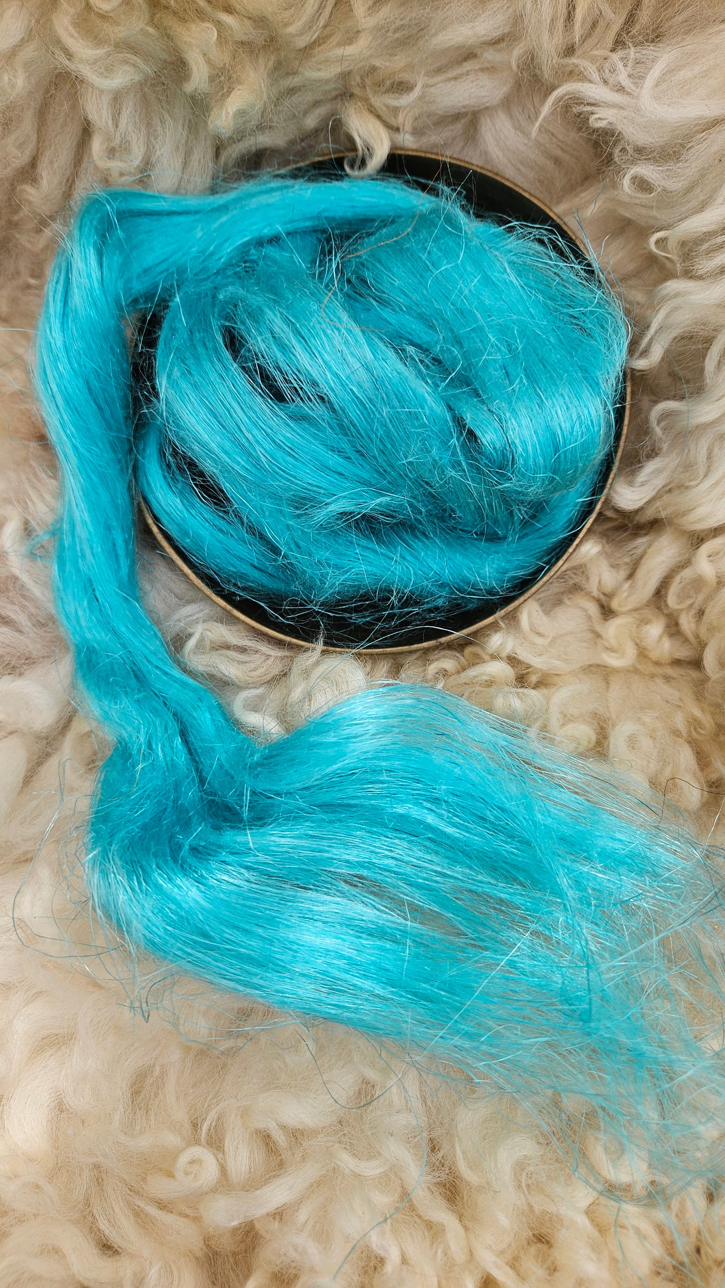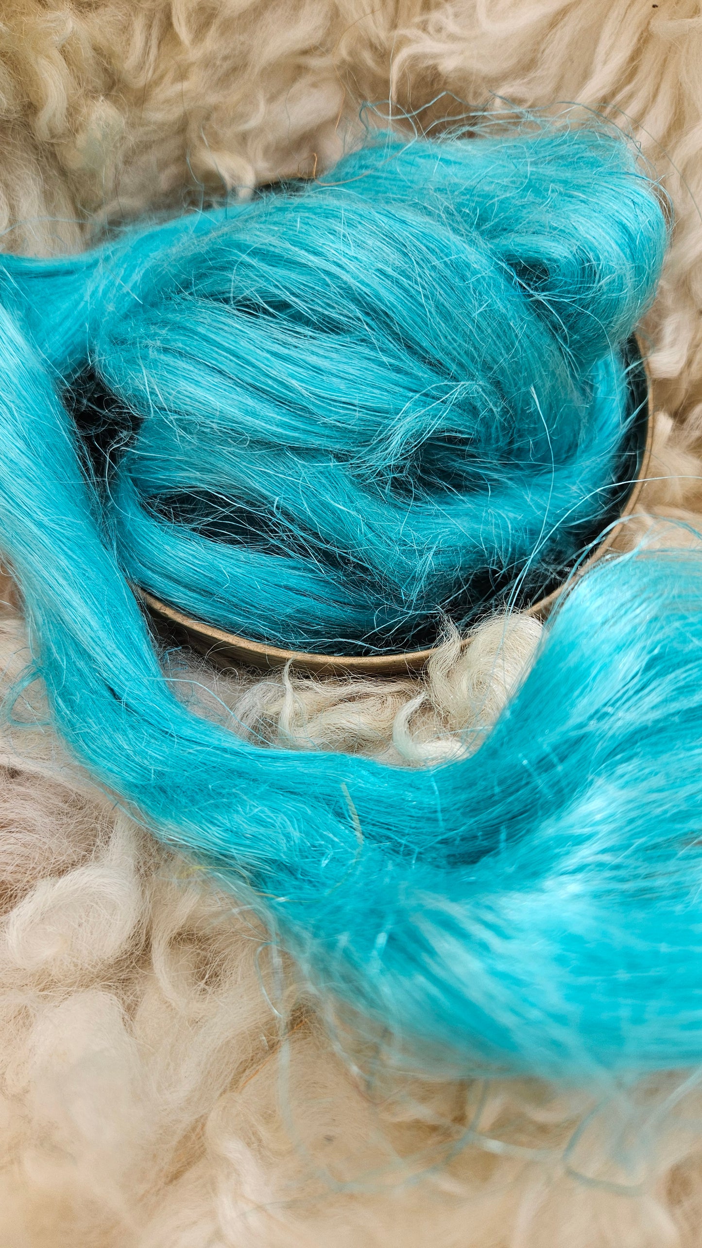 Flax is absolutely delightful to blend with all fibers, especially wool. This commercially dyed flax is smooth and fine, a very high quality.