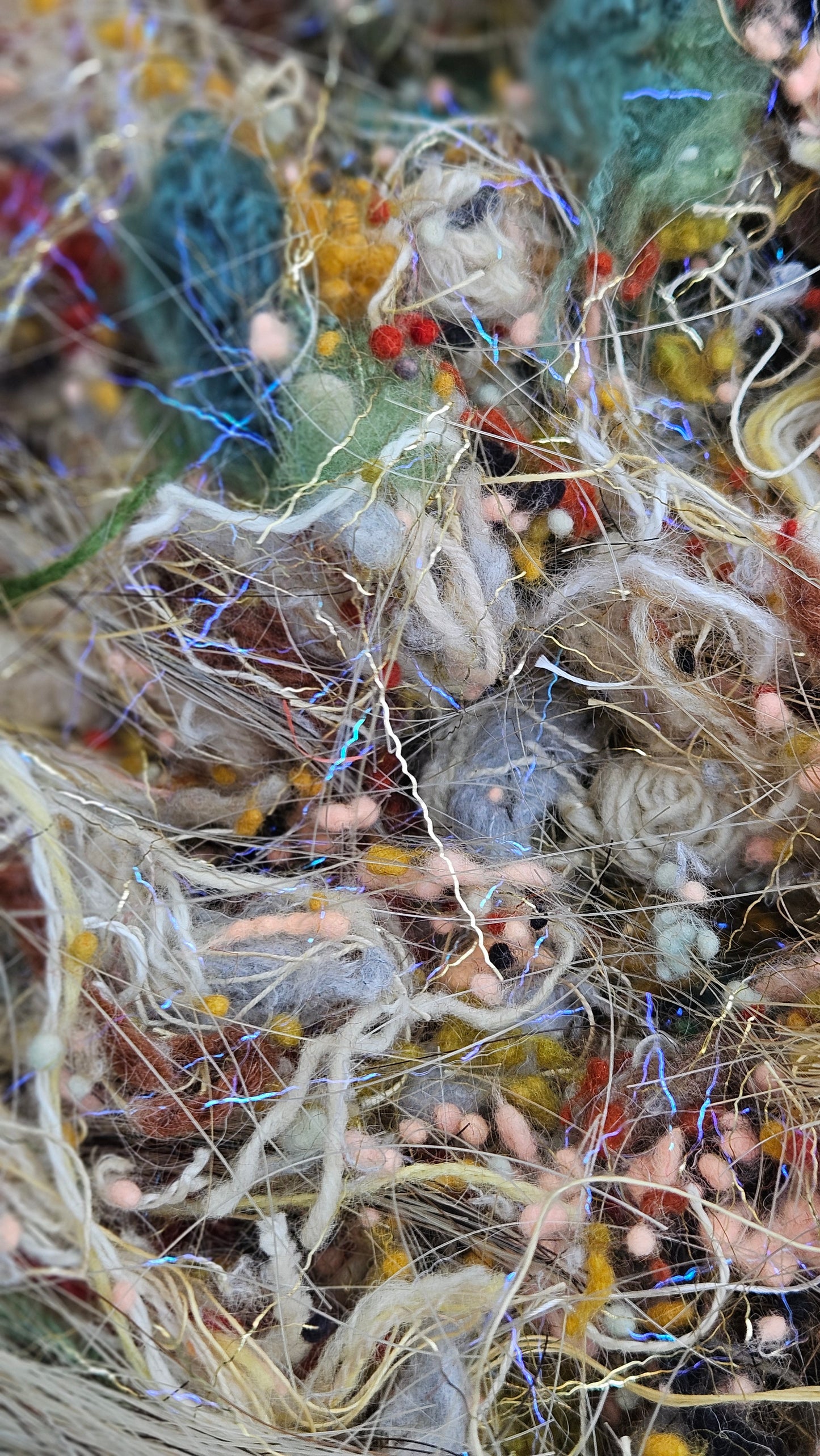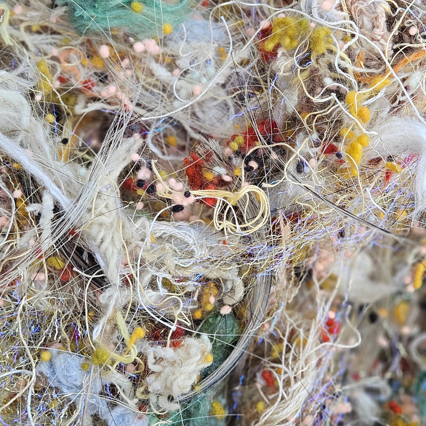 Many of my texture blends include a handful of leftovers from other blends to add dimension and interest. Therefore you may also find some of the following fibers in this texture blend: merino, bfl, mohair, long wool locks, silk noil, alpaca, bamboo, eucalyptus, silk, linen, wool nepps, cotton nepps, recycled cotton, flax, hemp, Angelina sparkle, thread bits. All blends are made with sustainability in mind. We thoughtfully repurpose fiber ends, dye studio extras, and curated offcuts to reduce waste and create something magical. Nothing goes to waste—only into wonder.