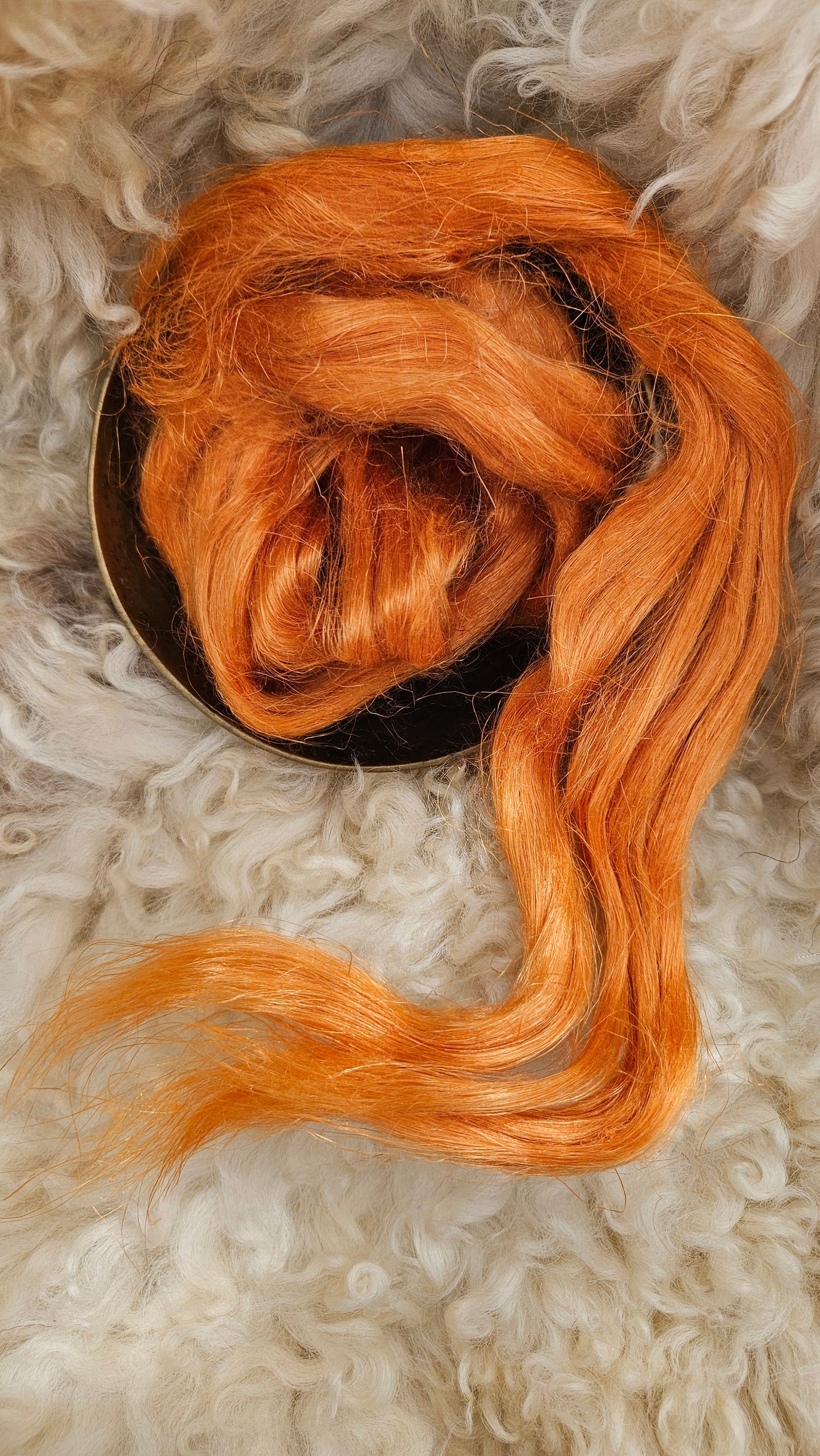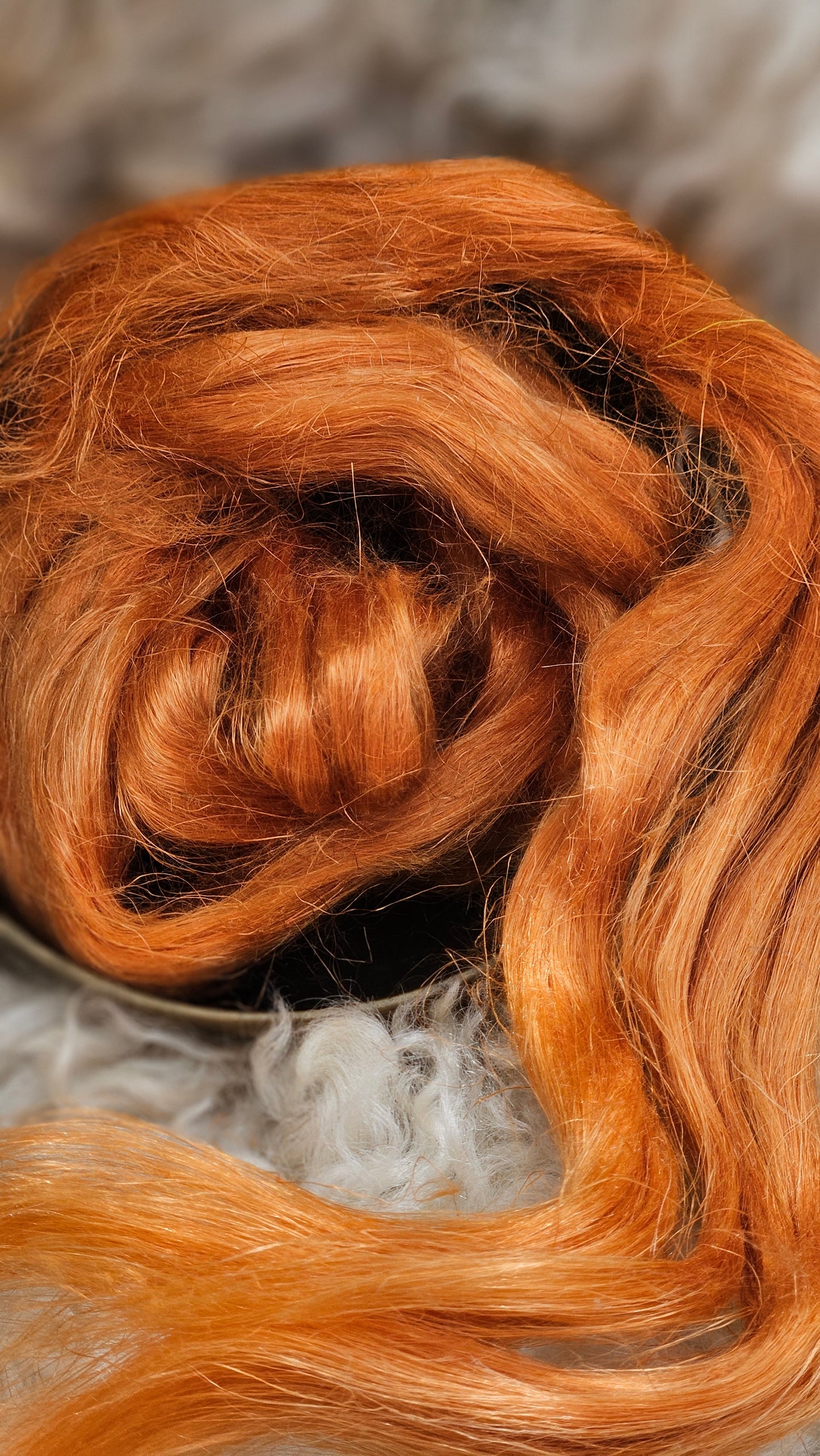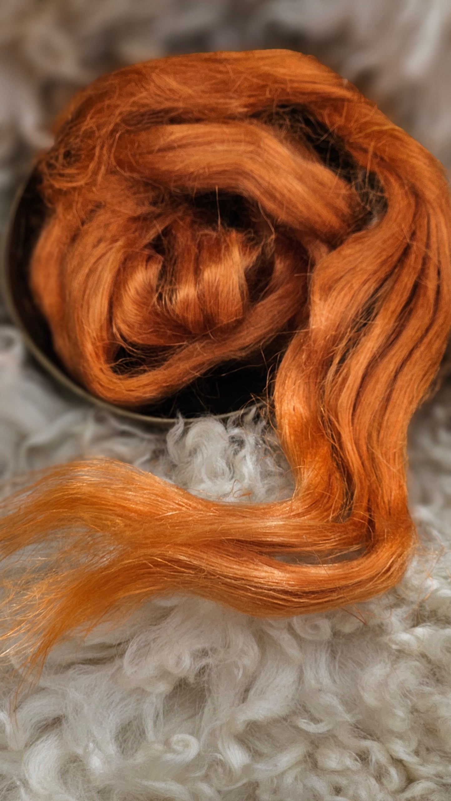 Flax is absolutely delightful to blend with all fibers, especially wool. This commercially dyed flax is smooth and fine, a very high quality.