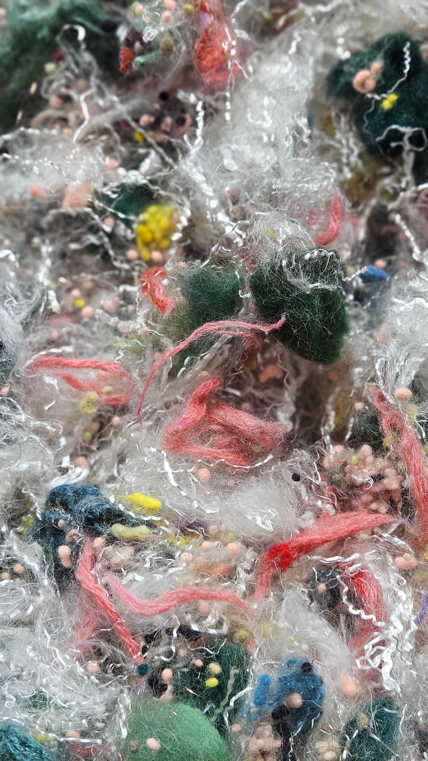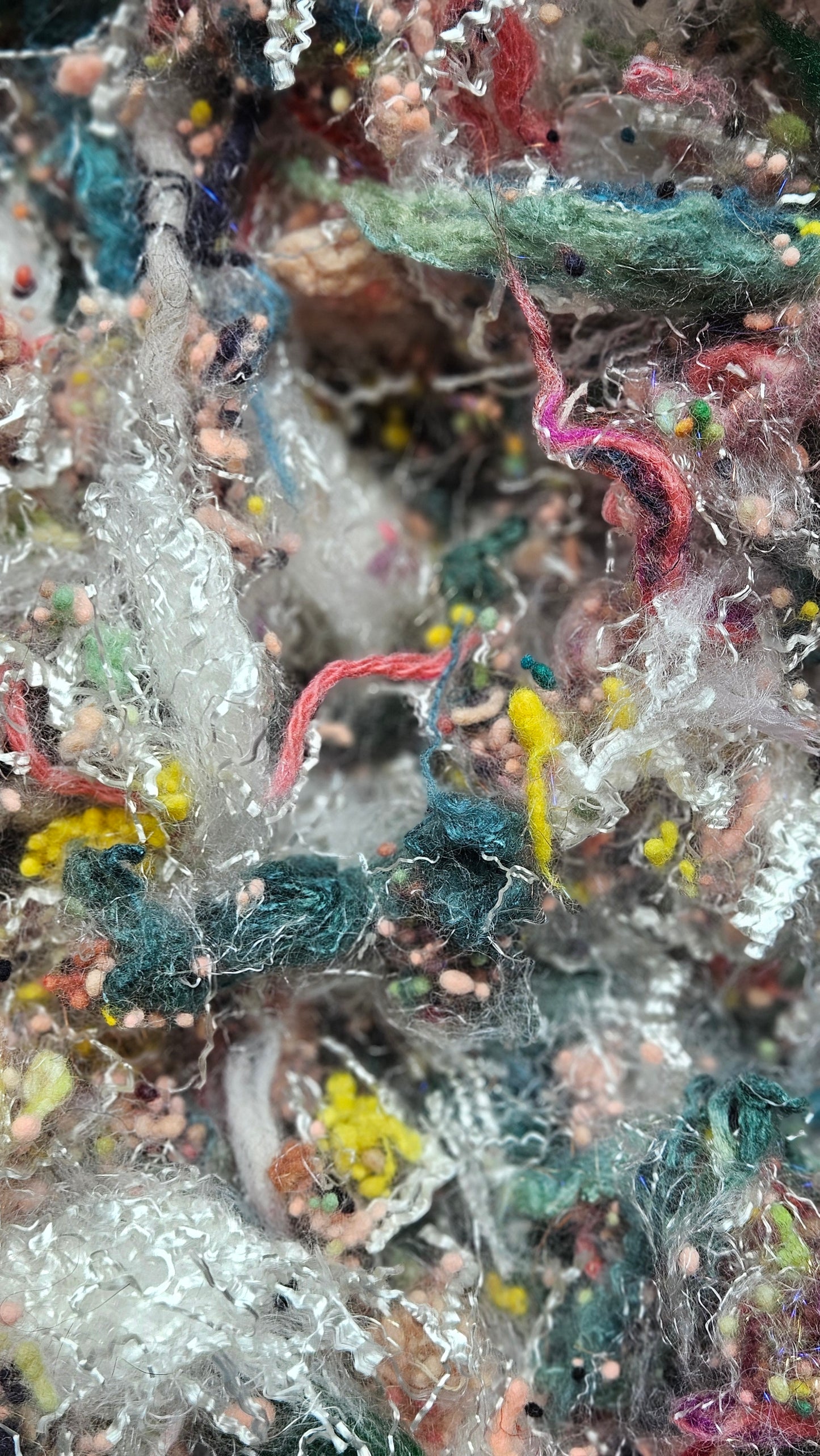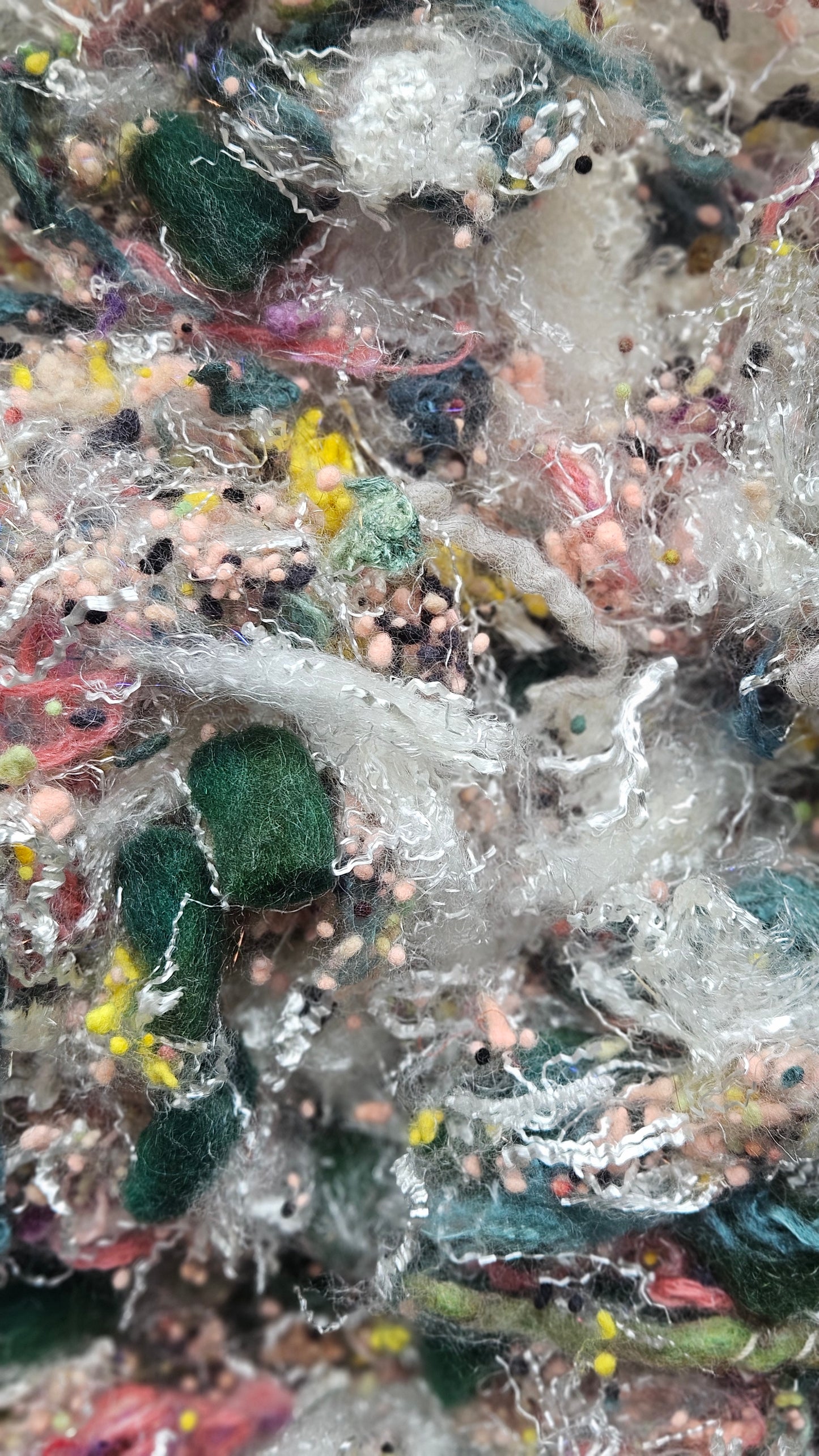 Very special and rare fiber art texture with genuine Horse Tail (the hair) cut into 4-6 inch lengths and blended into this texture. The Horse tail is black and creates a smooth almost flaxen feel of whiskers to the texture. Definitely something to try! The tail came from a beloved pet Horse named "Black Beauty" and was given to me as a gift. I used a small portion in this texture and kept the rest in my personal stash. Horse tail makes a wonderful boucle textured yarn.