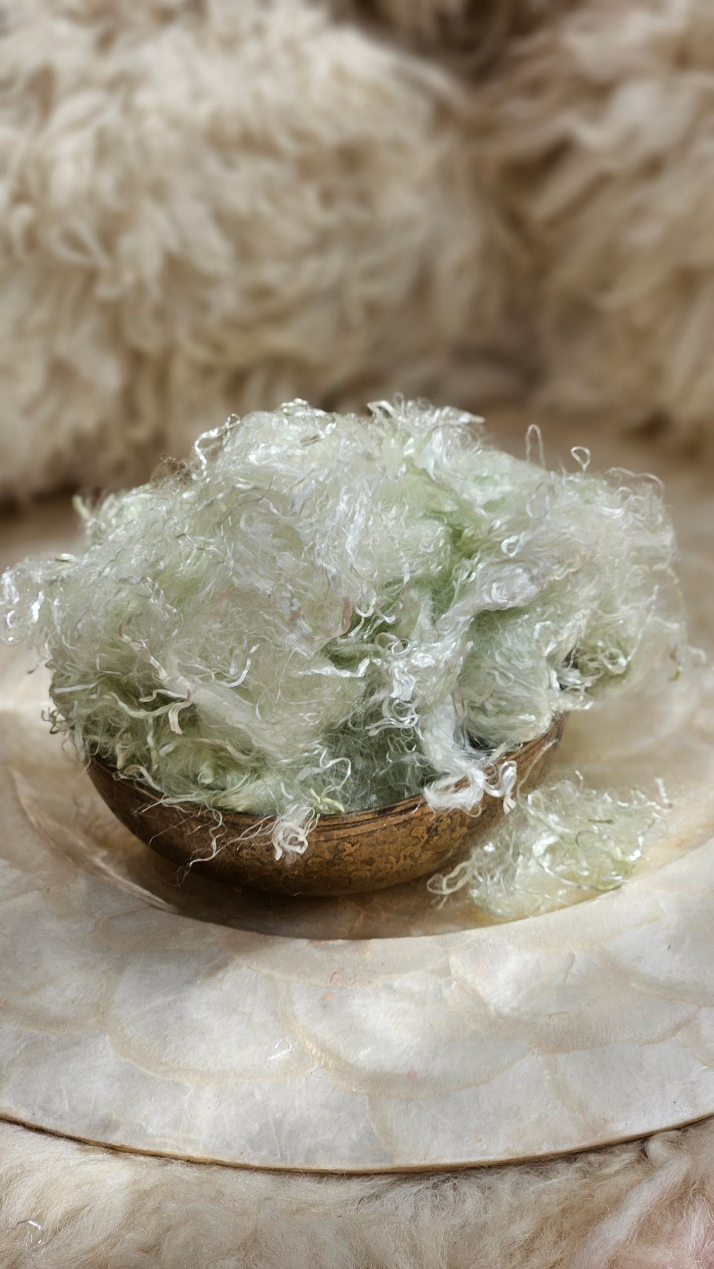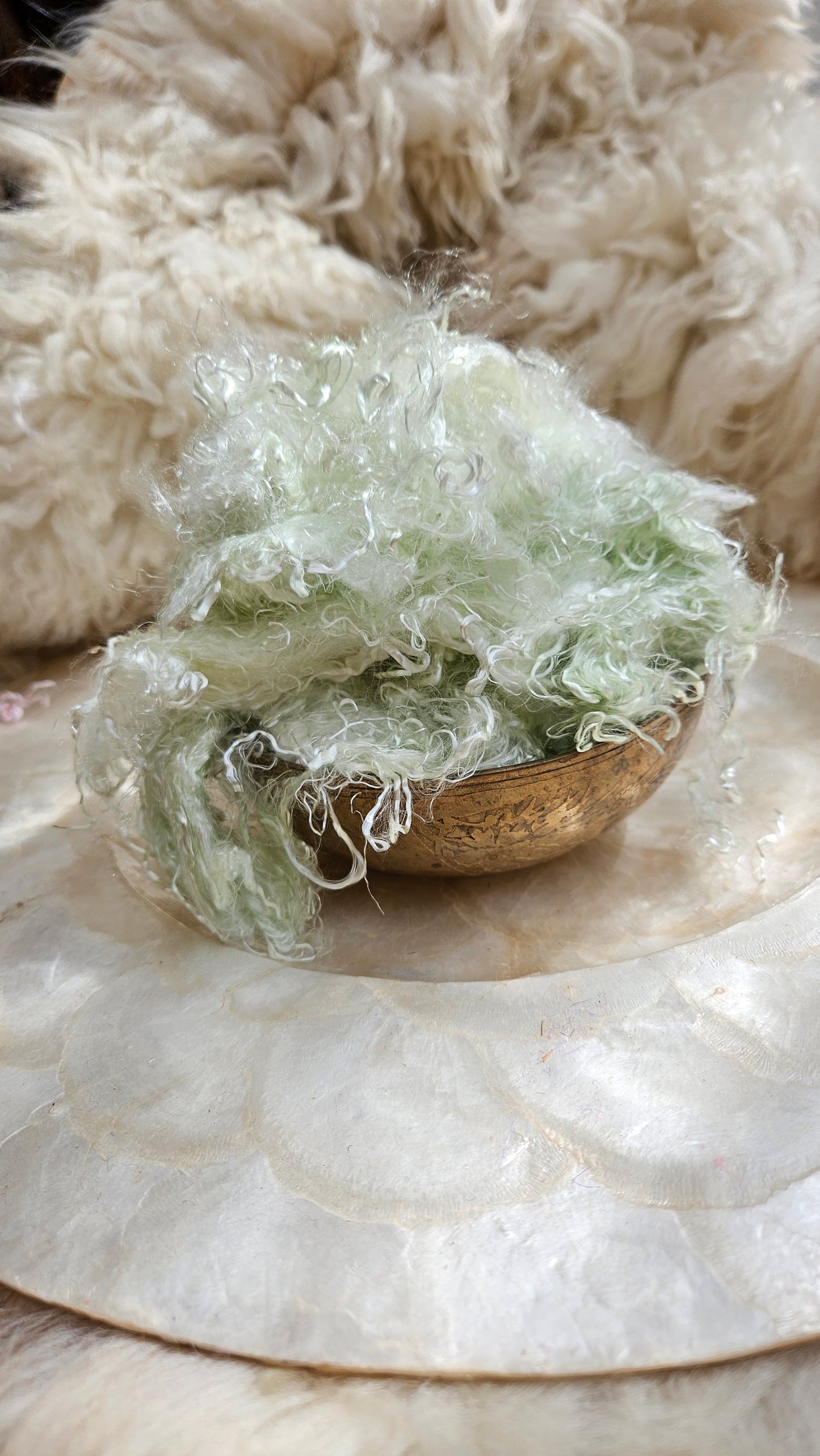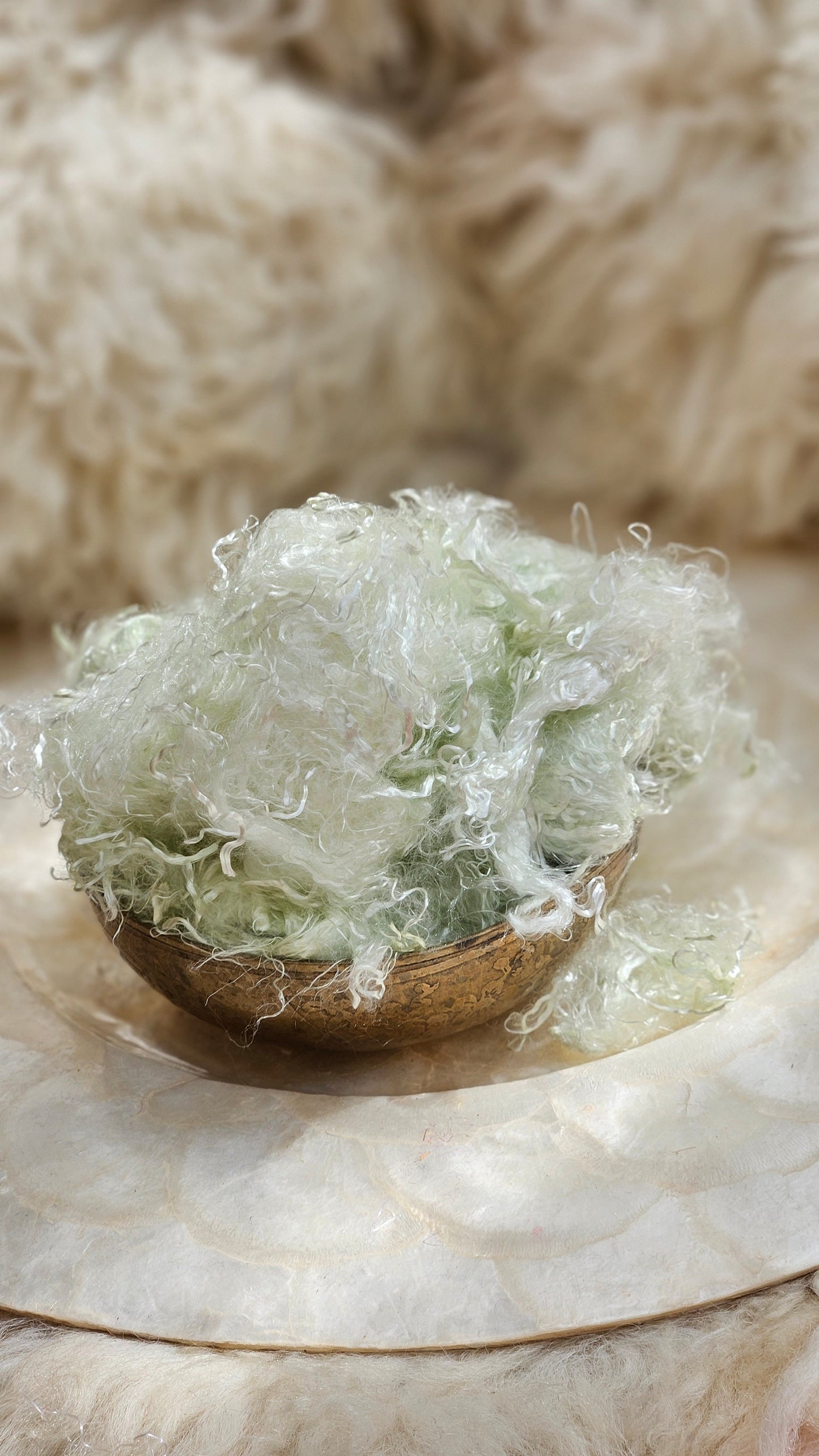 Neauveau hand-dyed eucalyptus crimp fauxsilk fiber adds shine and silky texture to everything from art yarn spinning to papermaking, felting, and mixed media fiber art. Dyed in small batches using signature painterly techniques. Expect subtle tonal variation and texture - no two bags are exactly alike, and that's part of the magic. Colorways in this collection are inspired by shimmering gemstones and subtle metallic tones, perfect for adding depth and elegance to your palette.