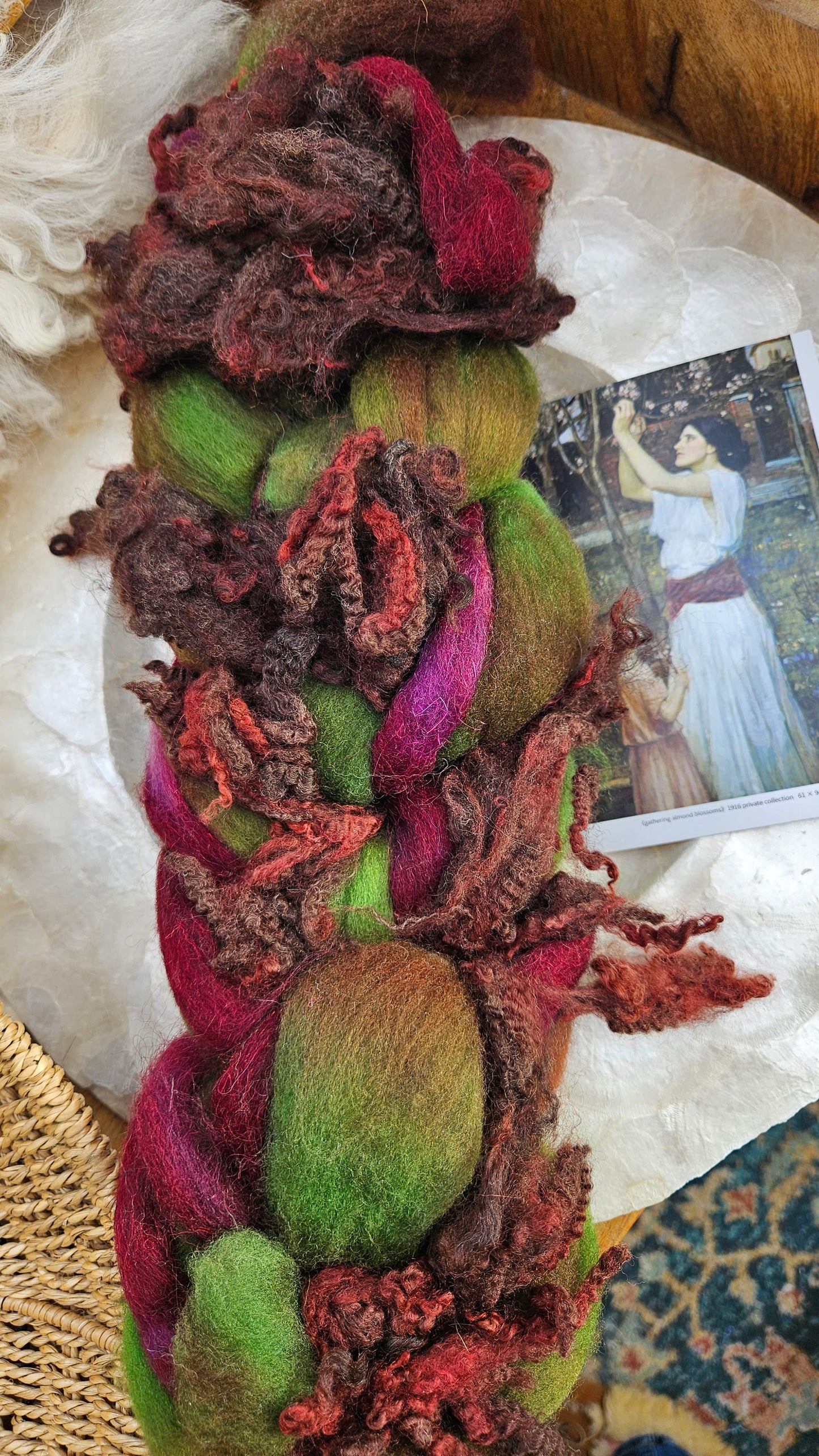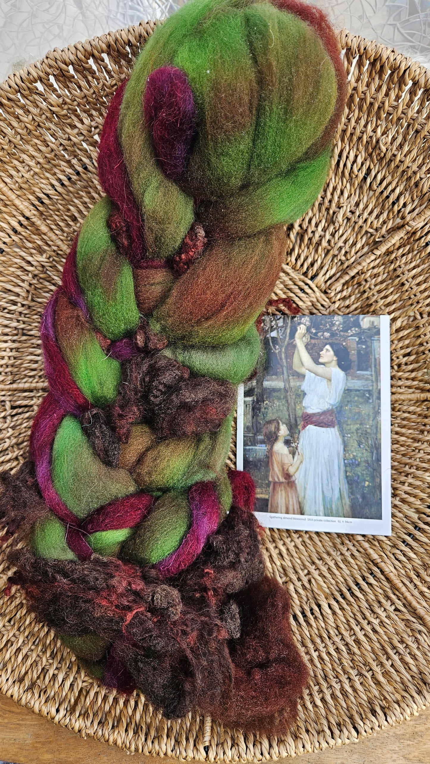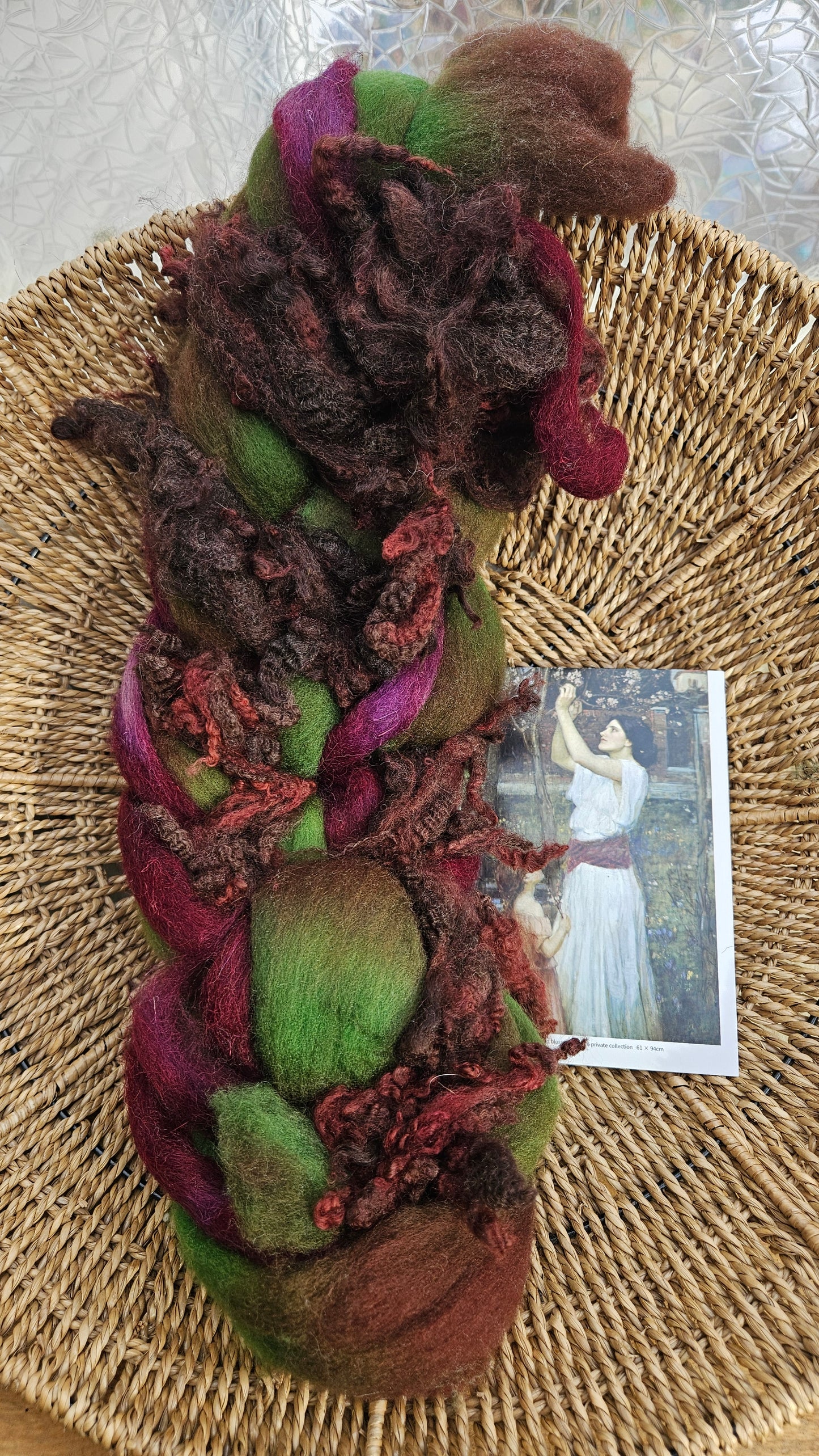 Inspired by the impressionist paintings of Waterhouse using his timeless fine art colorway pallete. Each wool roving braid includes multiple breeds and textures of high quality fiber for blending and carding into art batts or spinning into yarn directly from the braid.