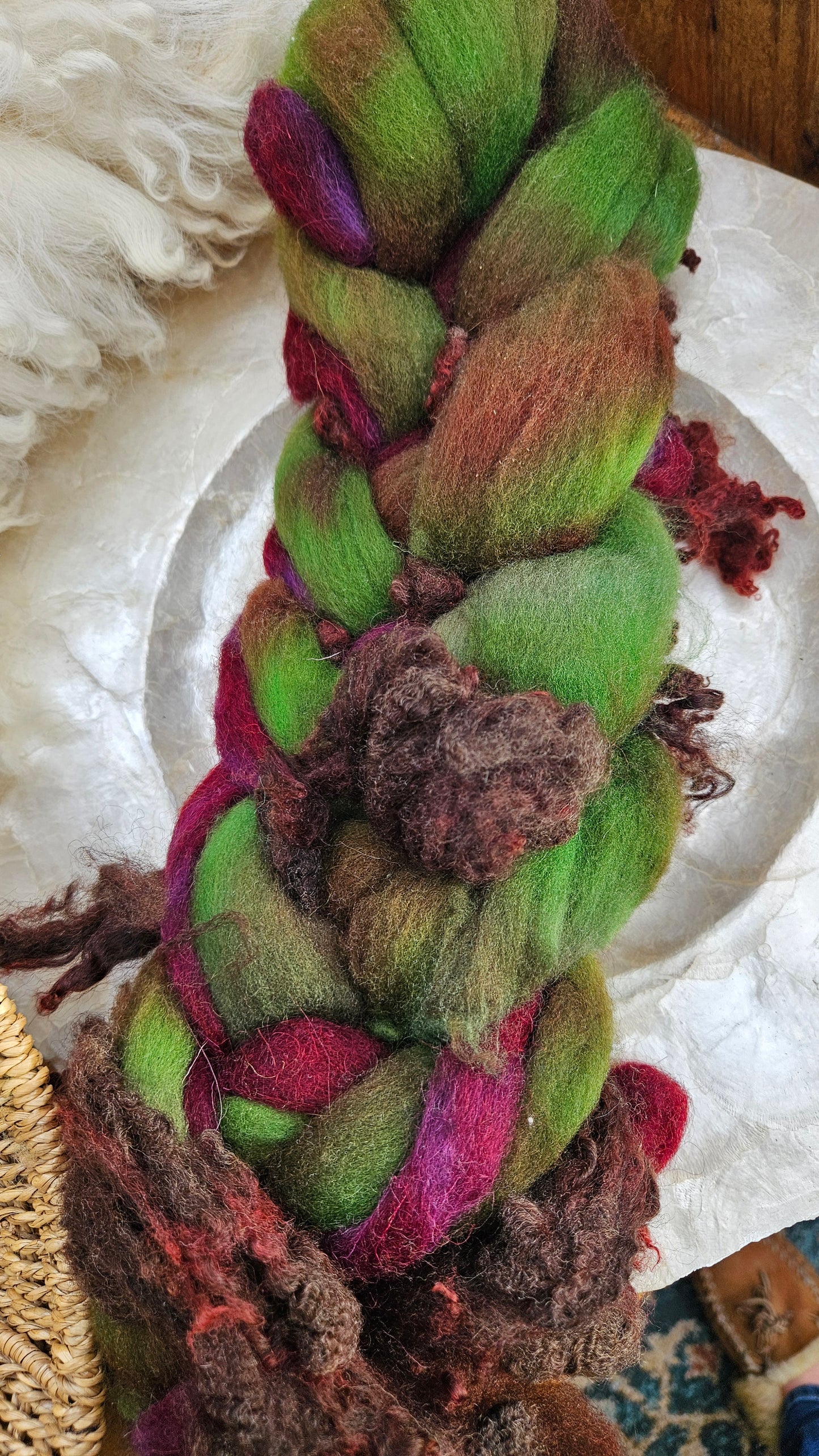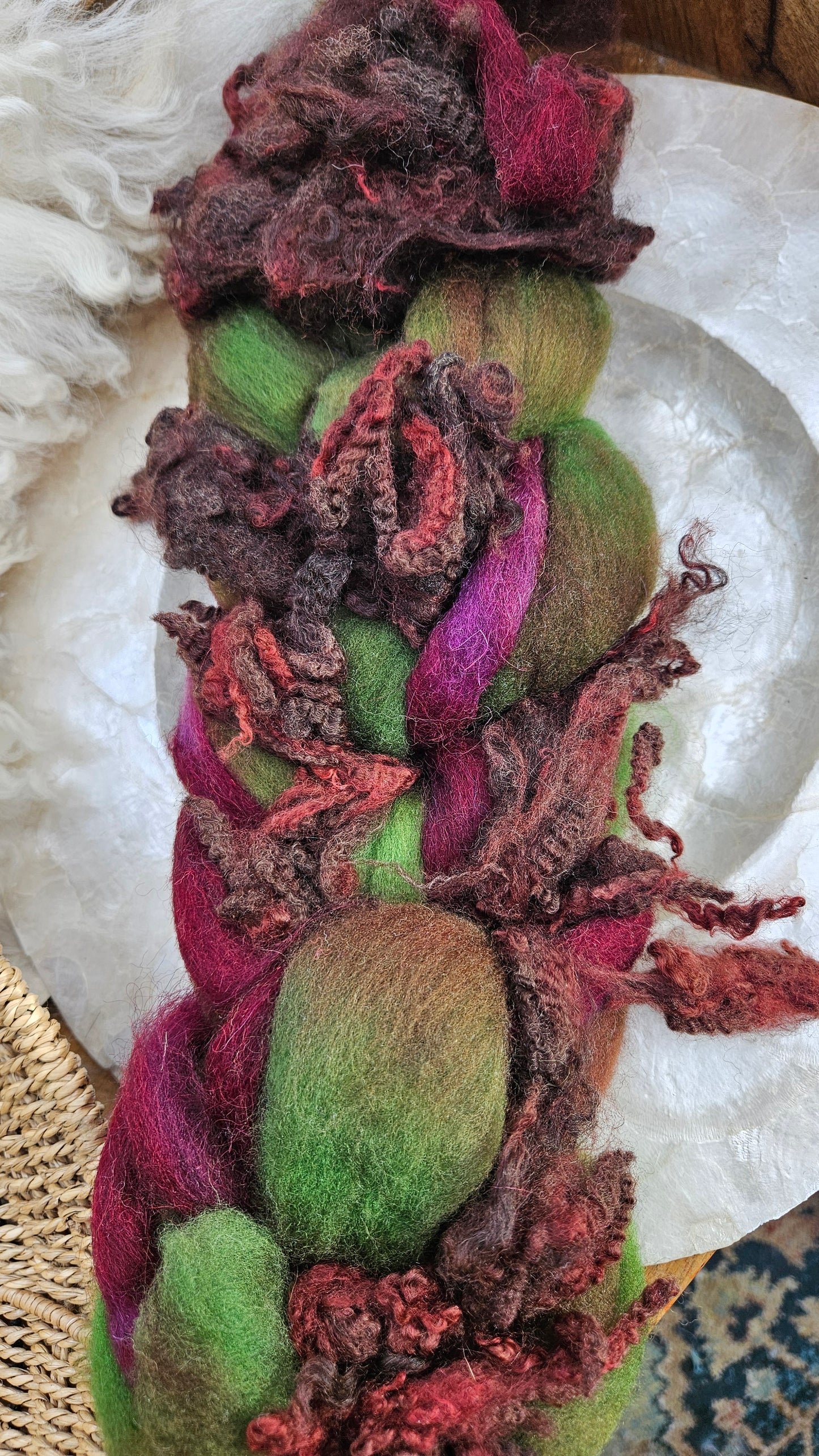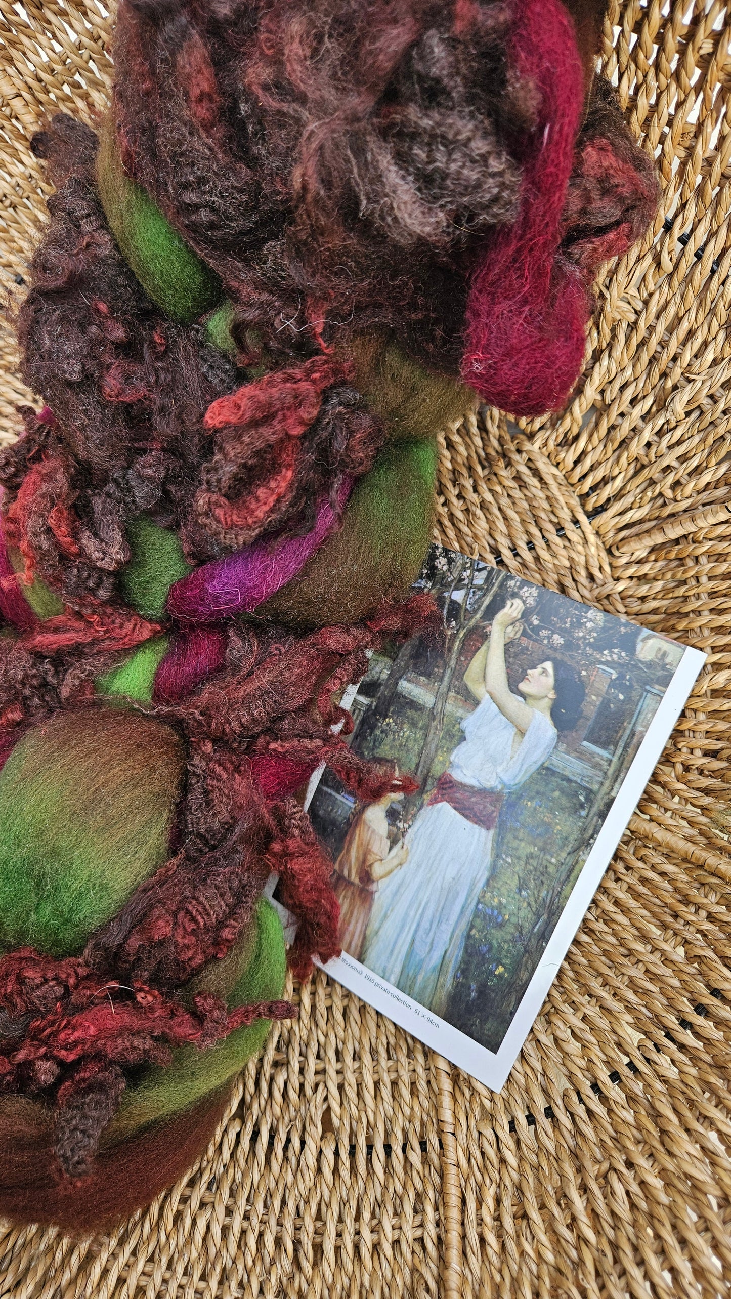 Inspired by the impressionist paintings of Waterhouse using his timeless fine art colorway pallete. Each wool roving braid includes multiple breeds and textures of high quality fiber for blending and carding into art batts or spinning into yarn directly from the braid.