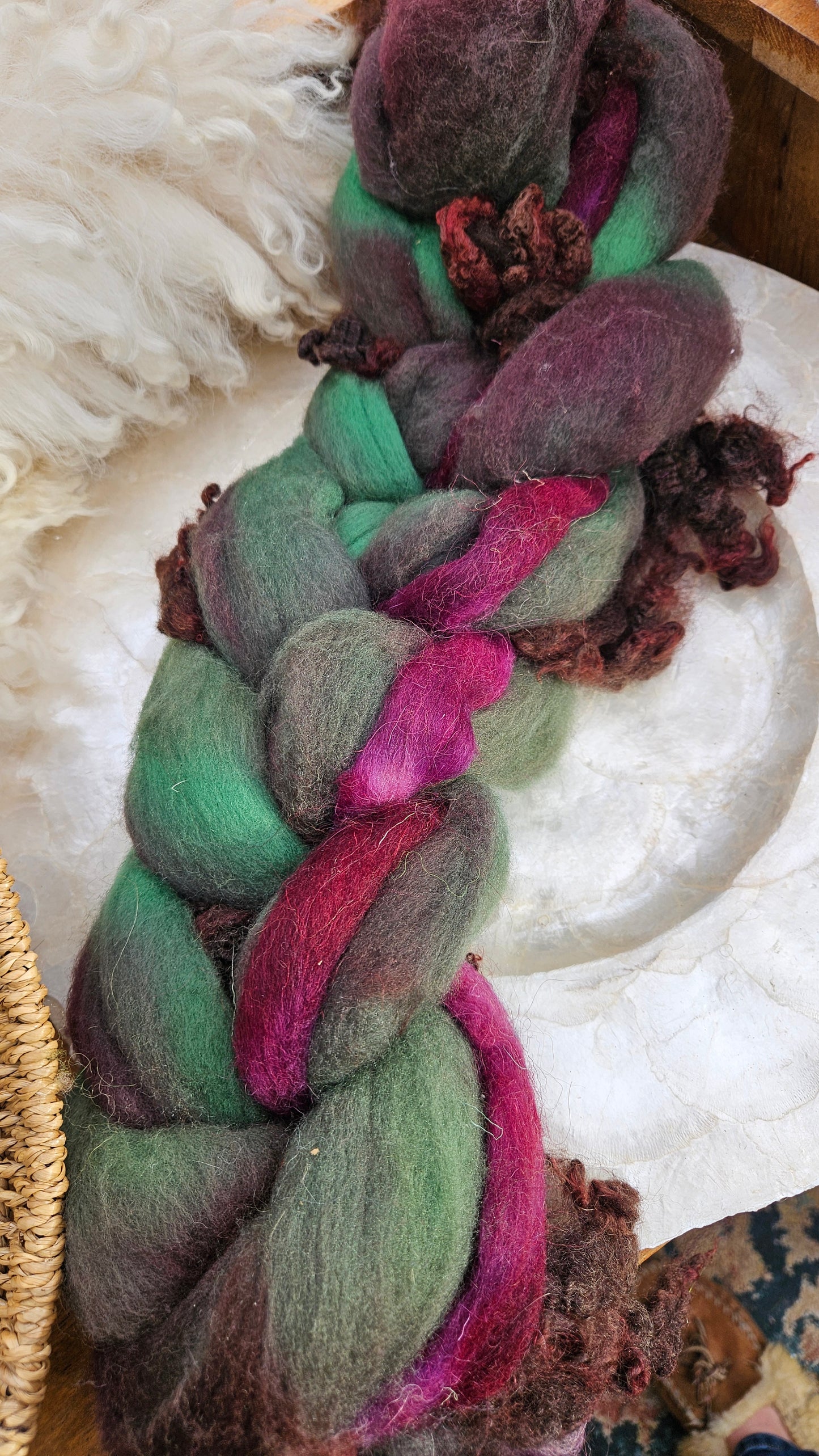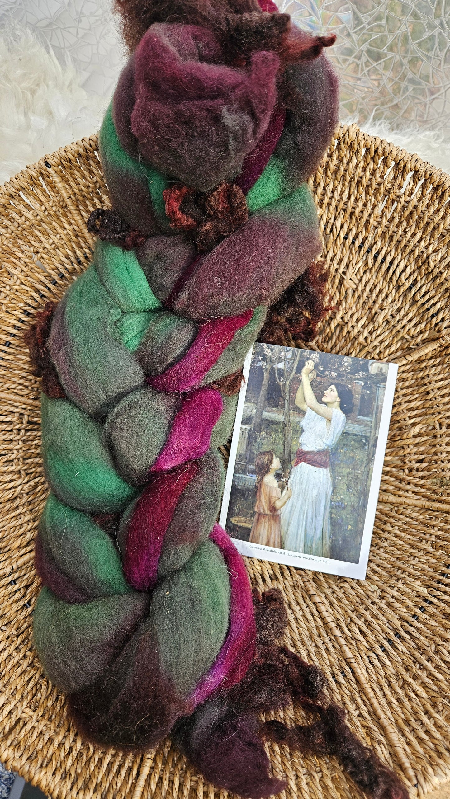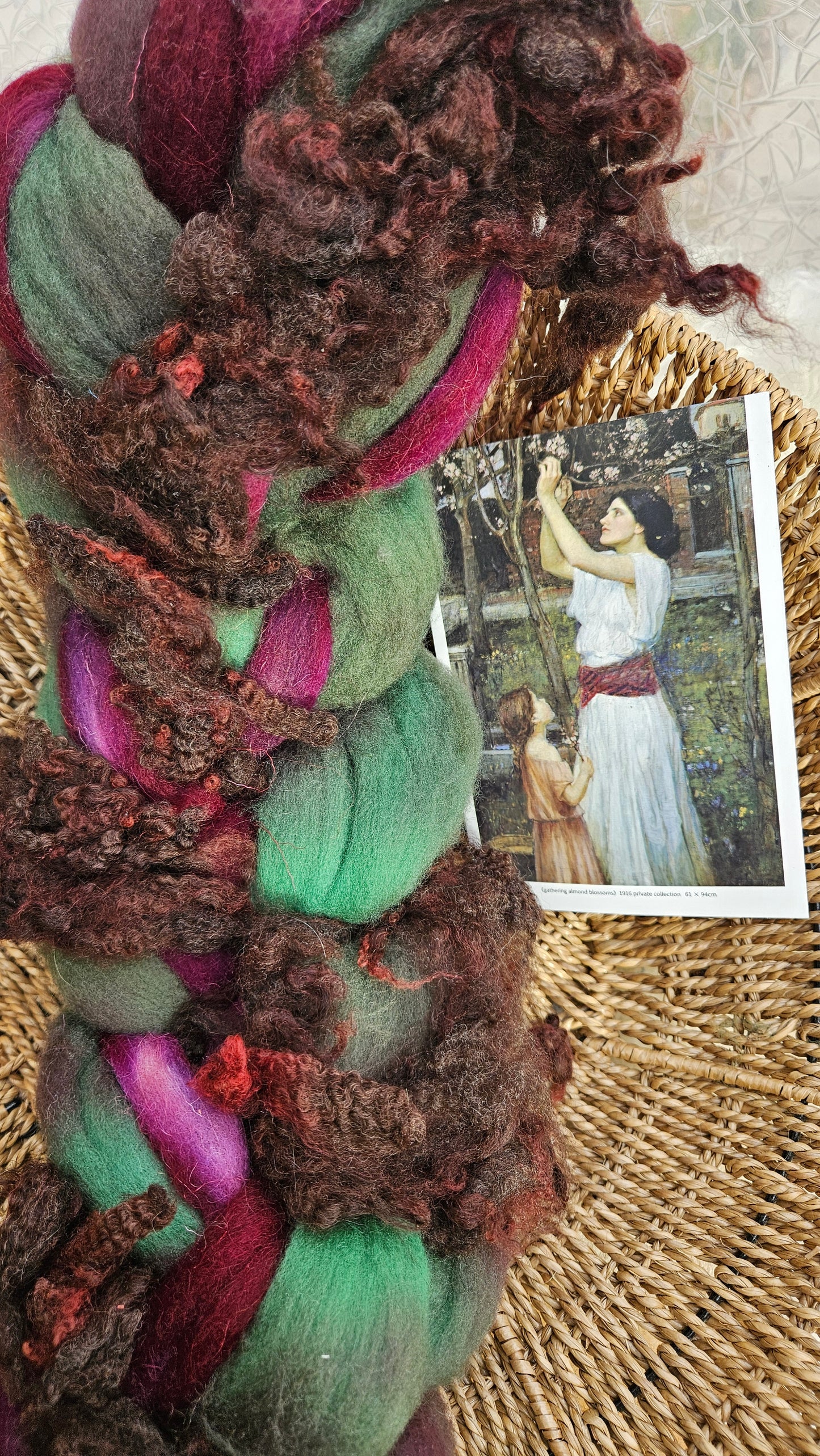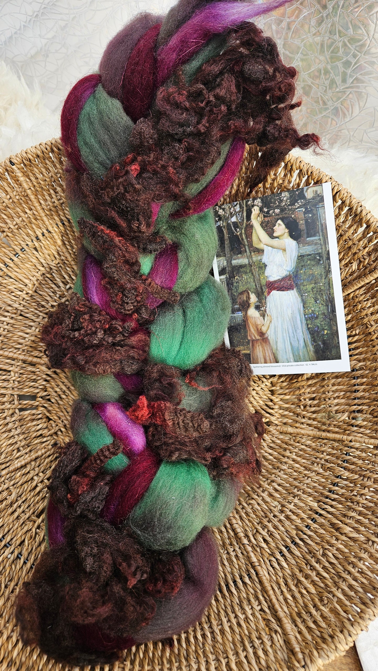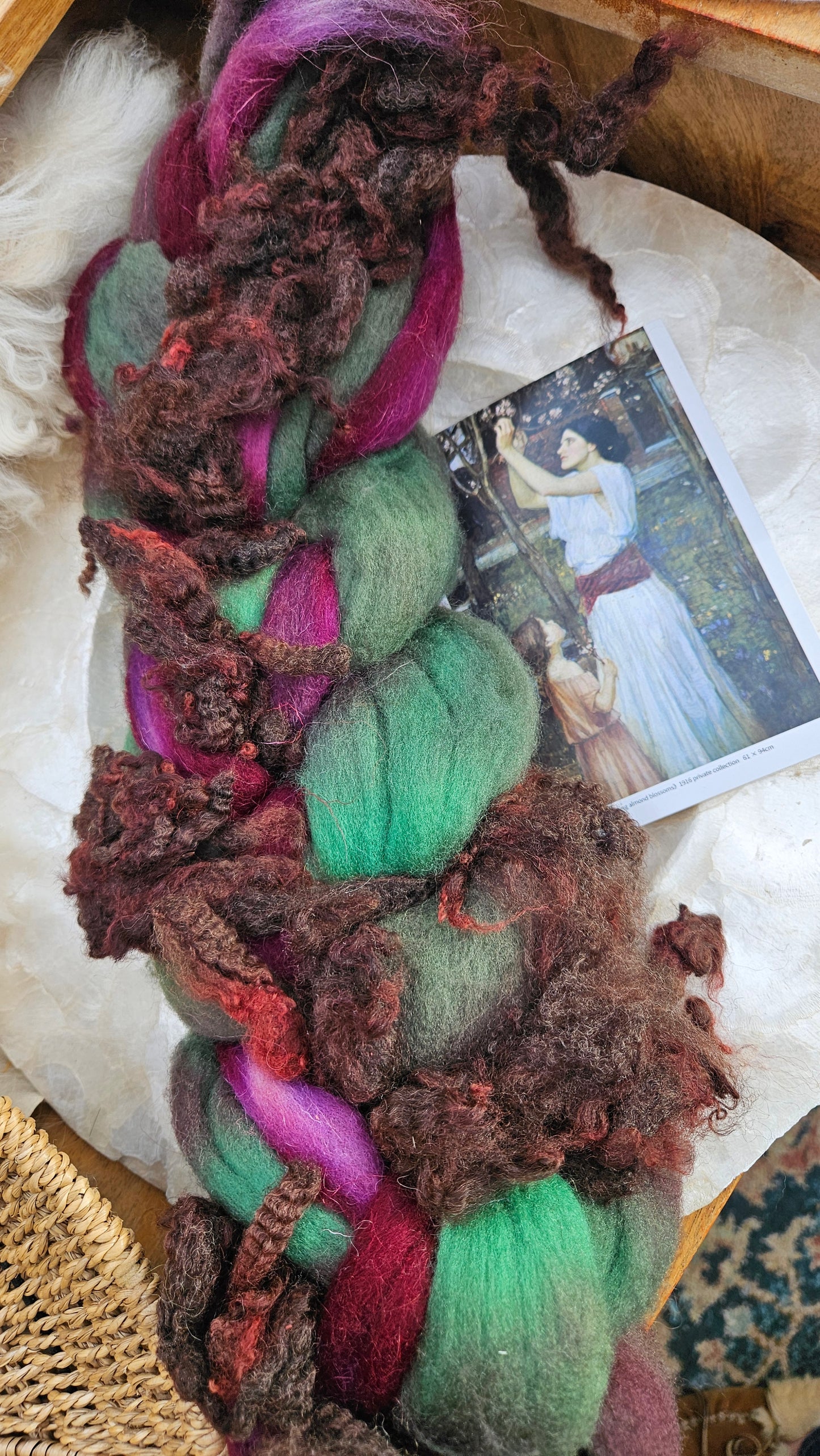 Inspired by the impressionist paintings of Waterhouse using his timeless fine art colorway pallete. Each wool roving braid includes multiple breeds and textures of high quality fiber for blending and carding into art batts or spinning into yarn directly from the braid.