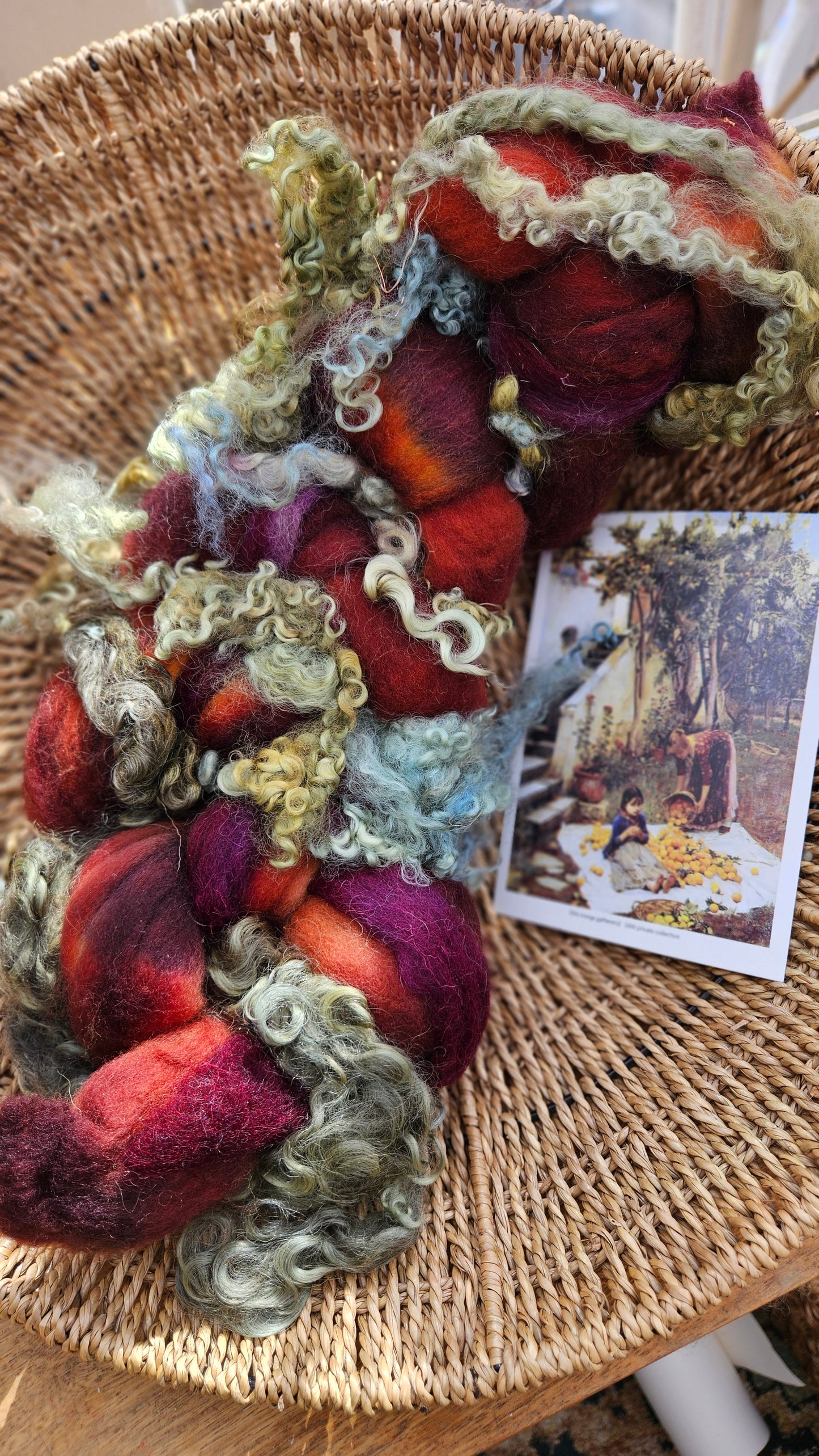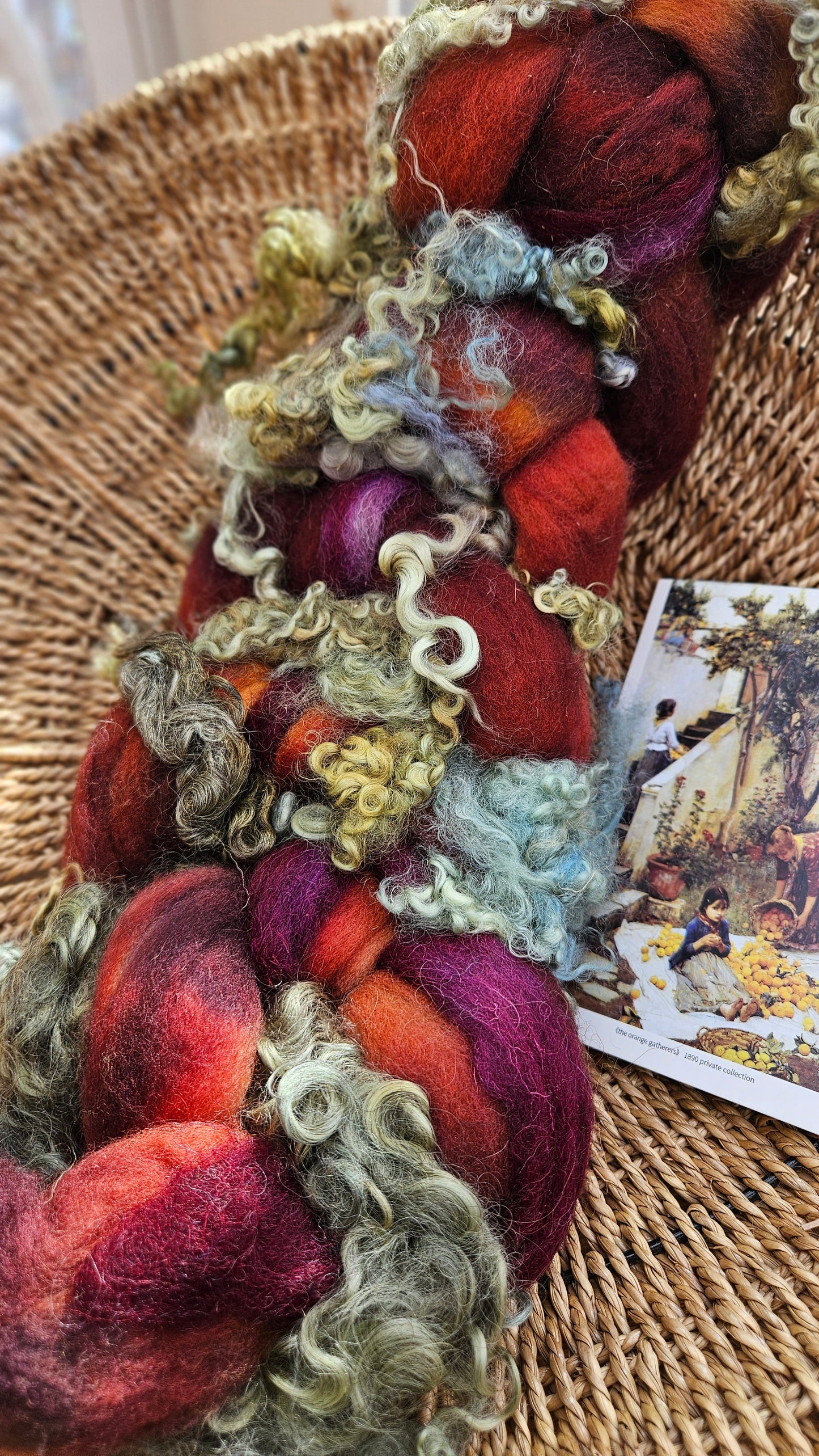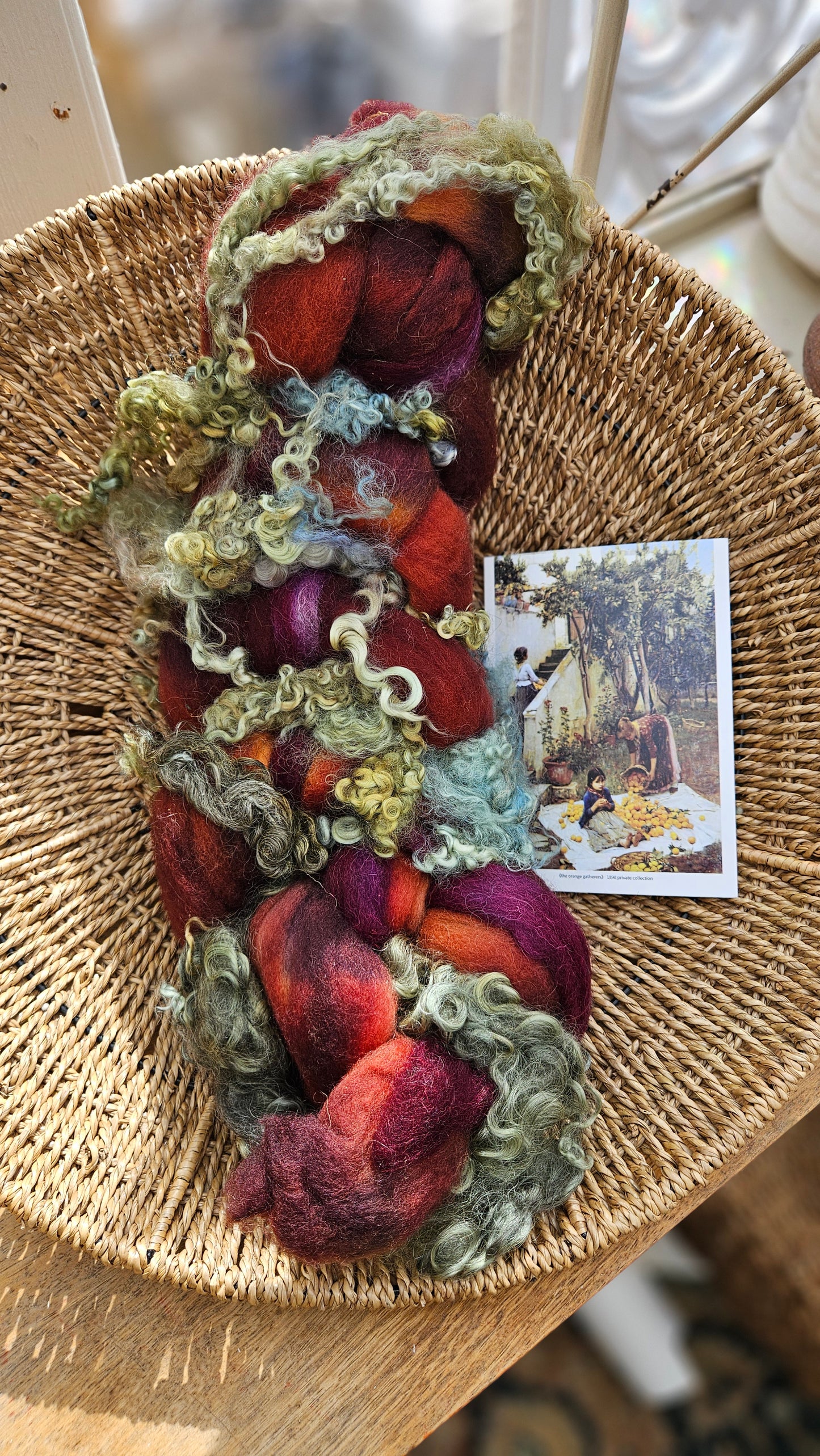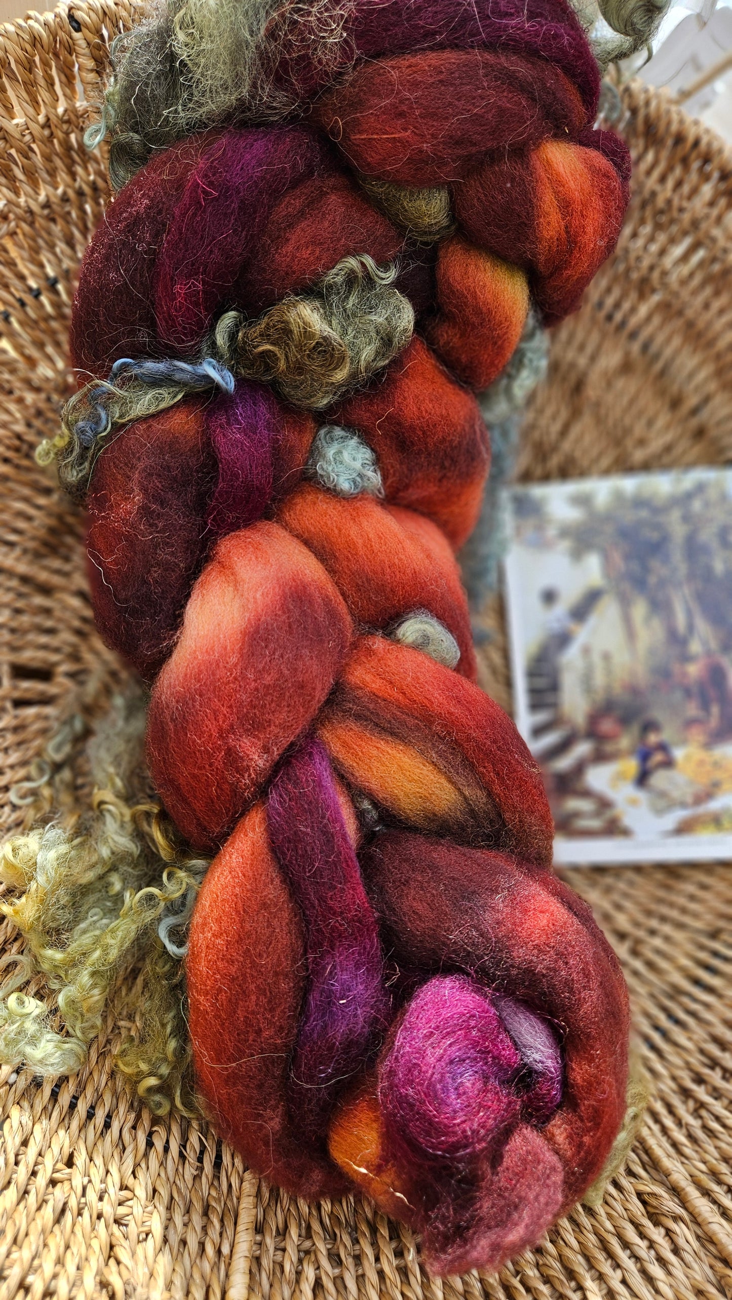 Inspired by the impressionist paintings of Waterhouse using his timeless fine art colorway pallete. Each wool roving braid includes multiple breeds and textures of high quality fiber for blending and carding into art batts or spinning into yarn directly from the braid.