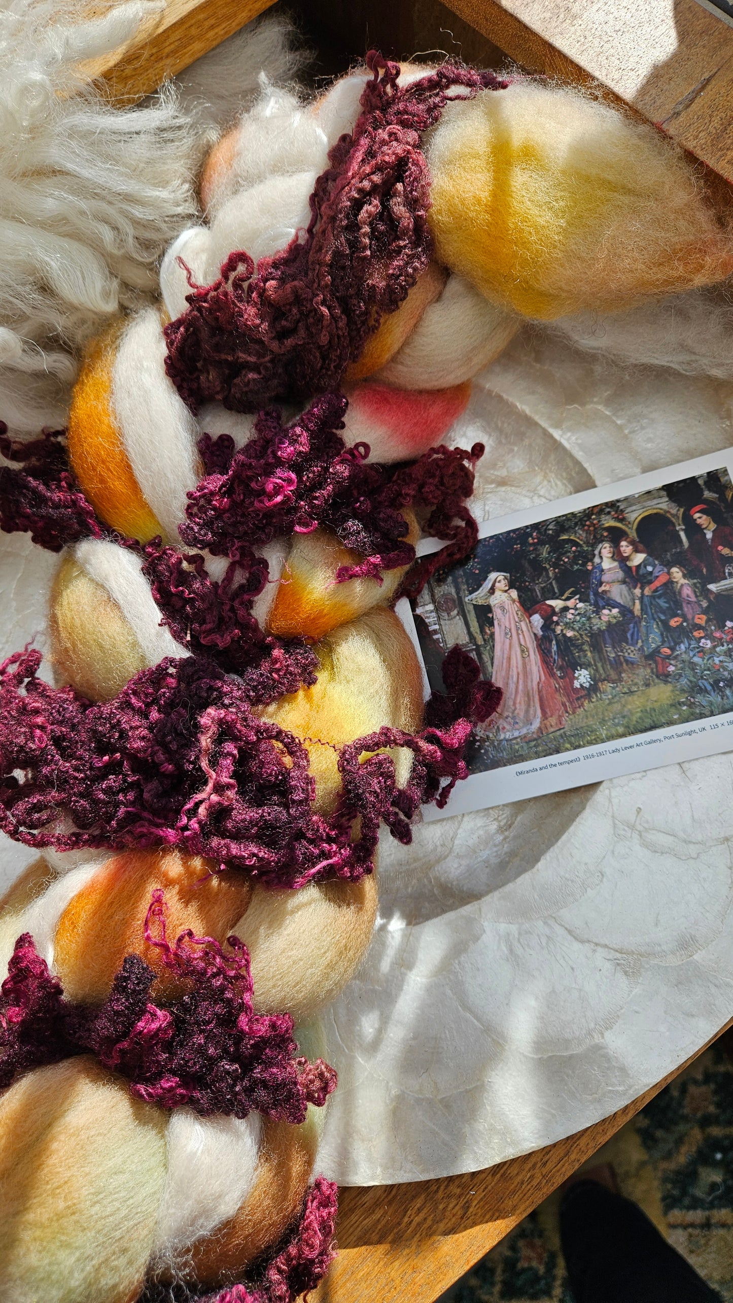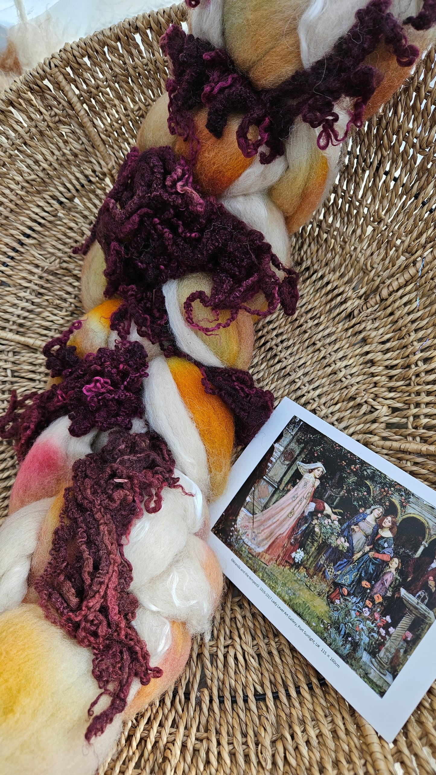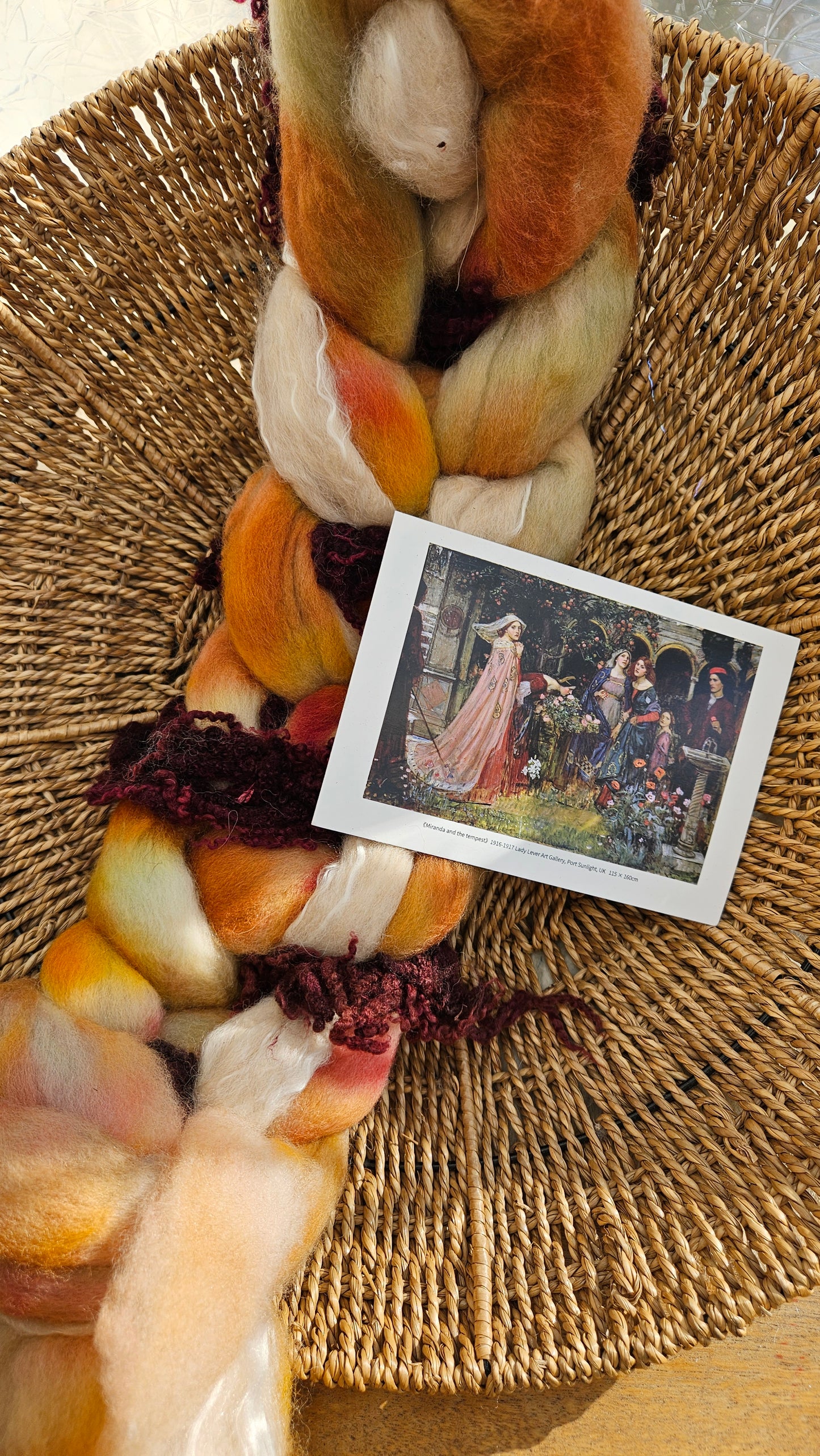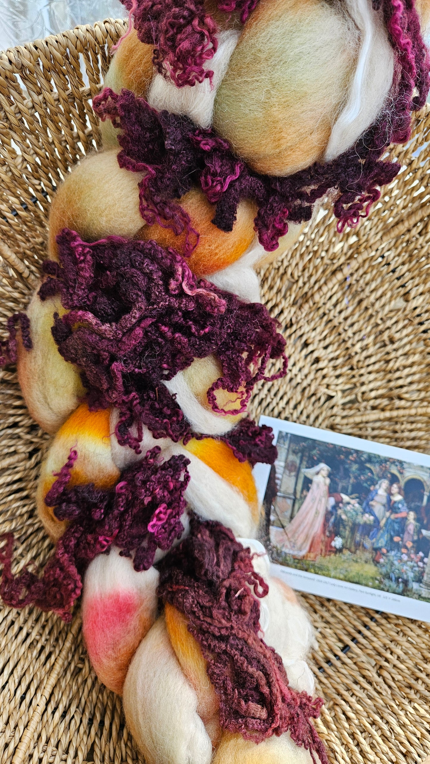 Inspired by the impressionist paintings of Waterhouse using his timeless fine art colorway pallete. Each wool roving braid includes multiple breeds and textures of high quality fiber for blending and carding into art batts or spinning into yarn directly from the braid.