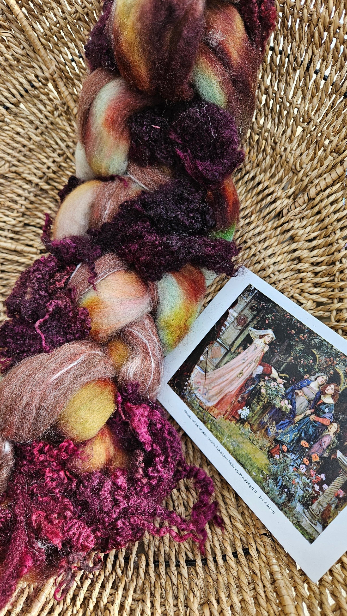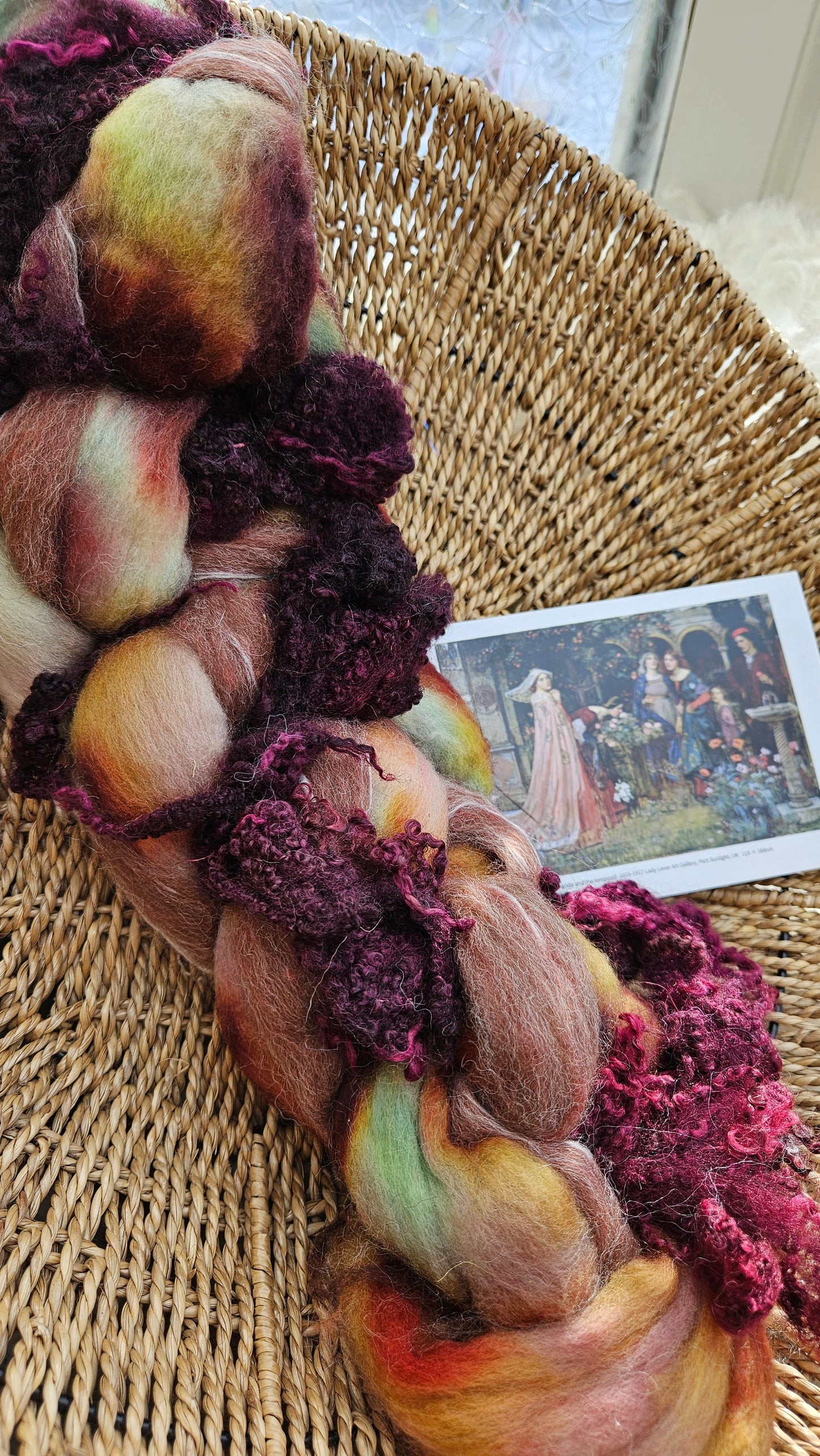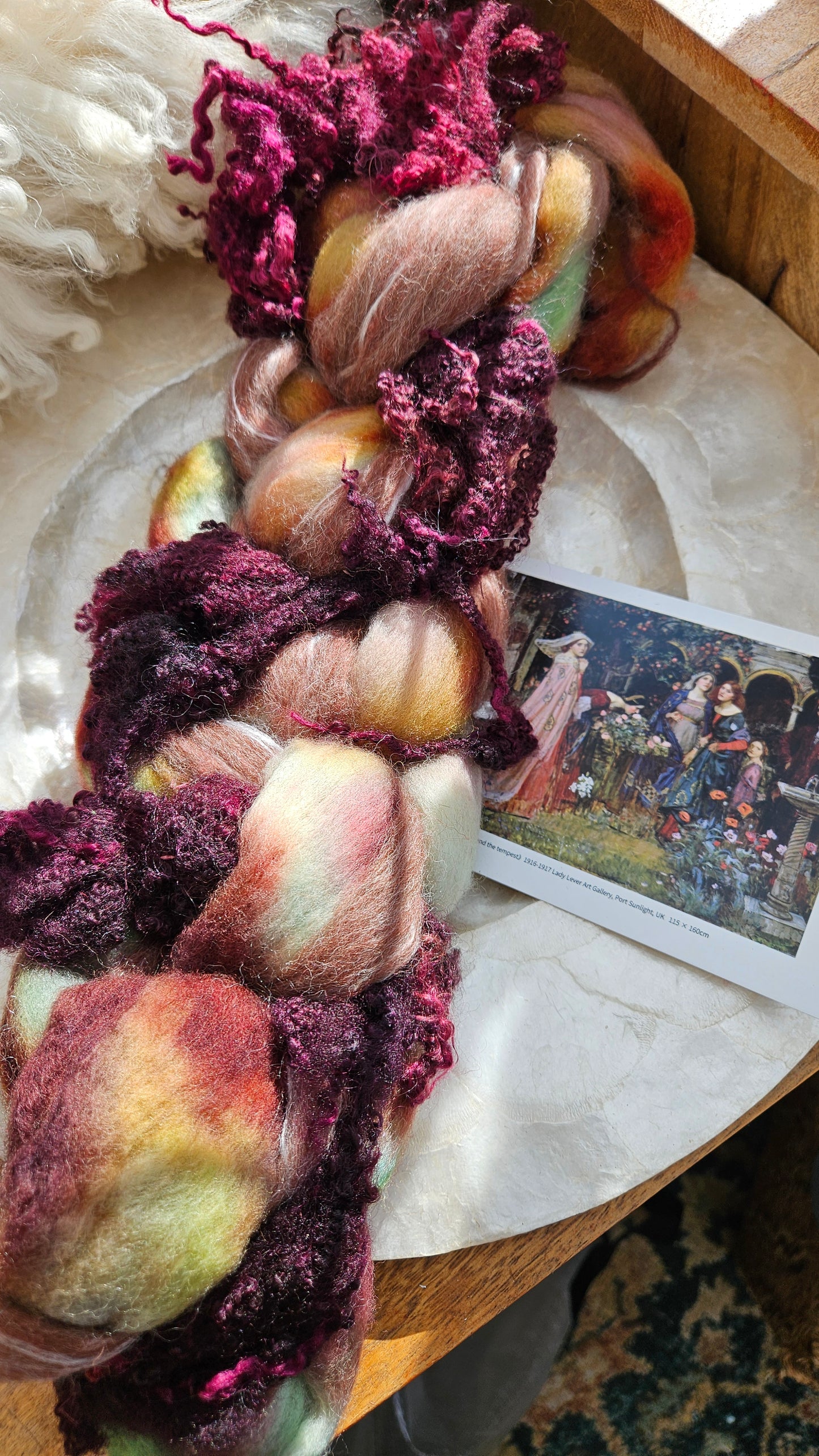 Inspired by the impressionist paintings of Waterhouse using his timeless fine art colorway pallete. Each wool roving braid includes multiple breeds and textures of high quality fiber for blending and carding into art batts or spinning into yarn directly from the braid.