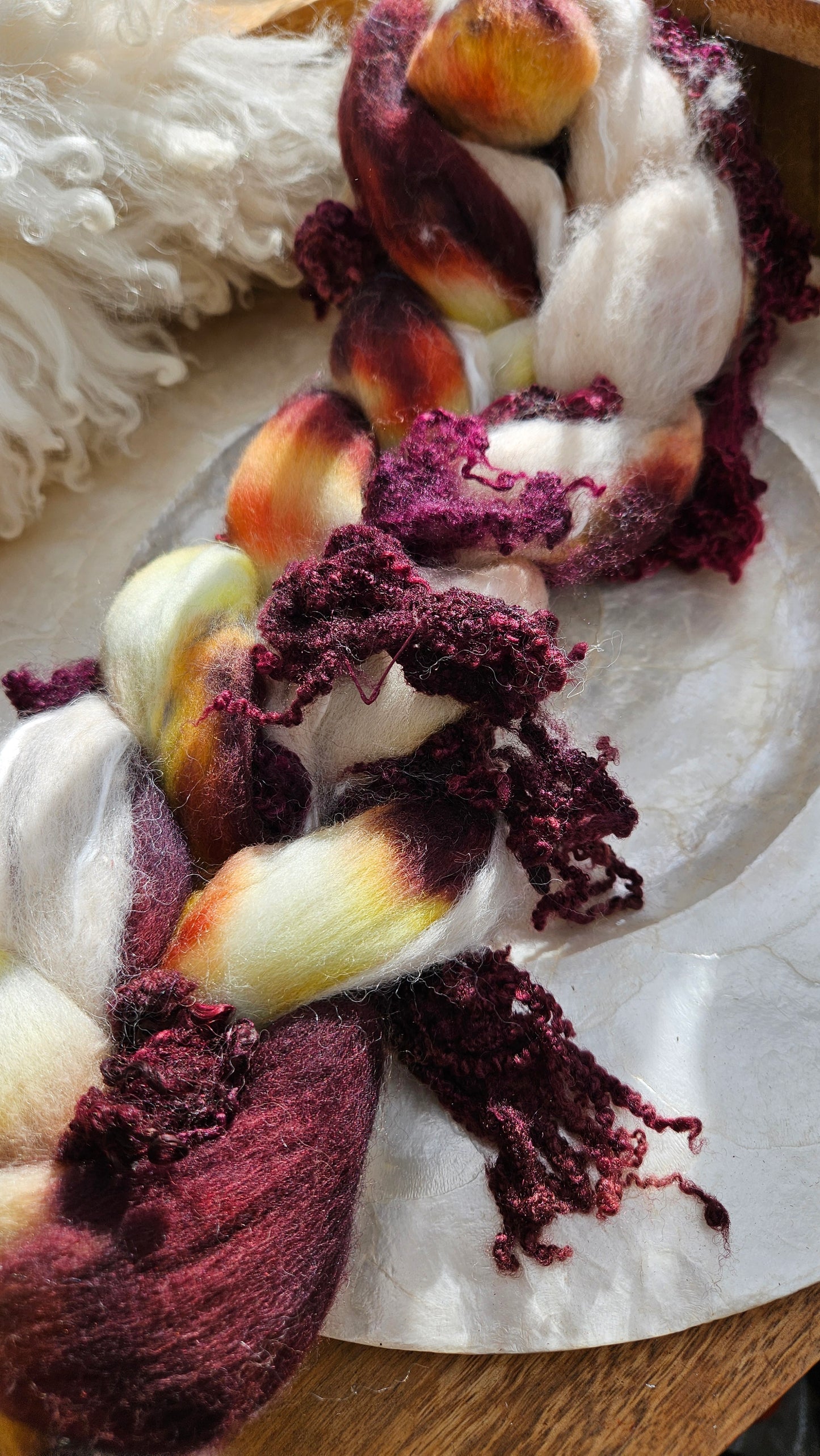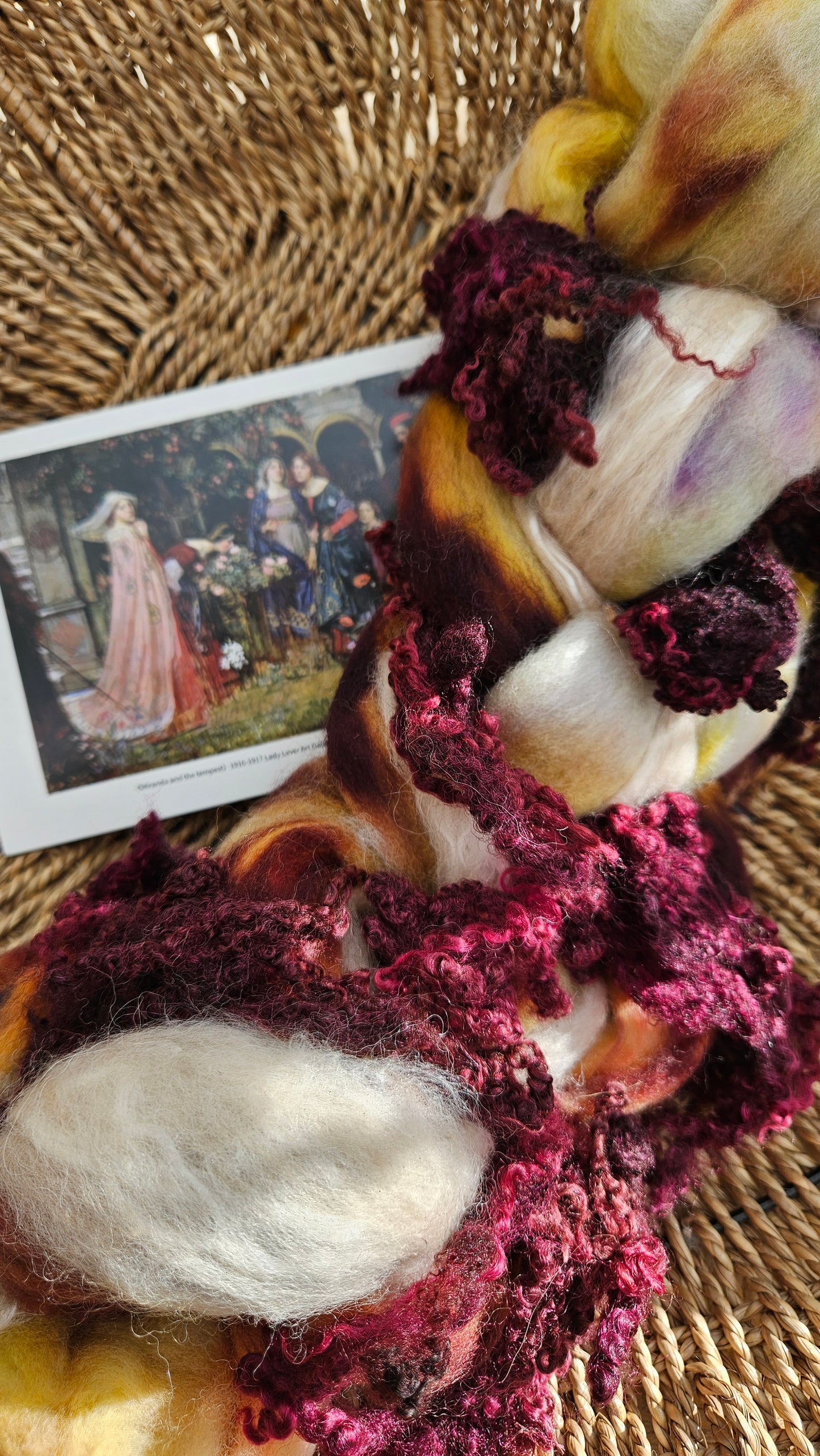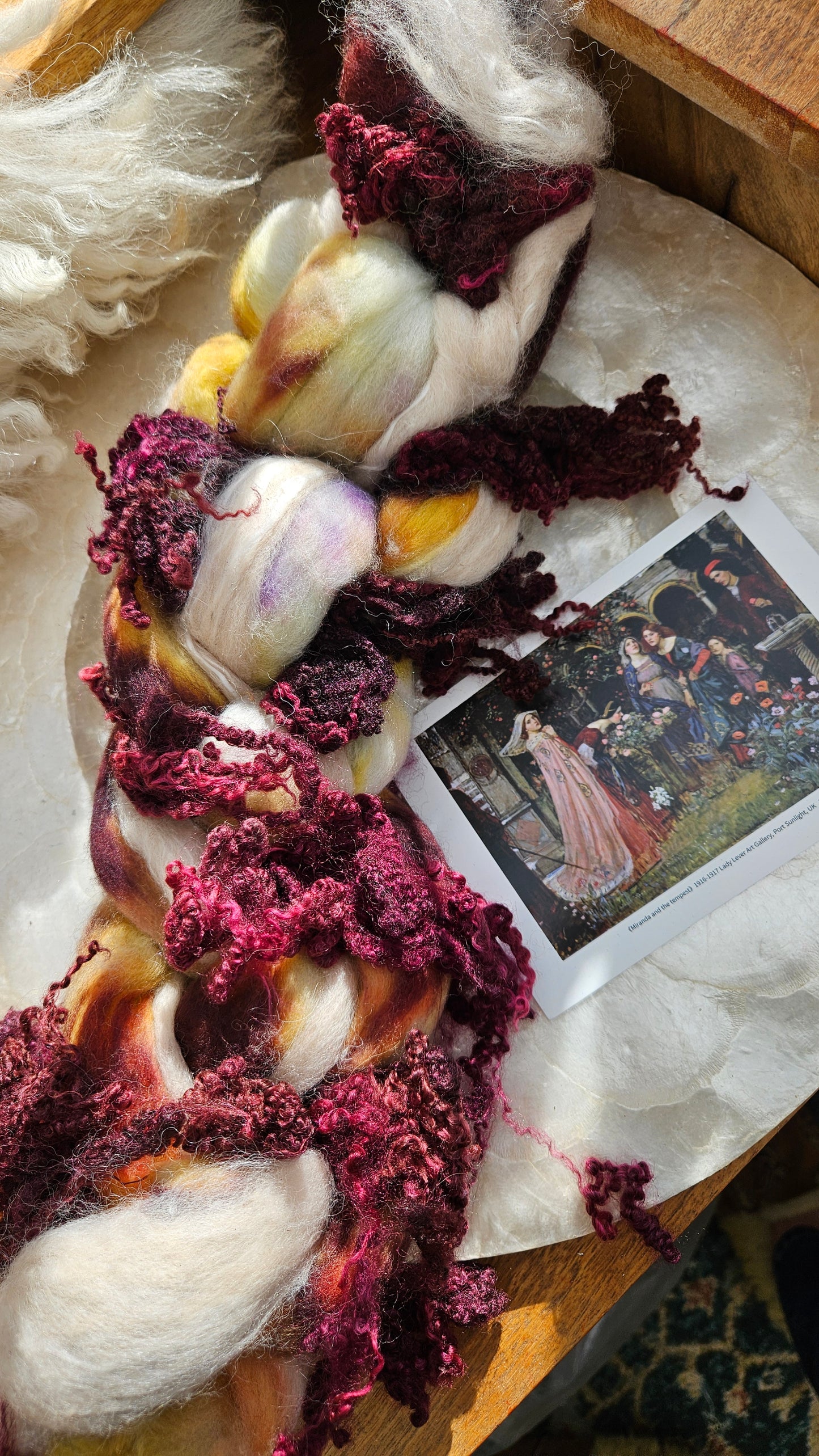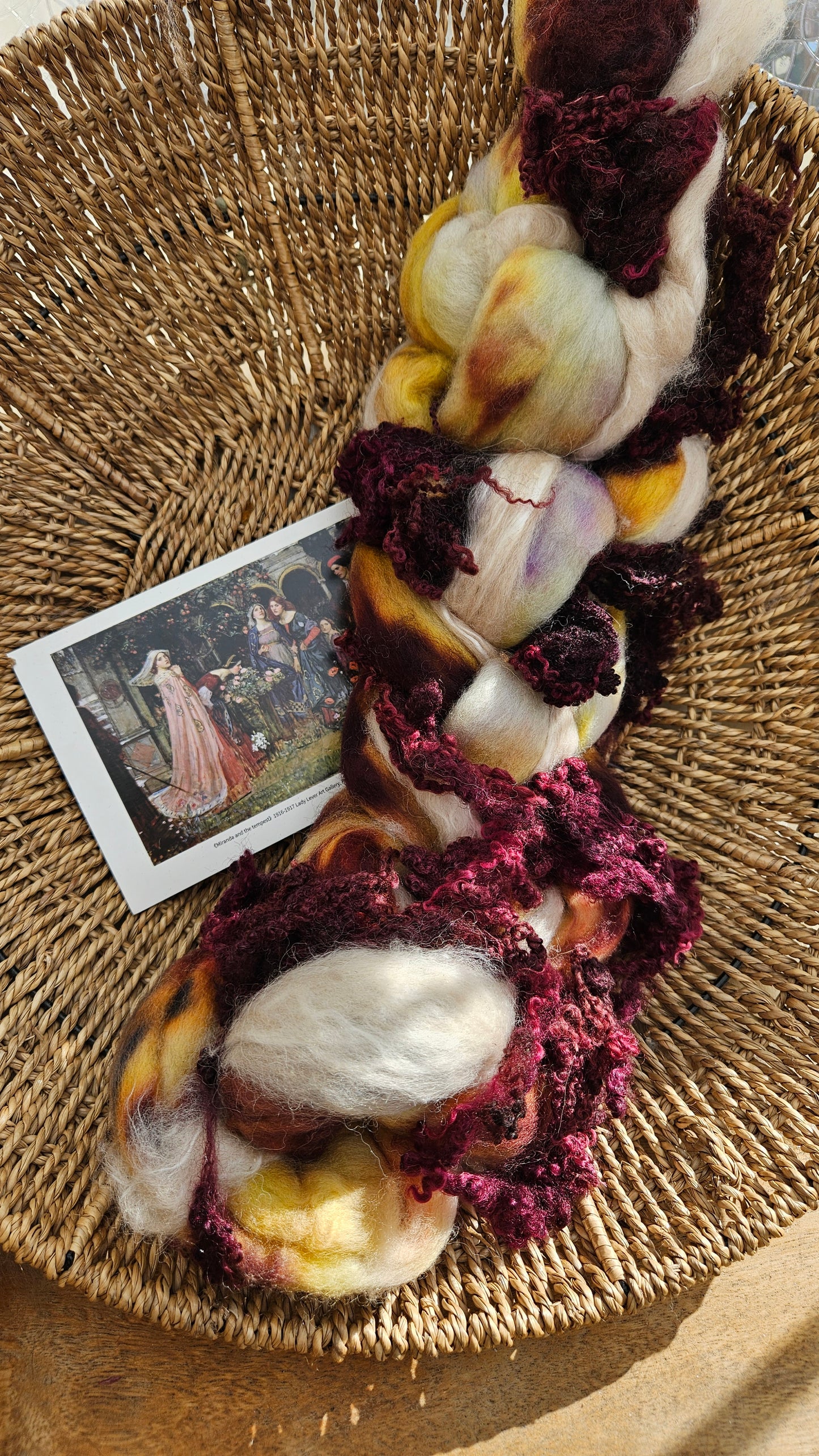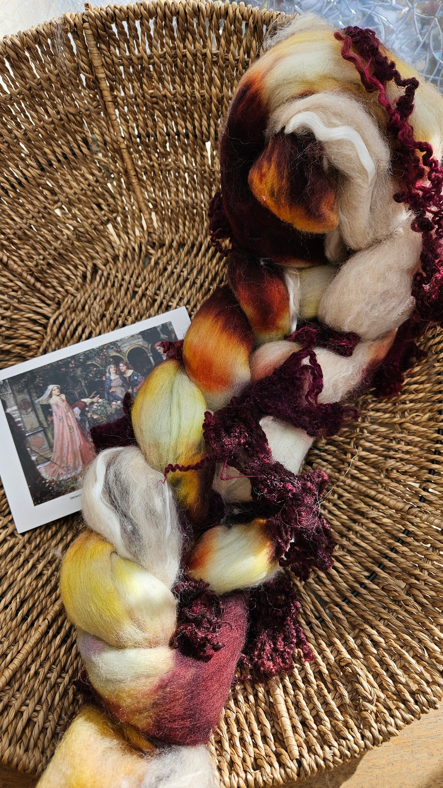 Inspired by the impressionist paintings of Waterhouse using his timeless fine art colorway pallete. Each wool roving braid includes multiple breeds and textures of high quality fiber for blending and carding into art batts or spinning into yarn directly from the braid.