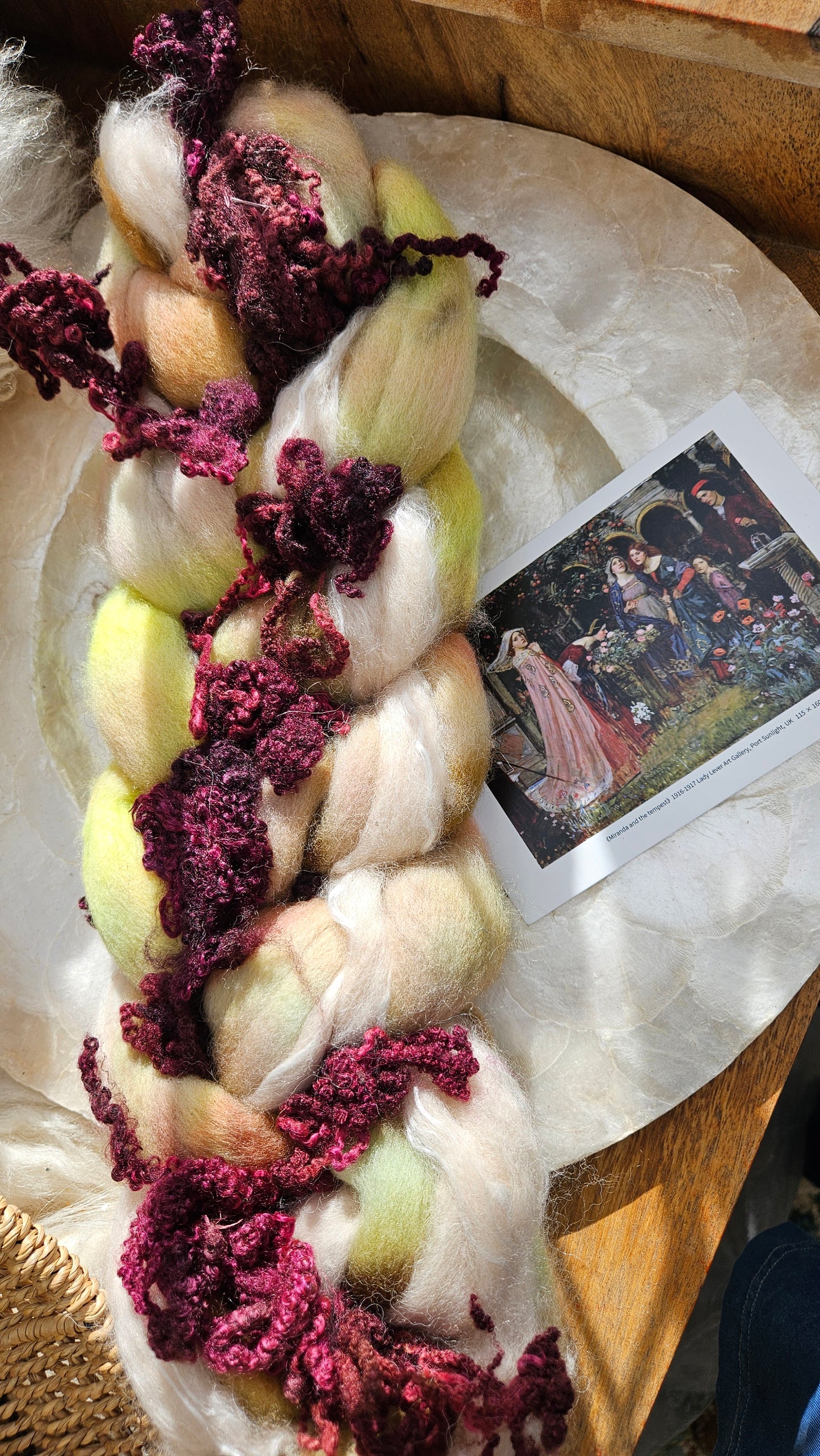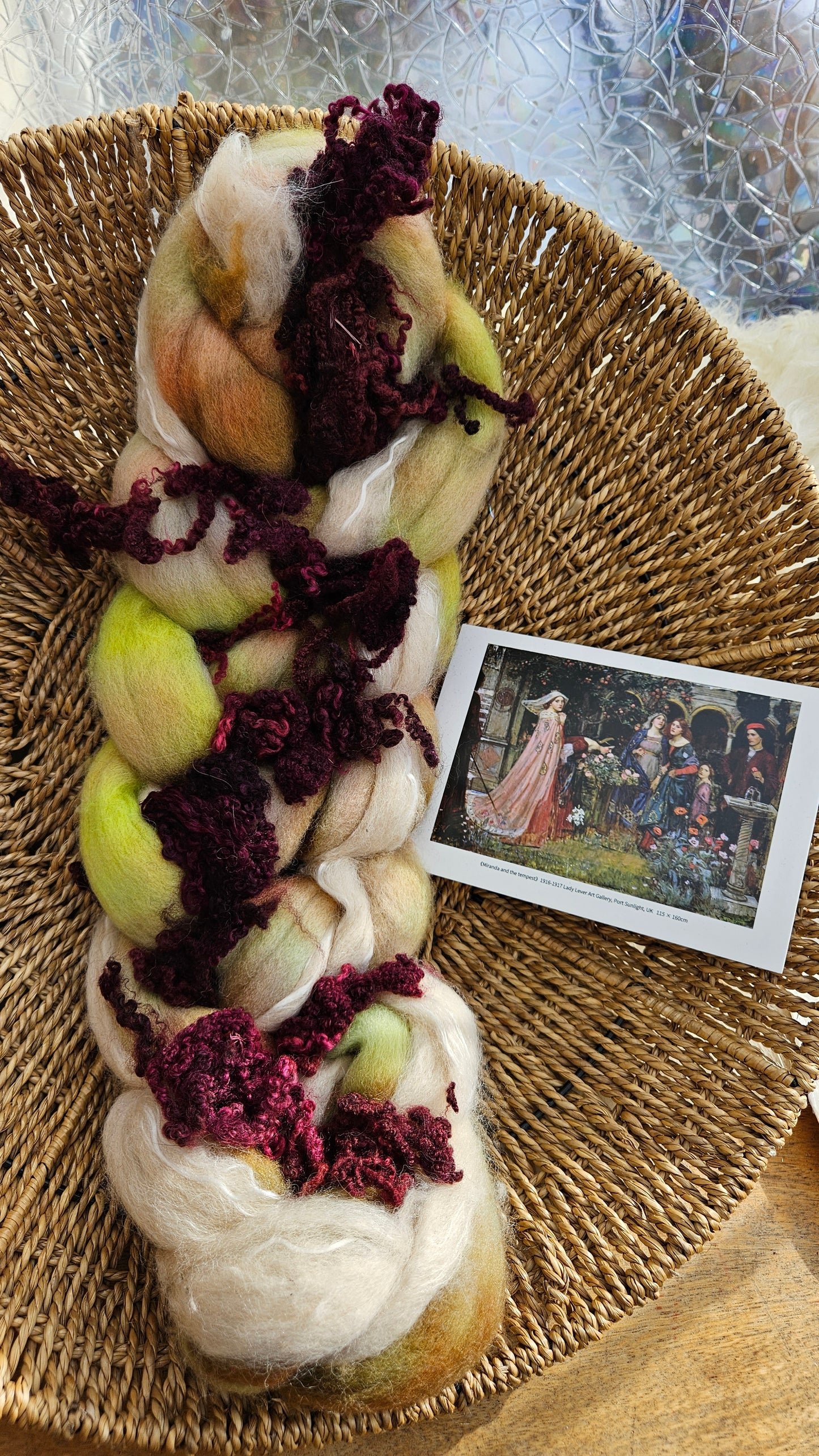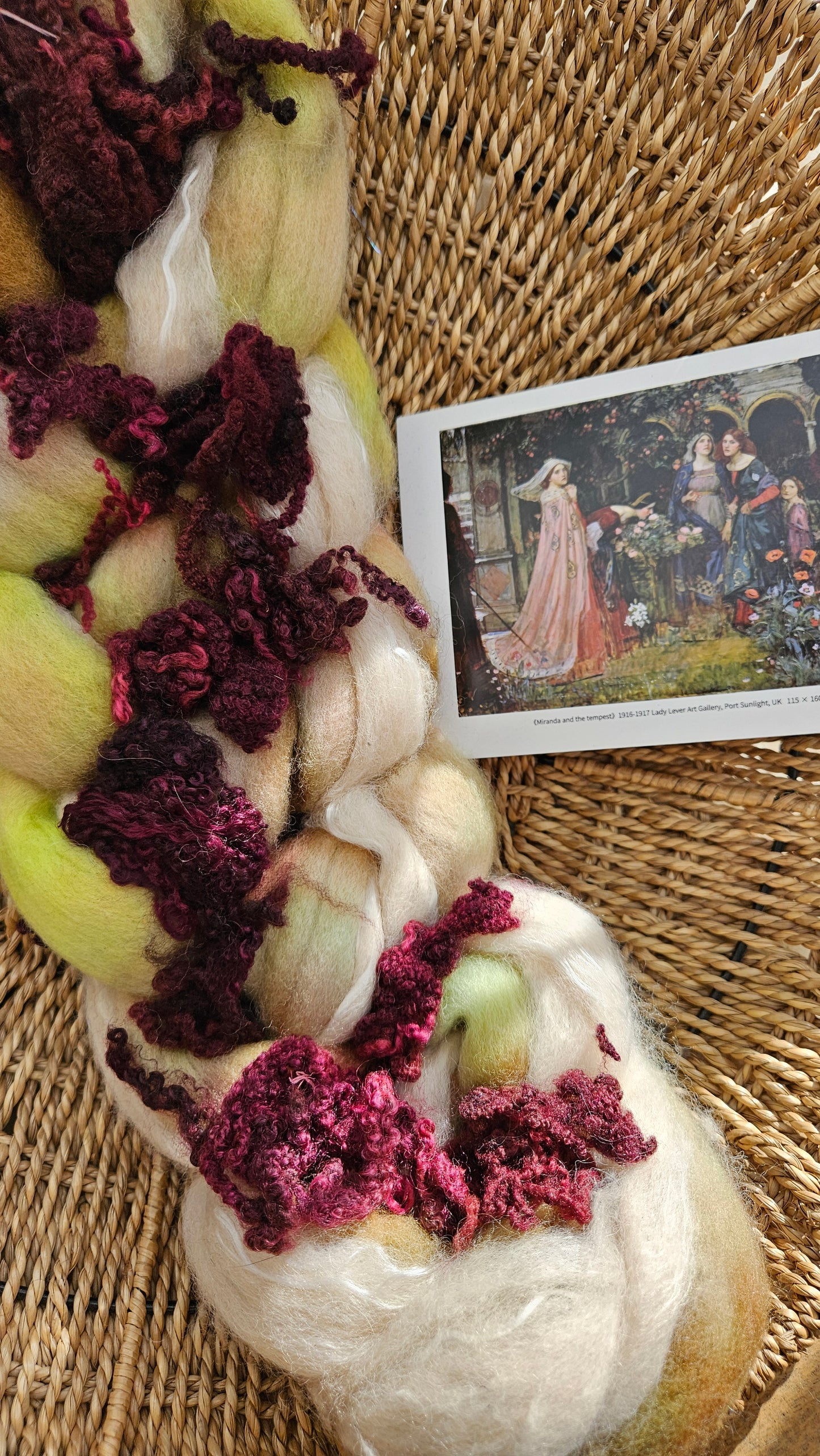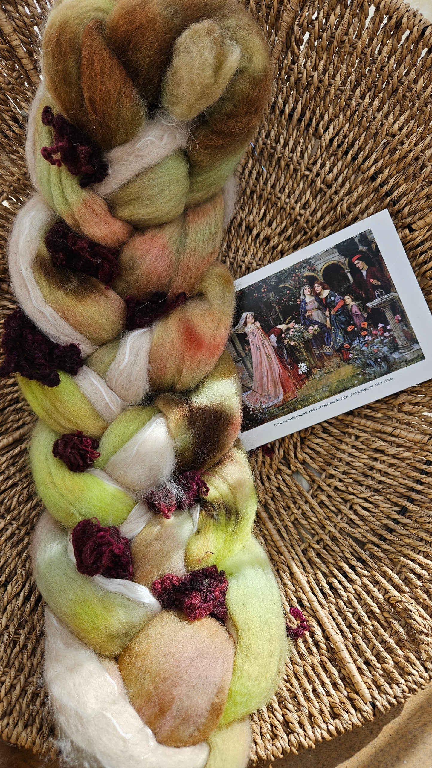 Inspired by the impressionist paintings of Waterhouse using his timeless fine art colorway pallete. Each wool roving braid includes multiple breeds and textures of high quality fiber for blending and carding into art batts or spinning into yarn directly from the braid.