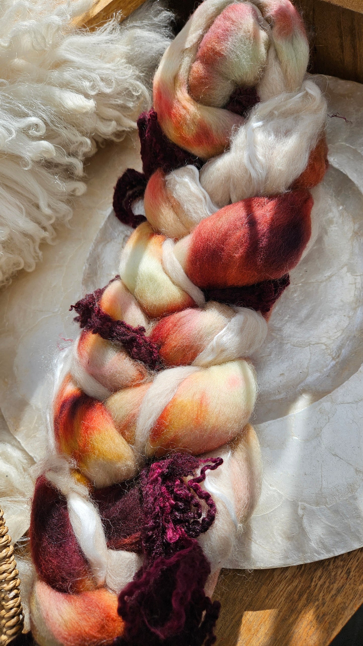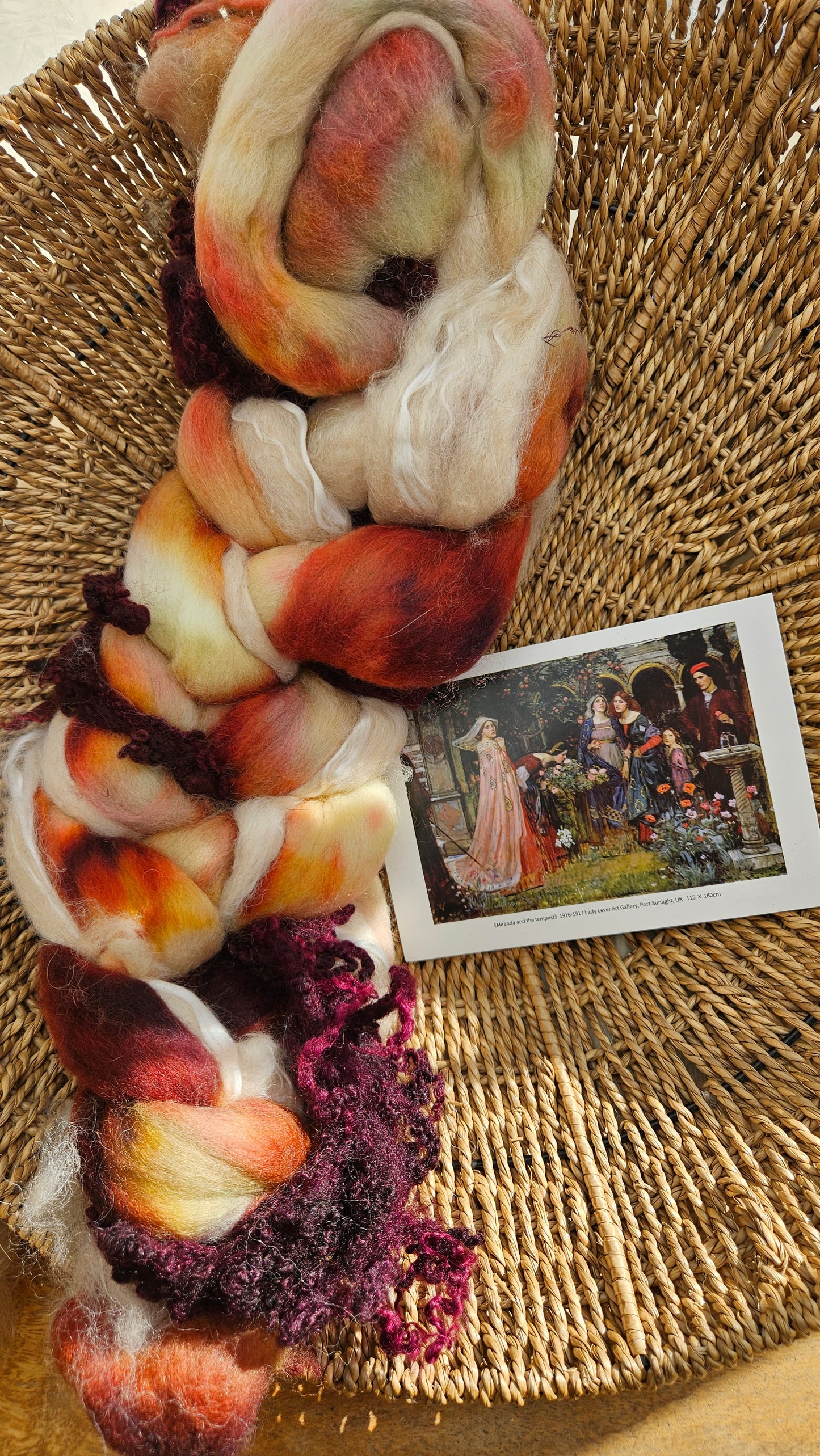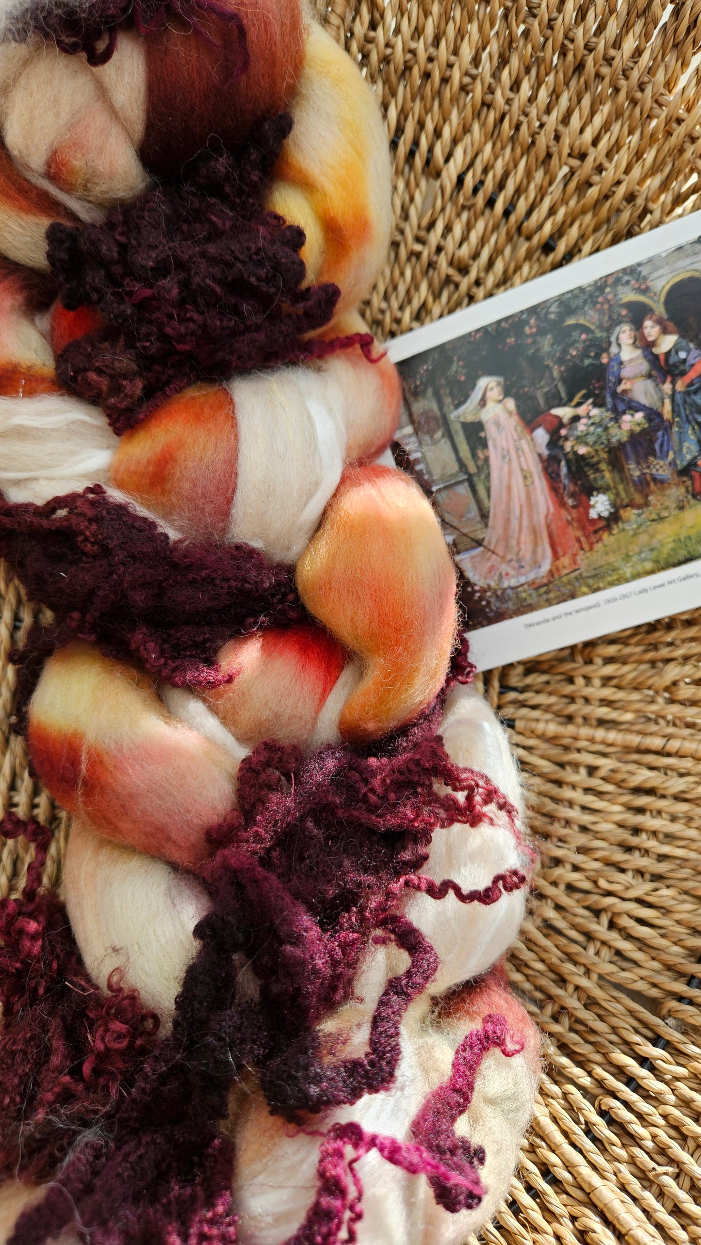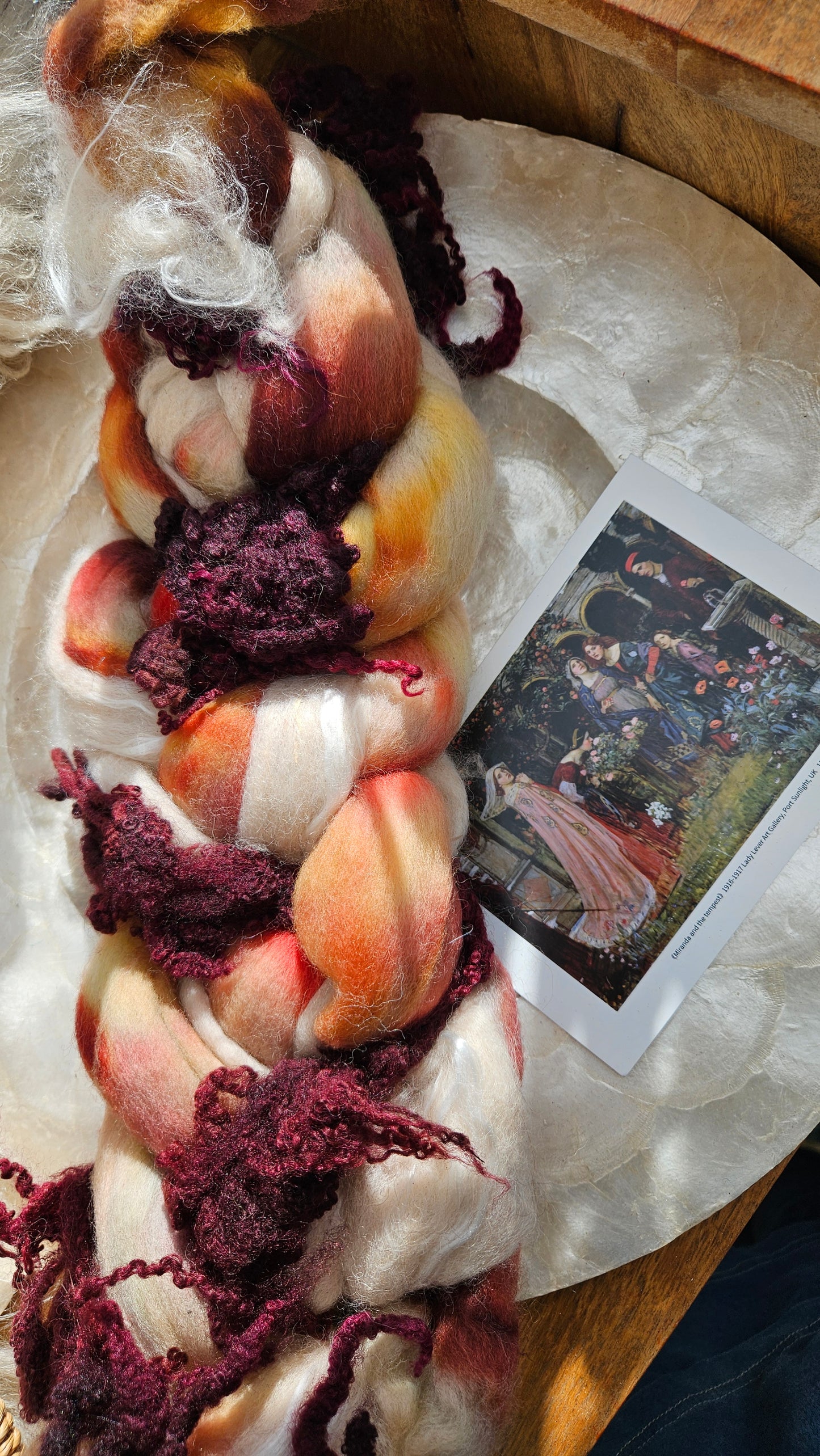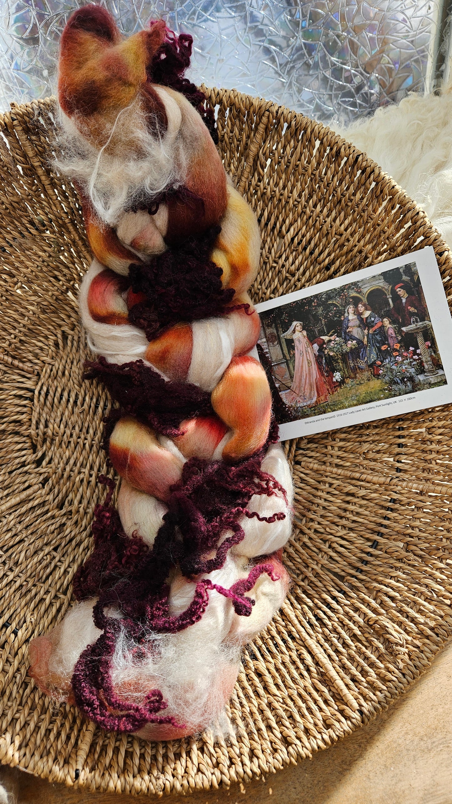 Inspired by the impressionist paintings of Waterhouse using his timeless fine art colorway pallete. Each wool roving braid includes multiple breeds and textures of high quality fiber for blending and carding into art batts or spinning into yarn directly from the braid.