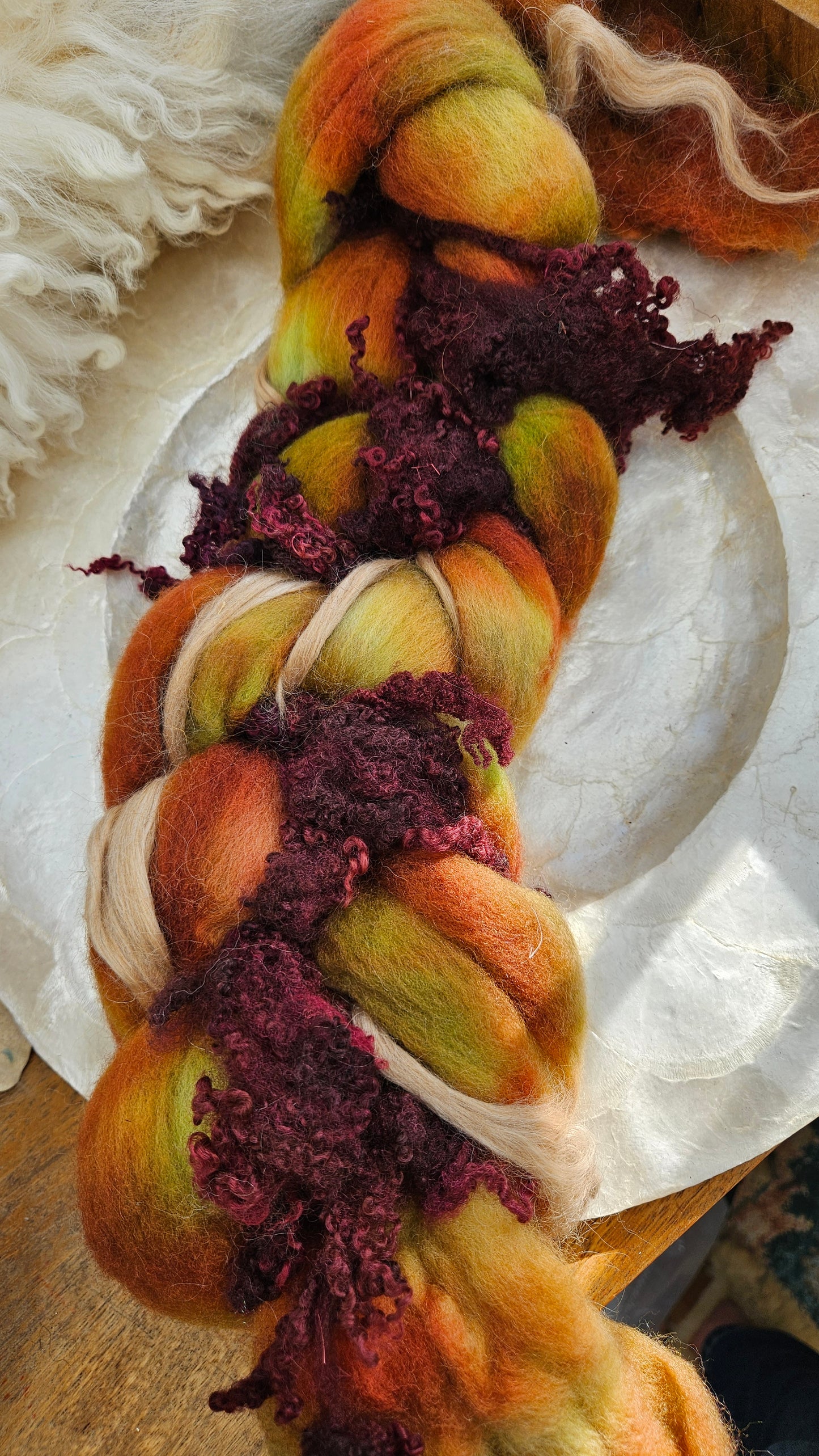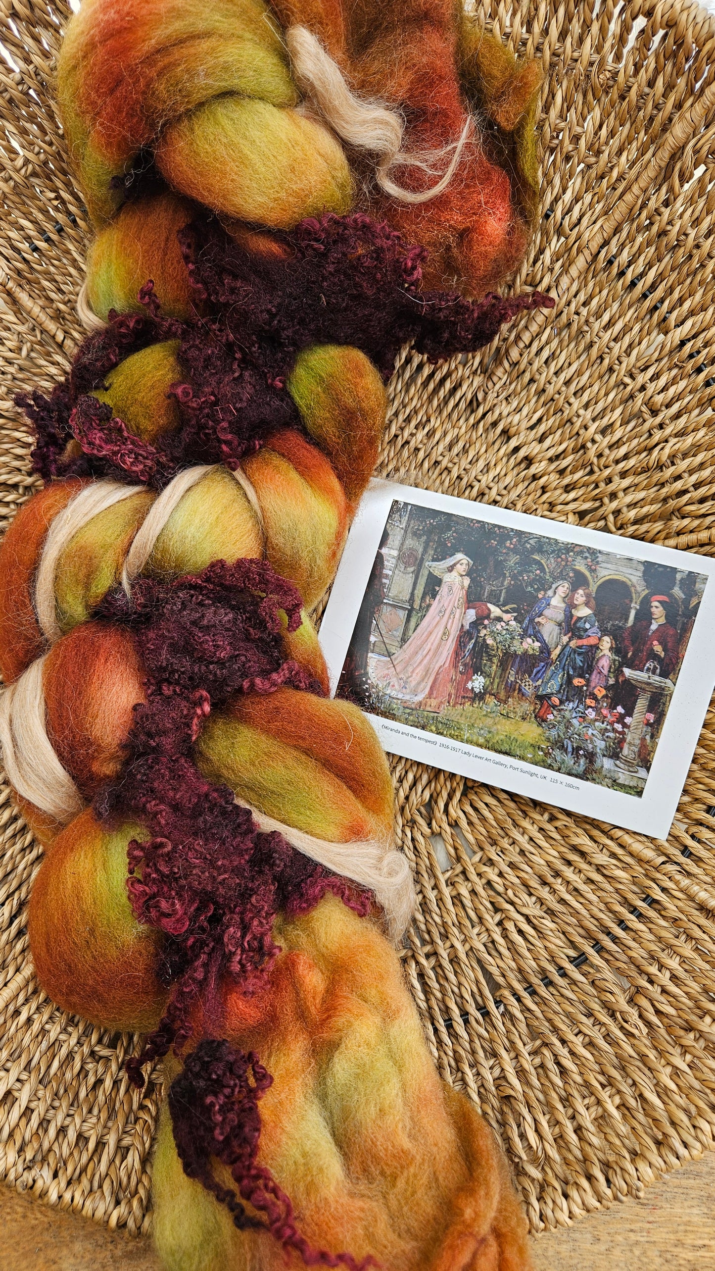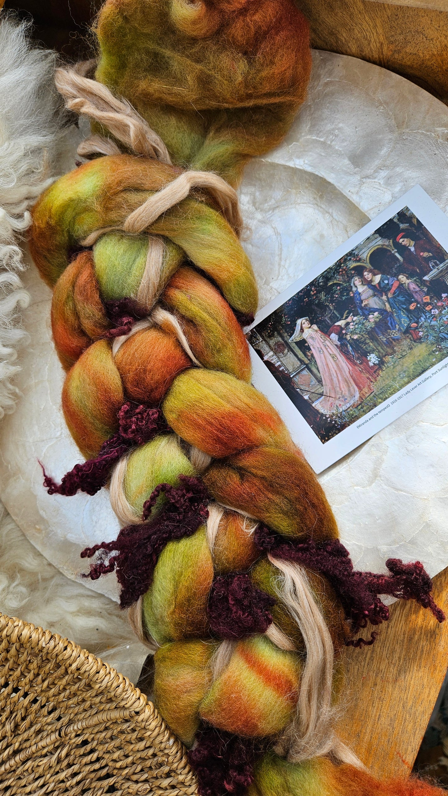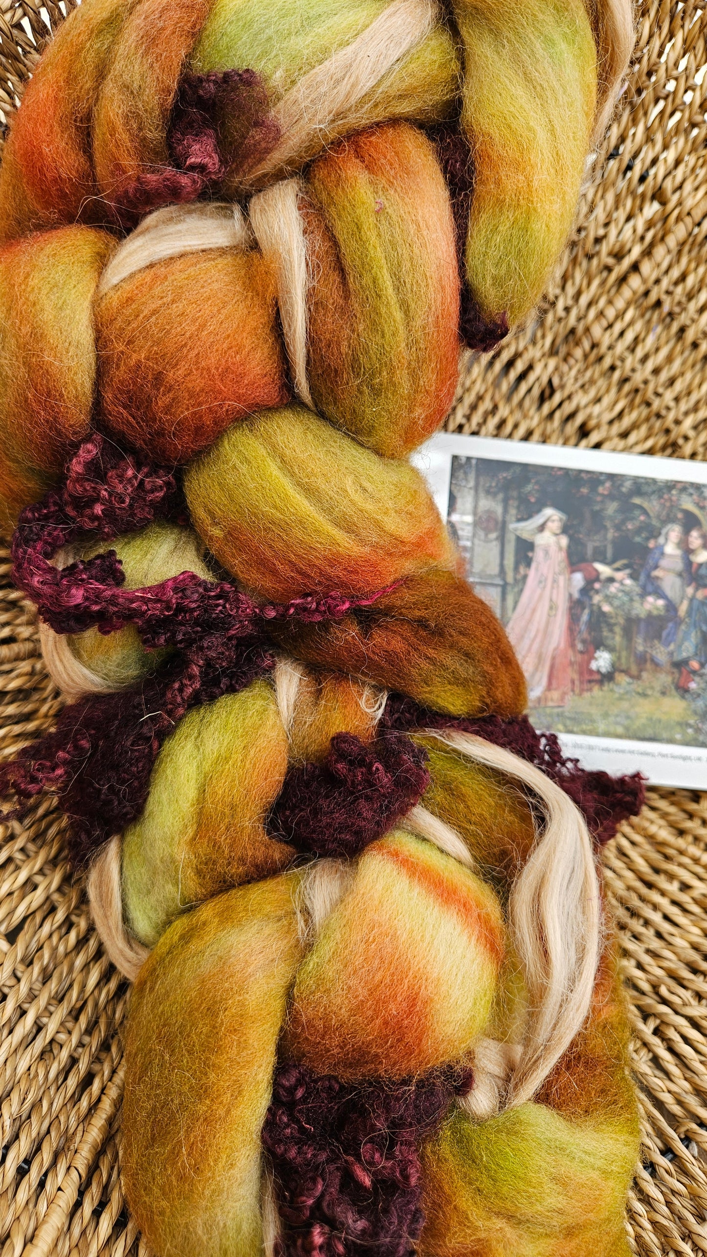 Inspired by the impressionist paintings of Waterhouse using his timeless fine art colorway pallete. Each wool roving braid includes multiple breeds and textures of high quality fiber for blending and carding into art batts or spinning into yarn directly from the braid.