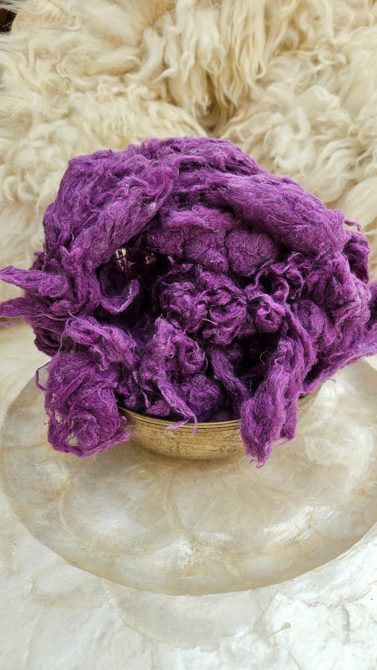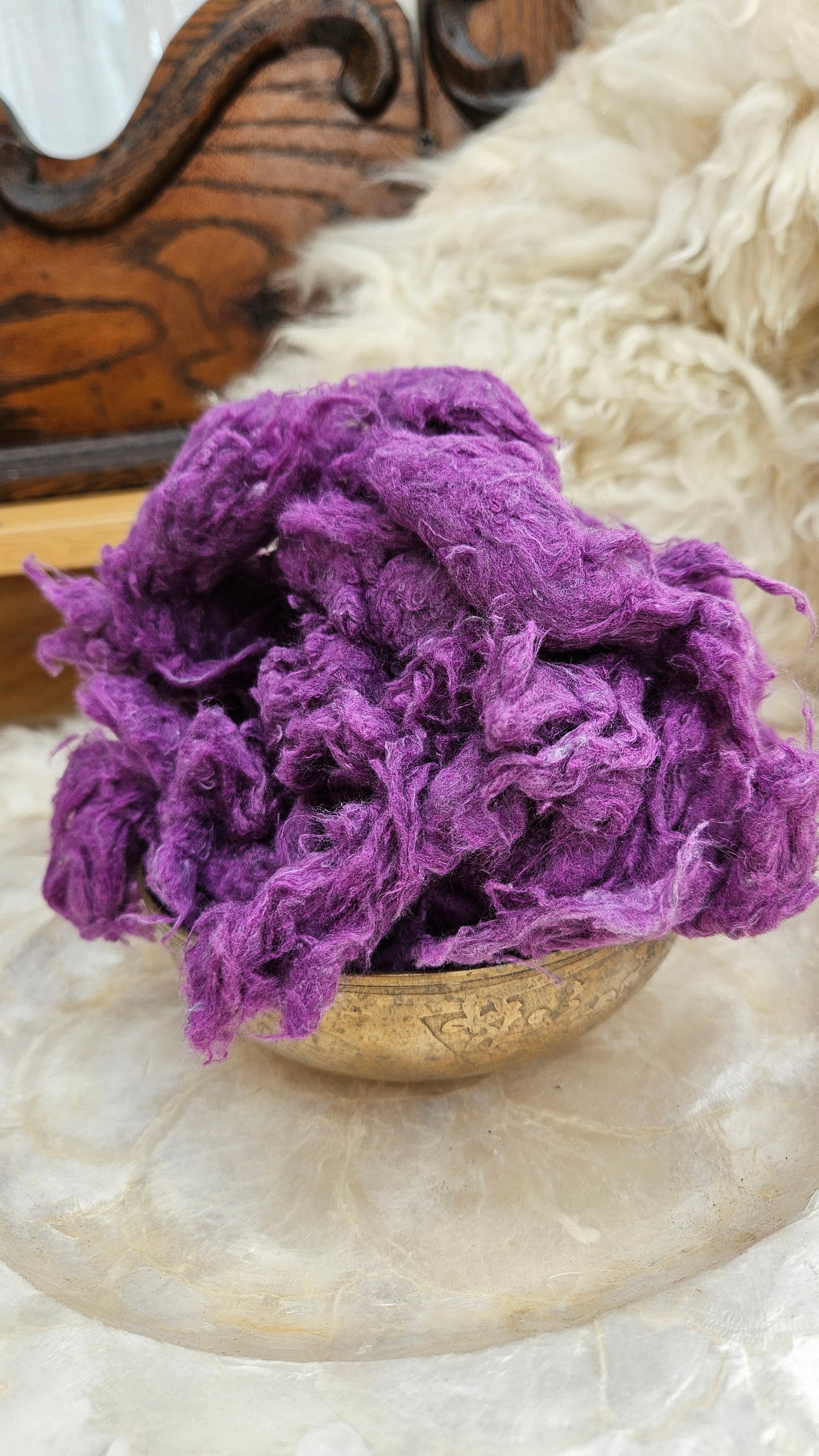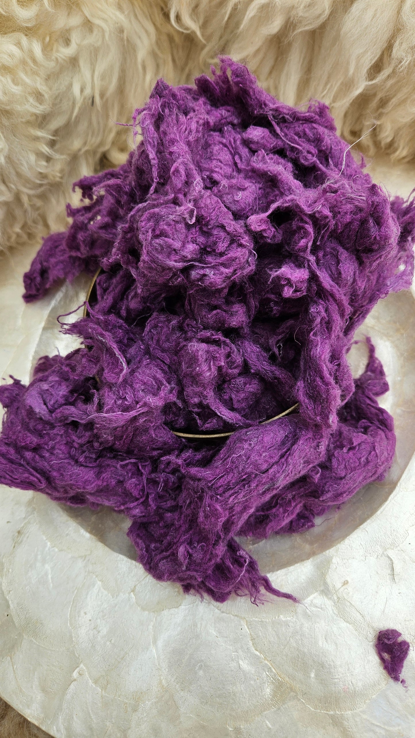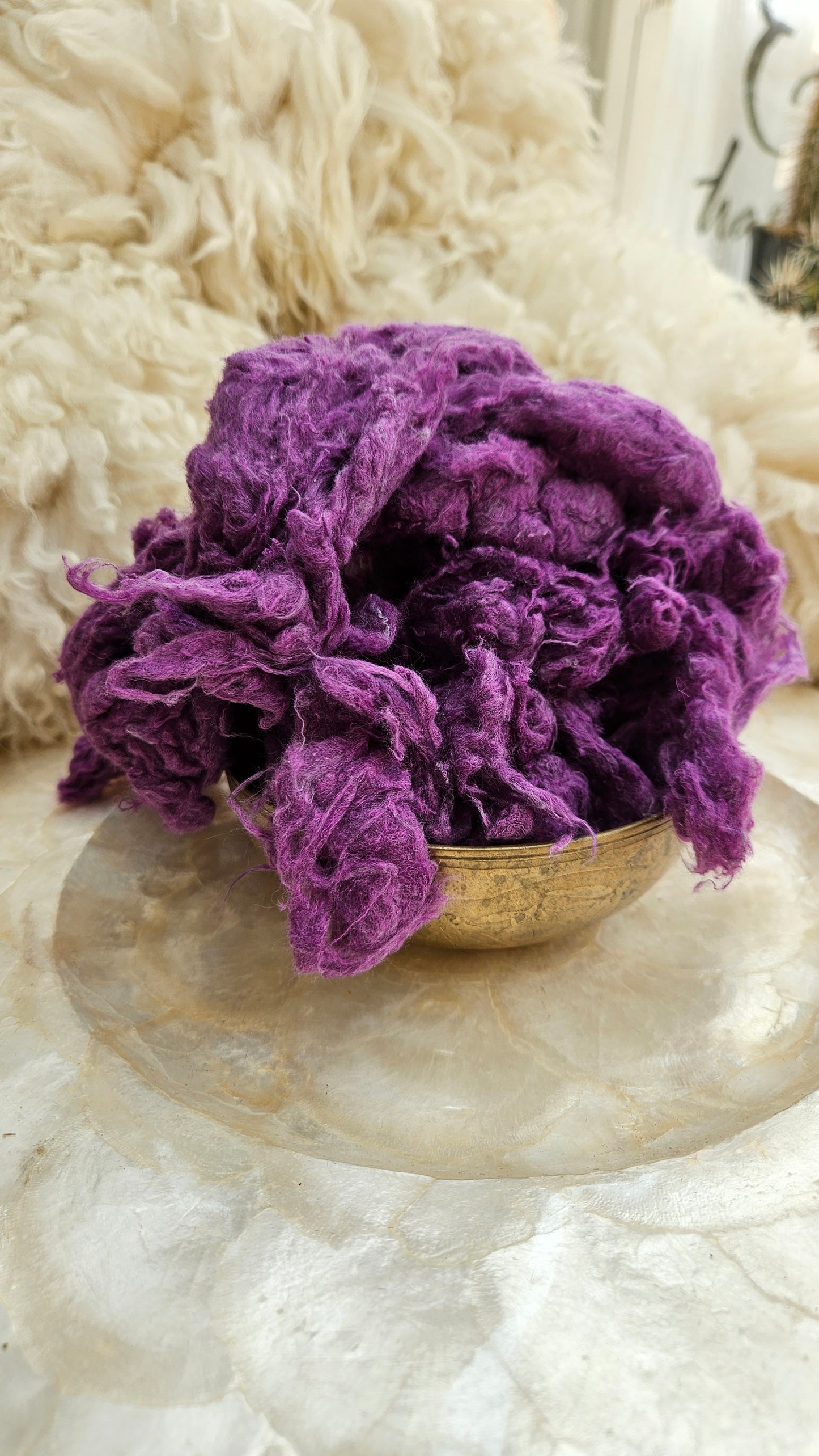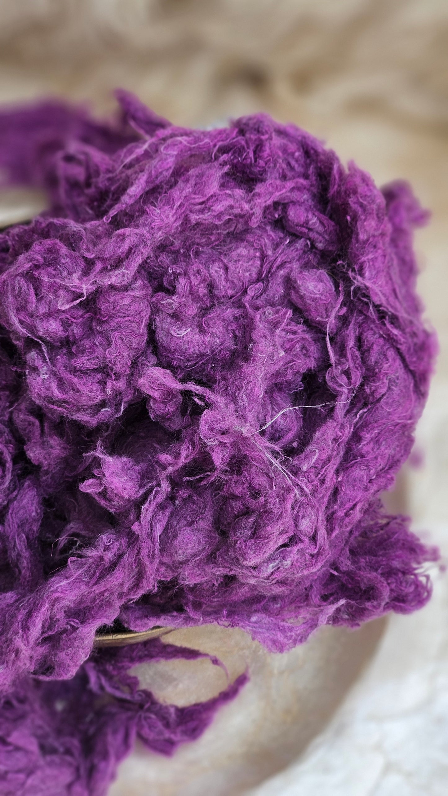 Recycled zero waste hand-dyed cotton noil that pulls apart like feathers and creates a hazy delightful tweed texture in art batts and rolags. Next to skin soft, dense, and textured with fine cut threads.