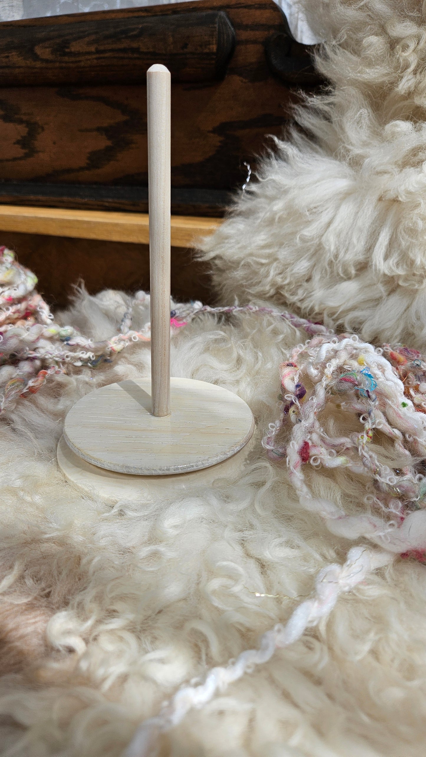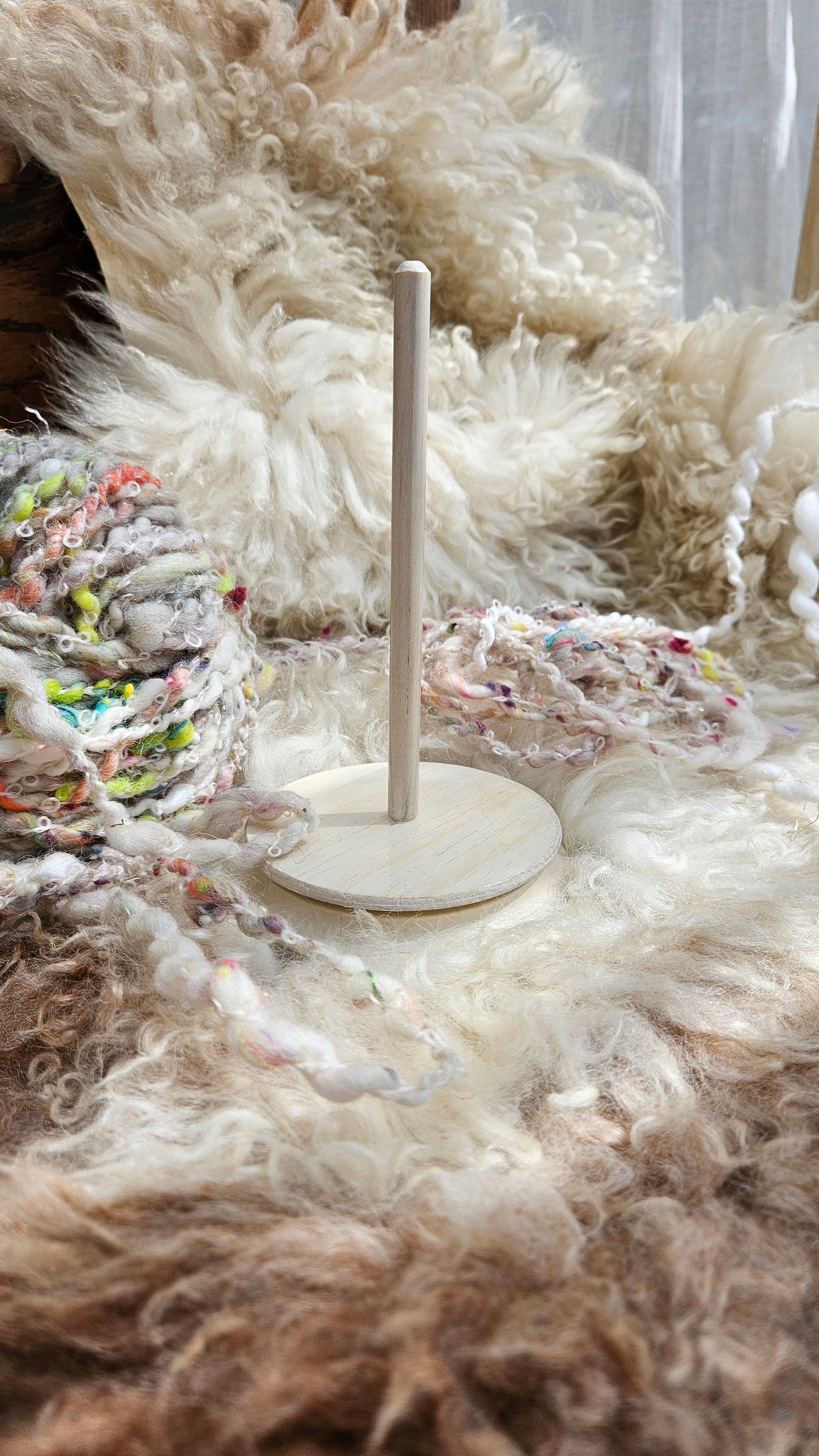 Completely handcrafted in wood and corian. Each is one of a kind. Designed for holding yarn cakes and center pull balls for knitting and crochet. Can be used to hold under 4 inch wide yarn cones for plying. Bearings for smooth payoff of yarn from ball or cone.